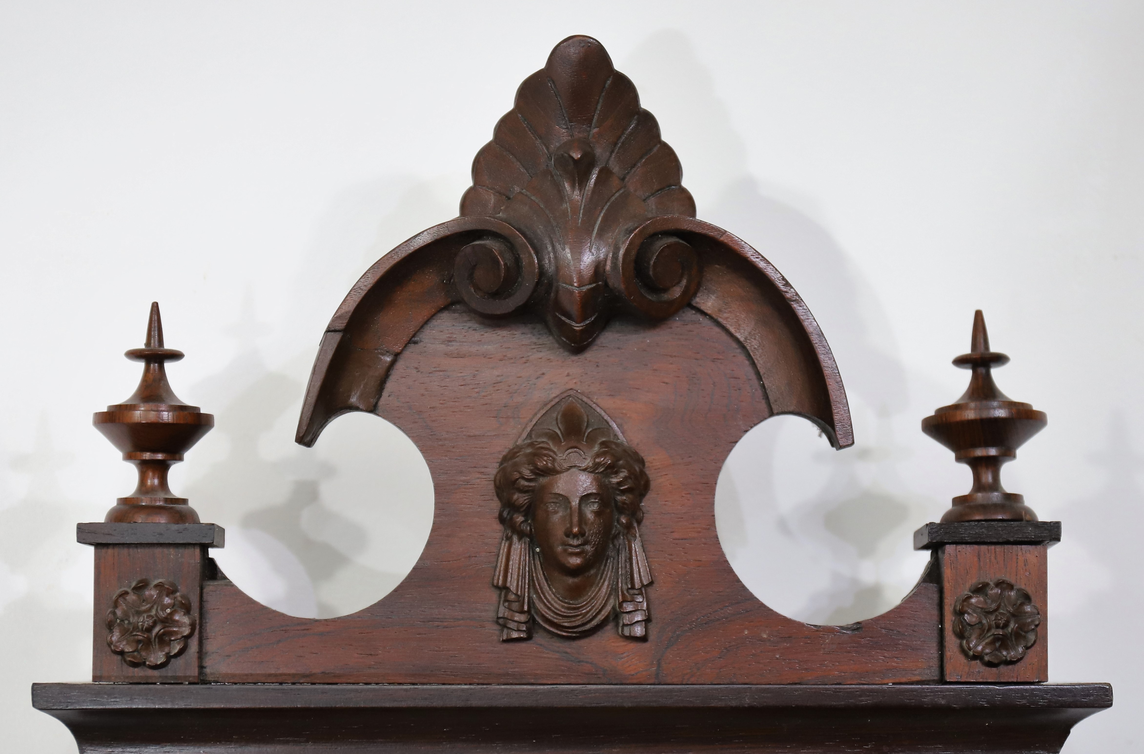 are pressed wood ornaments on the front edges, crest, and base; the five finials are well made but are not perfect matches to the