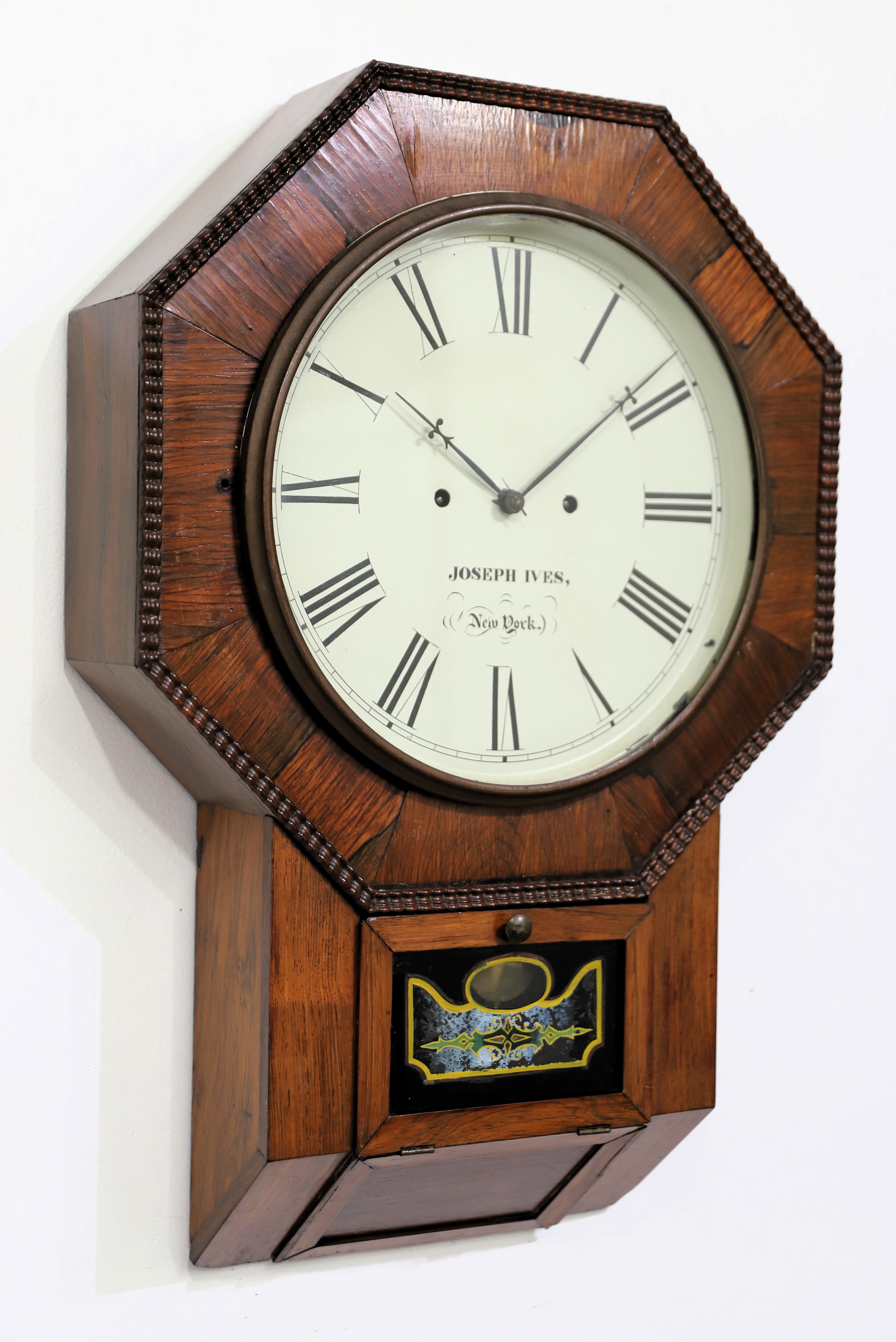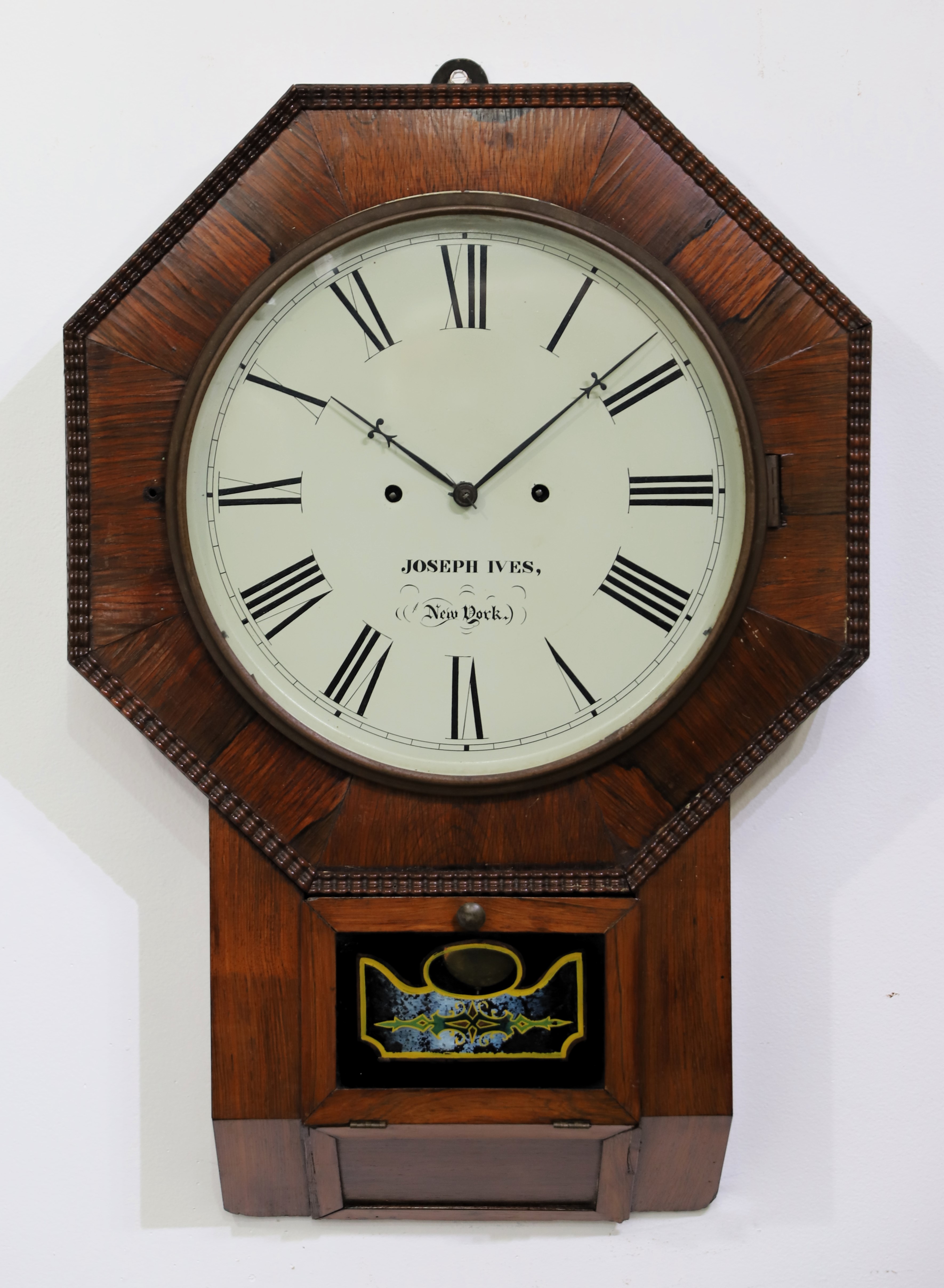 with two old glasses, the lower a slight variant of the style found in other clocks from this company and is likely original. The dial has been repainted and the Ives signature is inappropriate, as this clock was made and marketed by AW&Co; the hands are