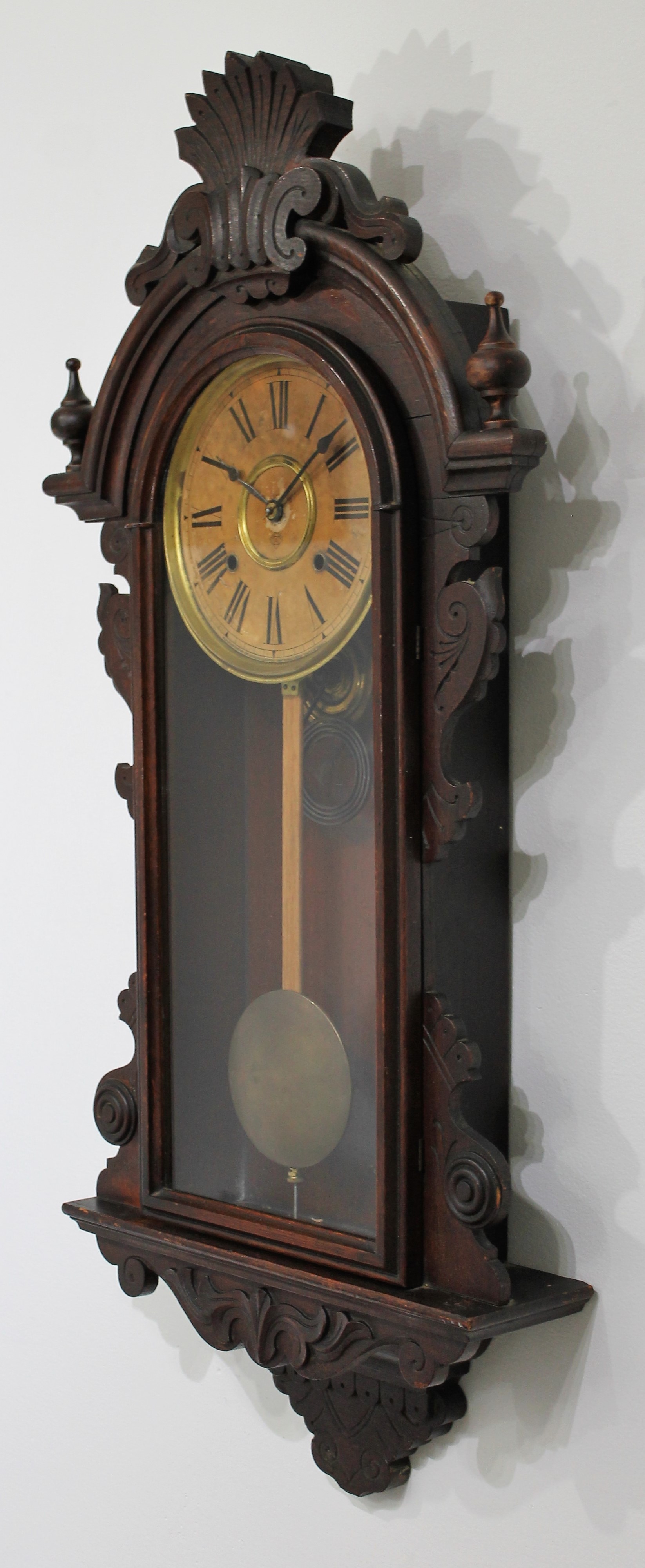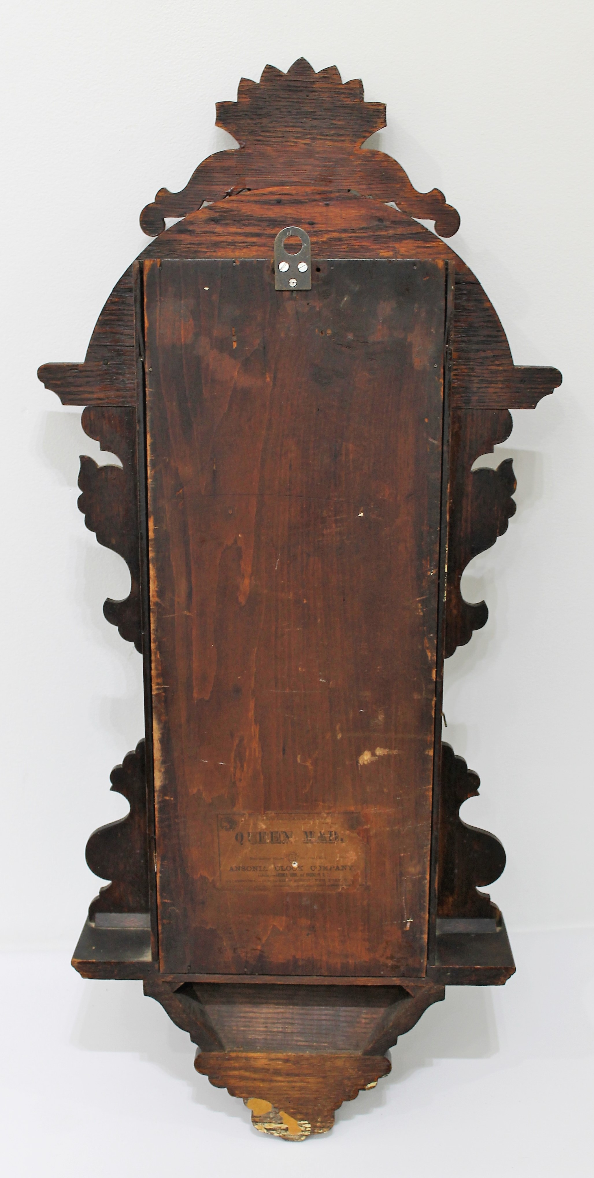 in the Ansonia Queens Office Clock series. The 35.5-inch walnut case has a very old finish with lots of patina and some alligatoring. The glass is old but not necessarily original. The paper dial with the Ansonia logo is very yellowed; the replacement hands