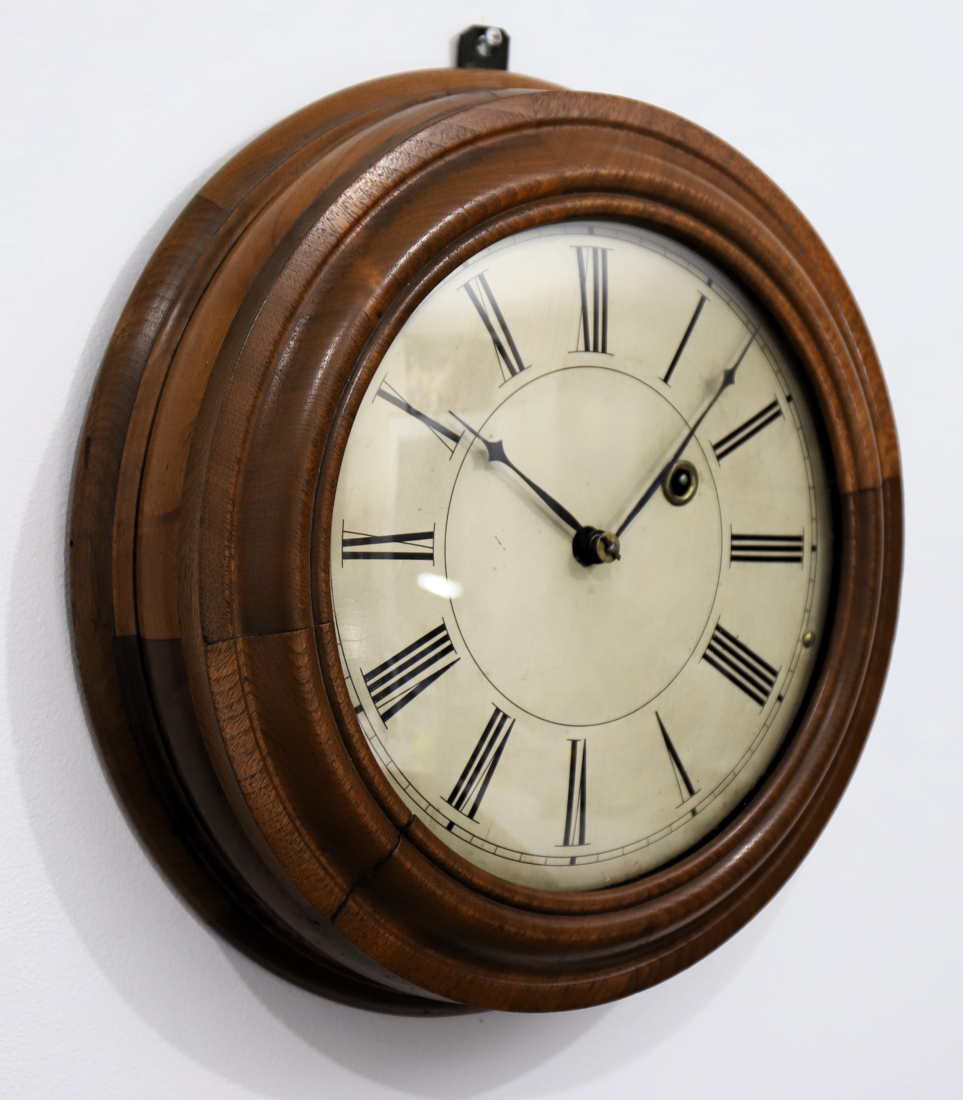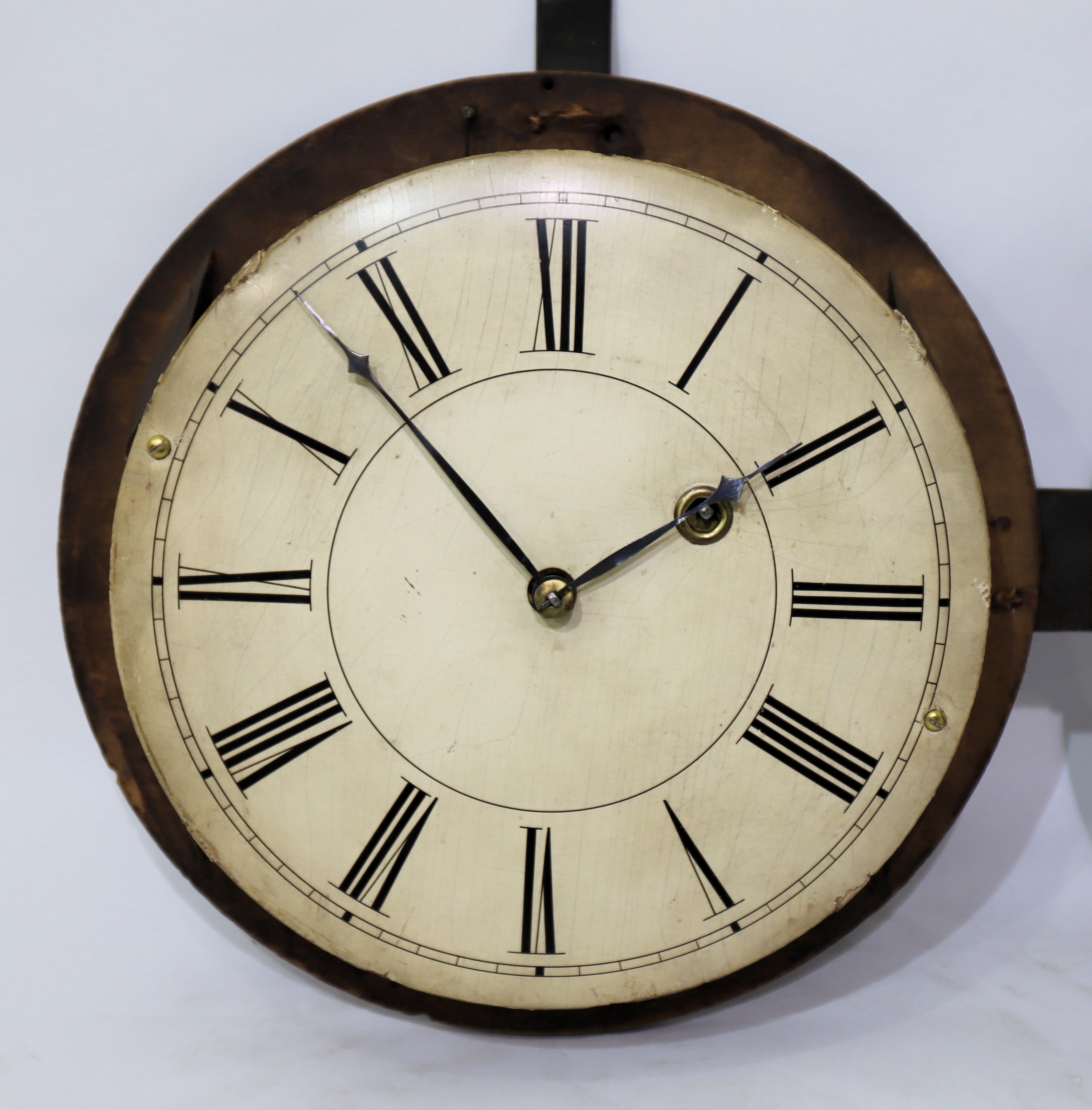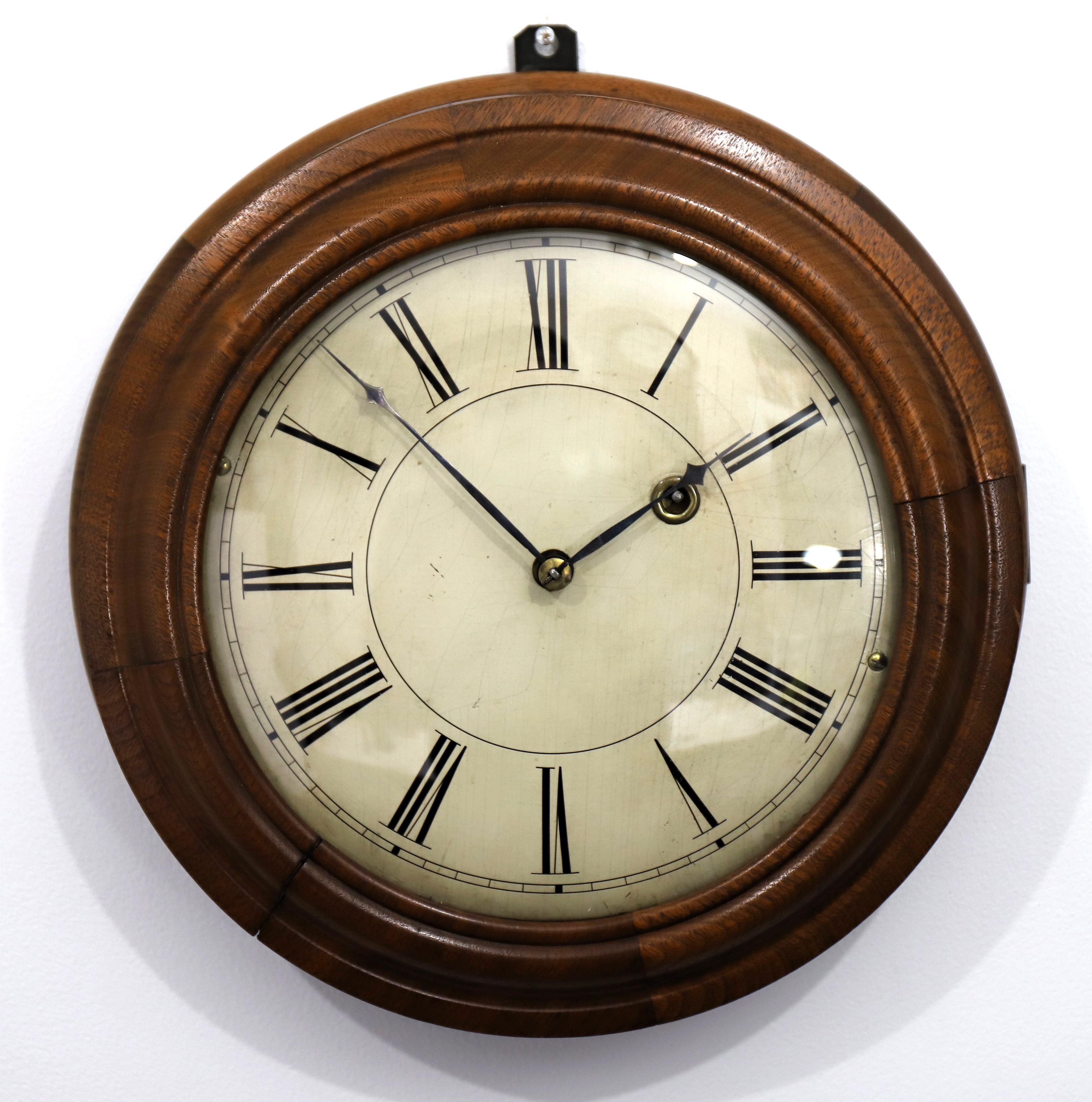 diameter), spring-driven pendulum clock. This uncommon clock came from the Anthony Sposato collection (tag on the back). The case is walnut, the glass, possibly a replacement (putty is newer), is domed. The dial is wood in good condition, the hands