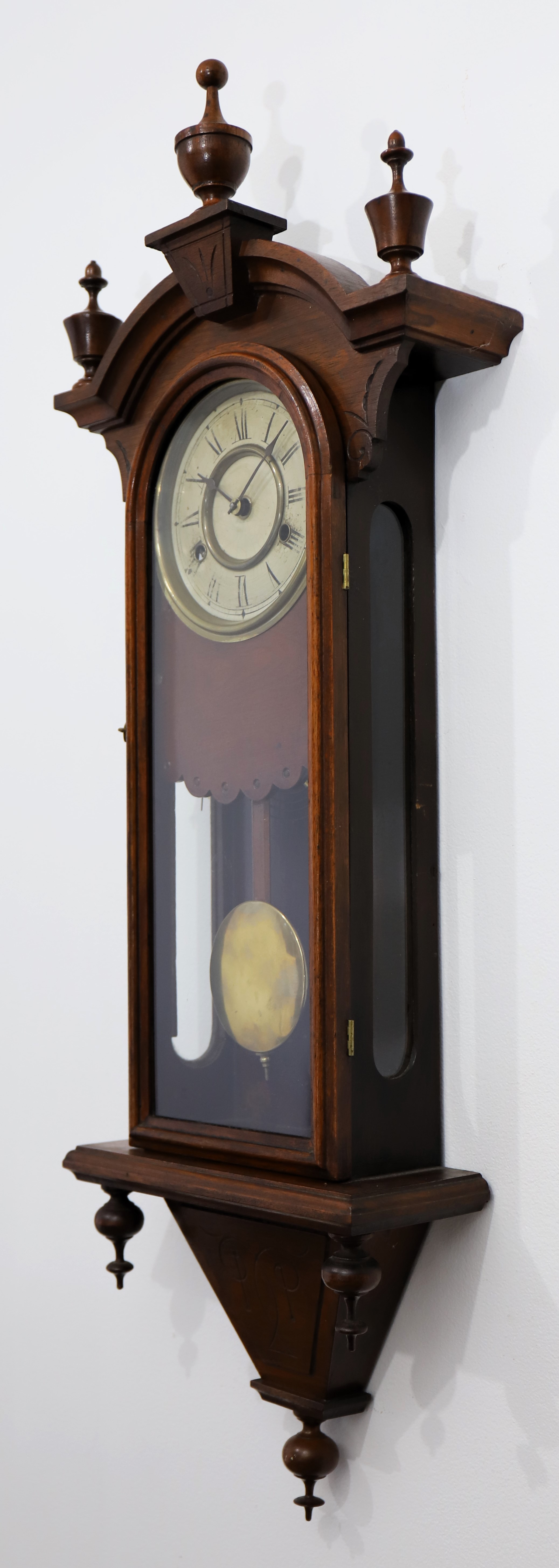 wall clock, 34 inches in length in walnut with an old finish; the six finials are as shown in the catalog illustration on page 154