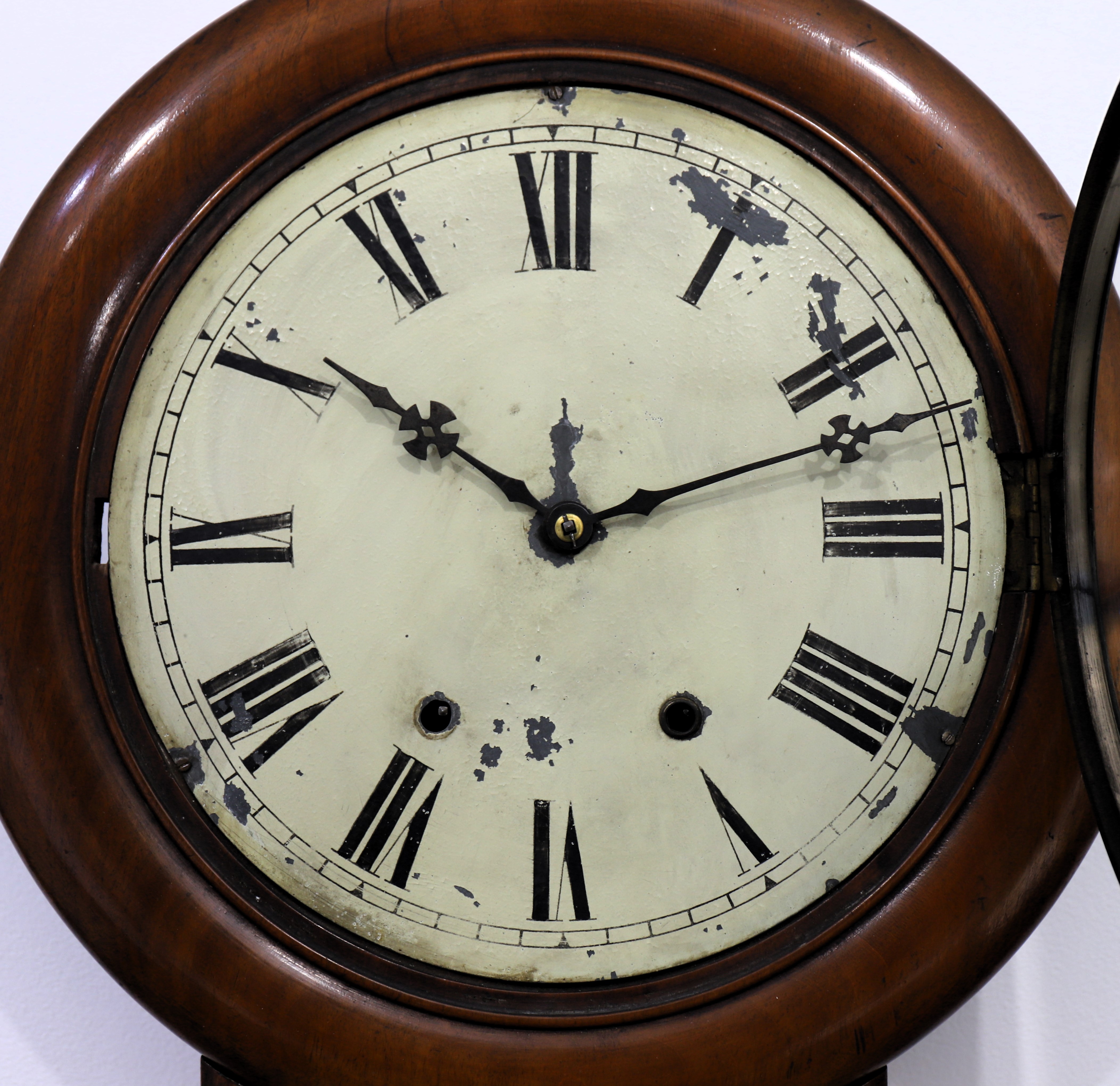 the movement. The 23-inch case is walnut with a nice finish, the dial is flaking and soiled, the hands are period, the glass