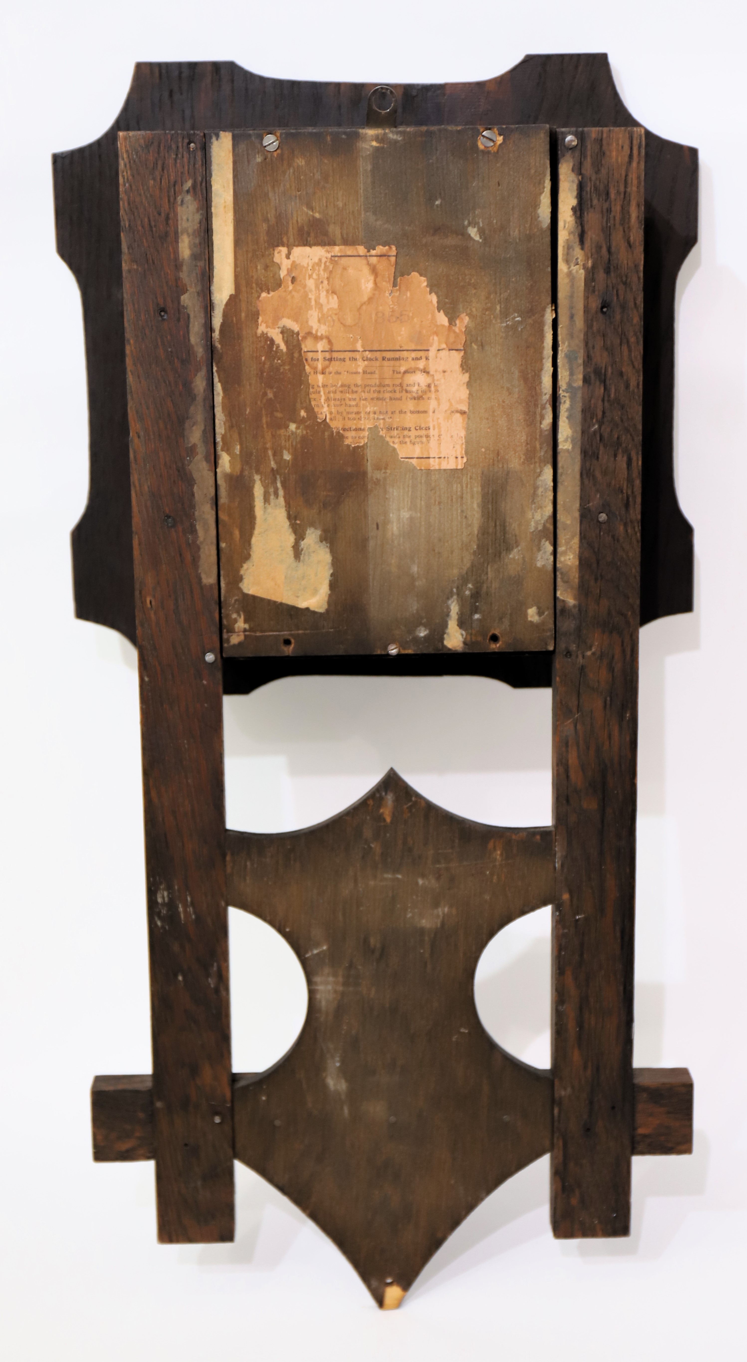 Mission-style wall clock, ca. 1910. The label on the back of this clock