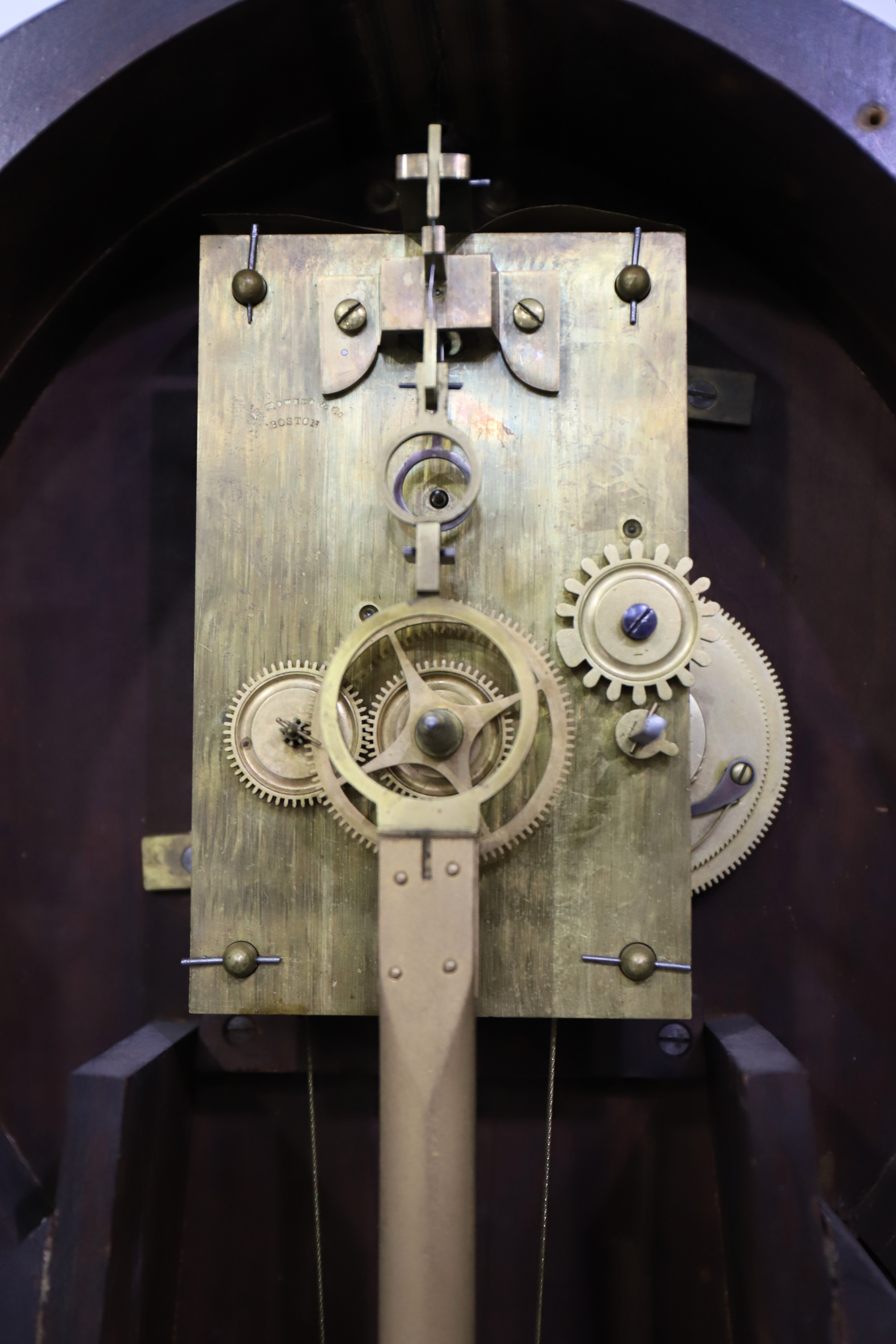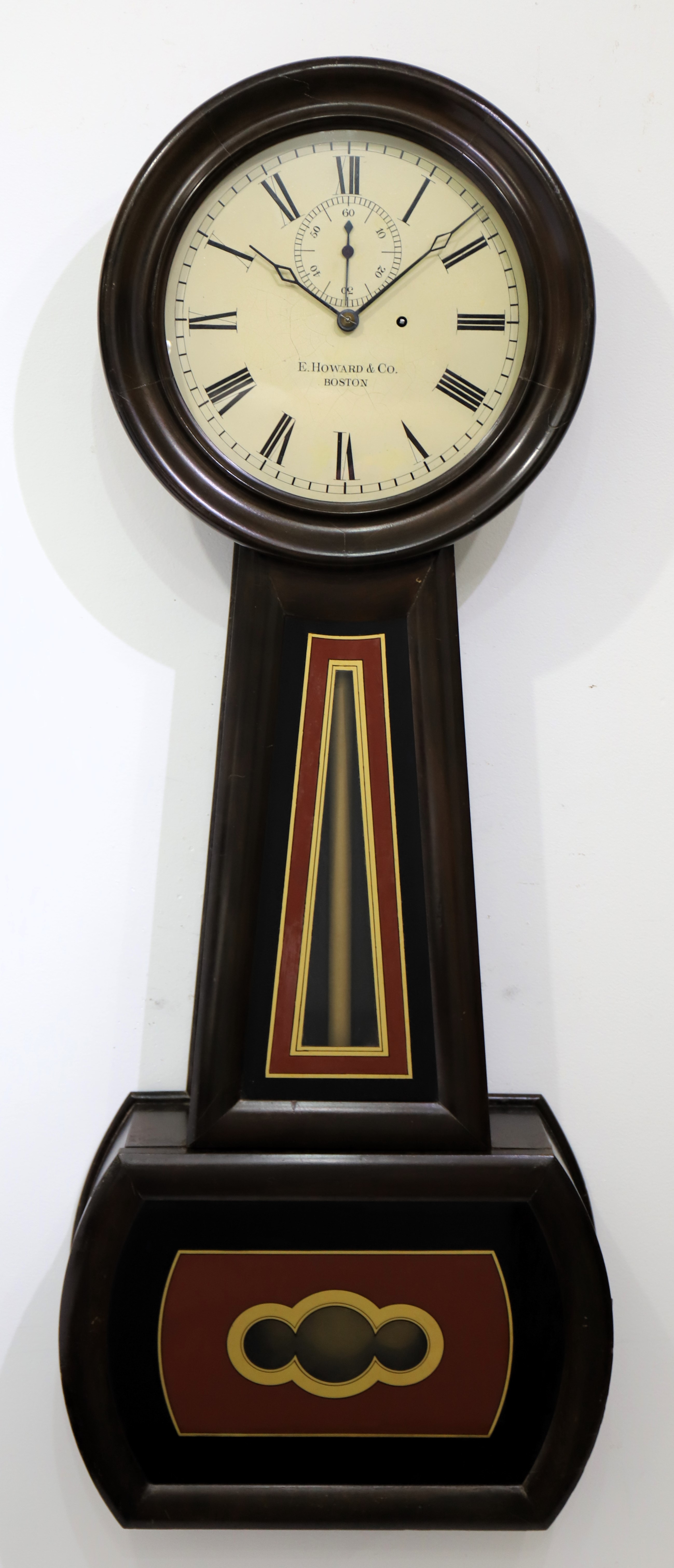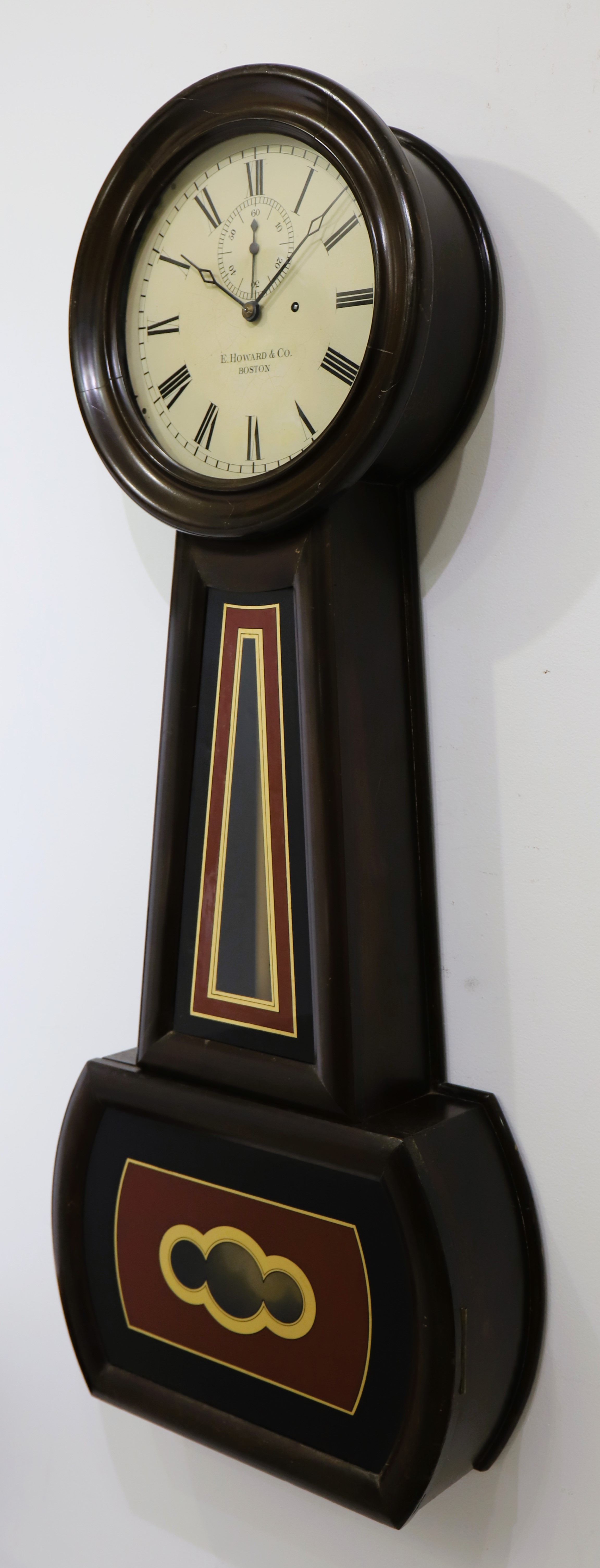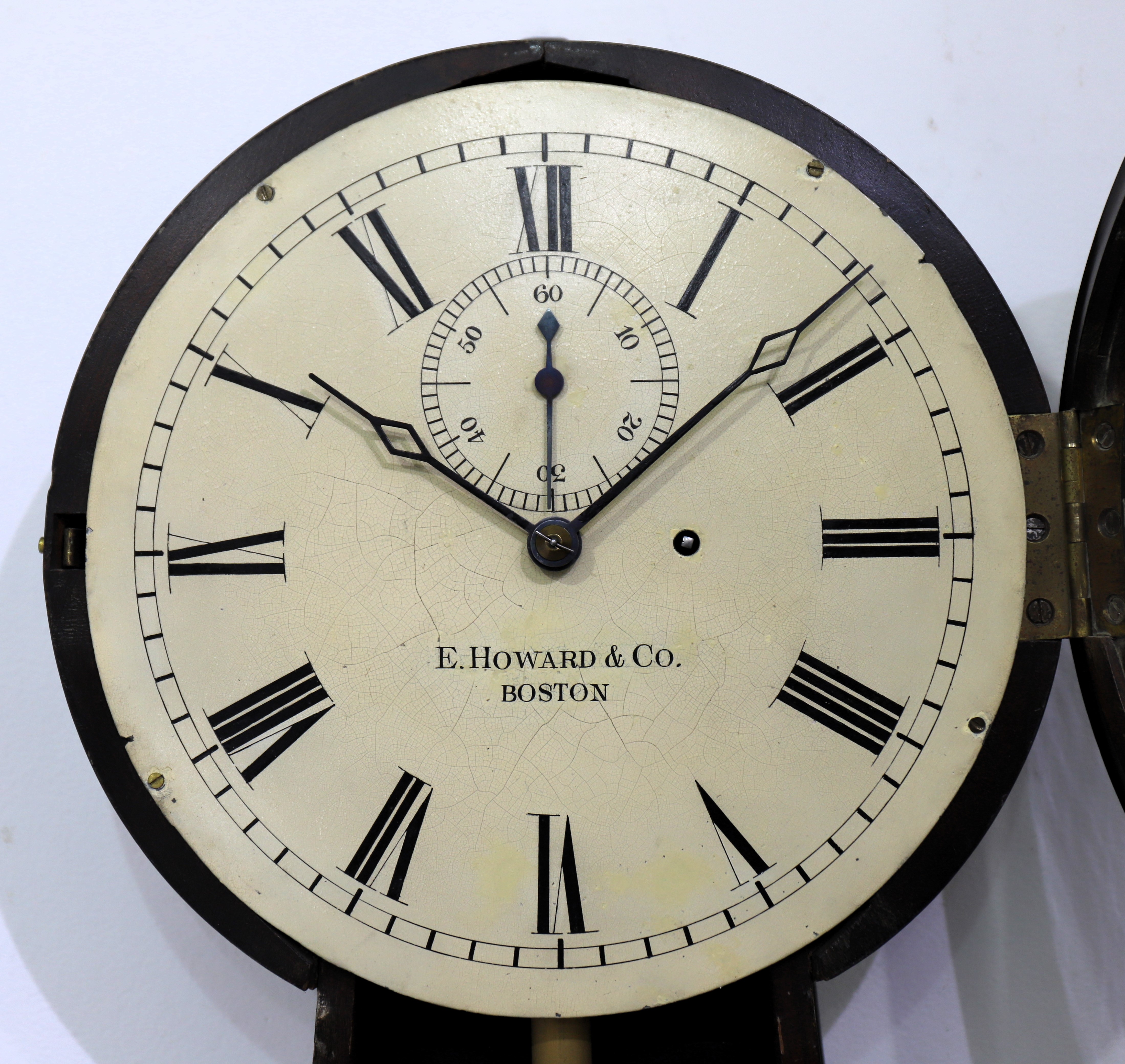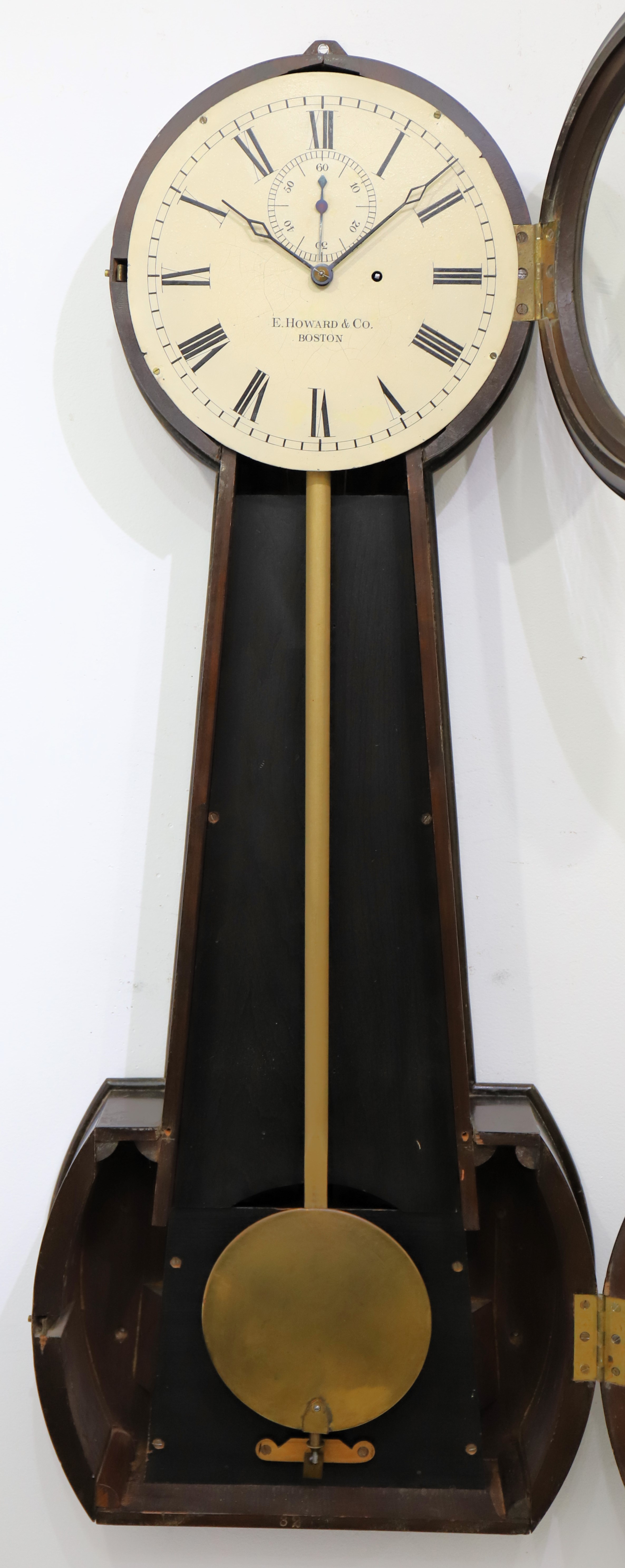 are original. The 8-day, time-only movement is signed and running without difficulty, driven by a Howard No. 1 cast iron weight
