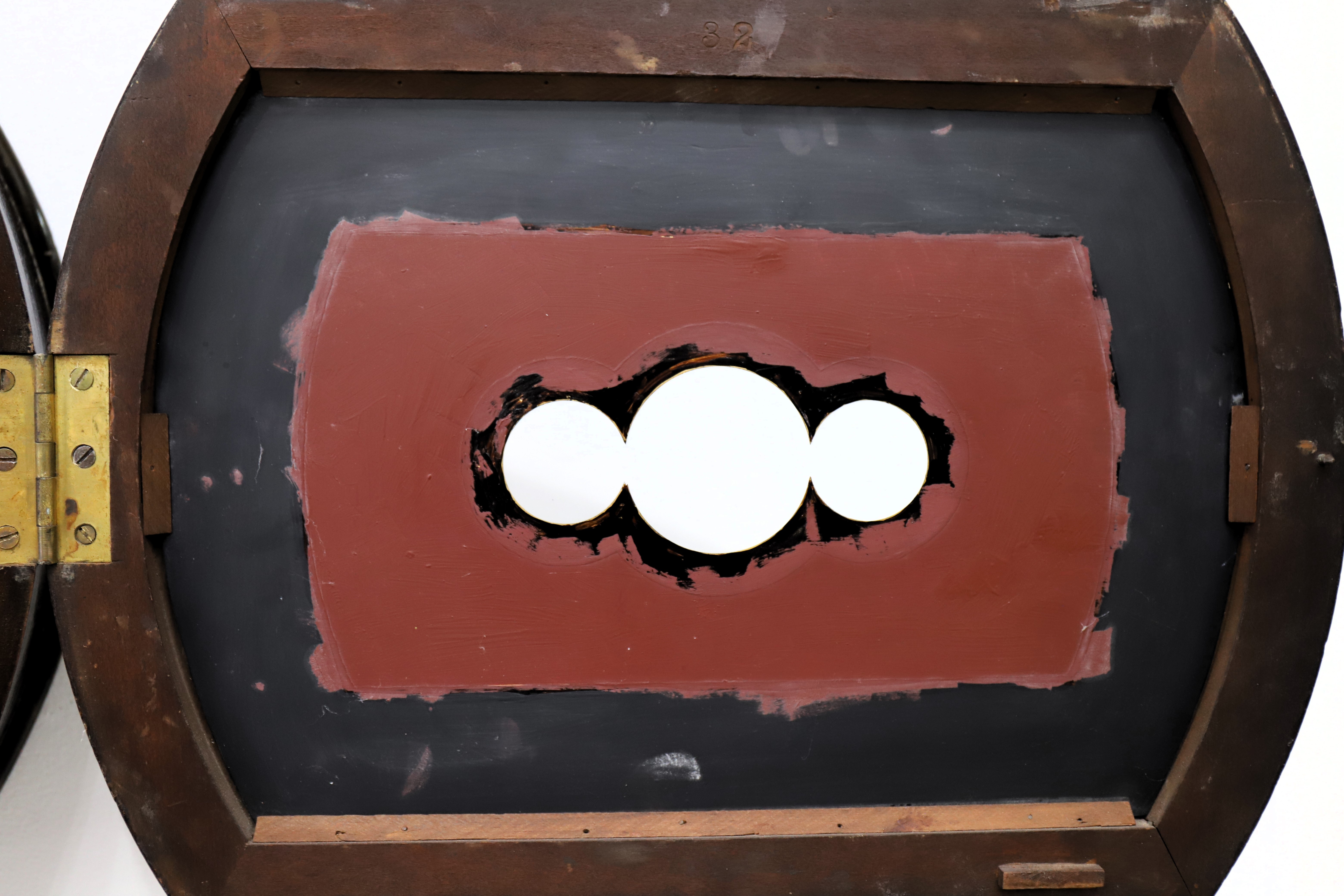 case with a very dark and old finish over rosewood graining. The case, lower door and bezel are stamped ‘32’; the three glasses