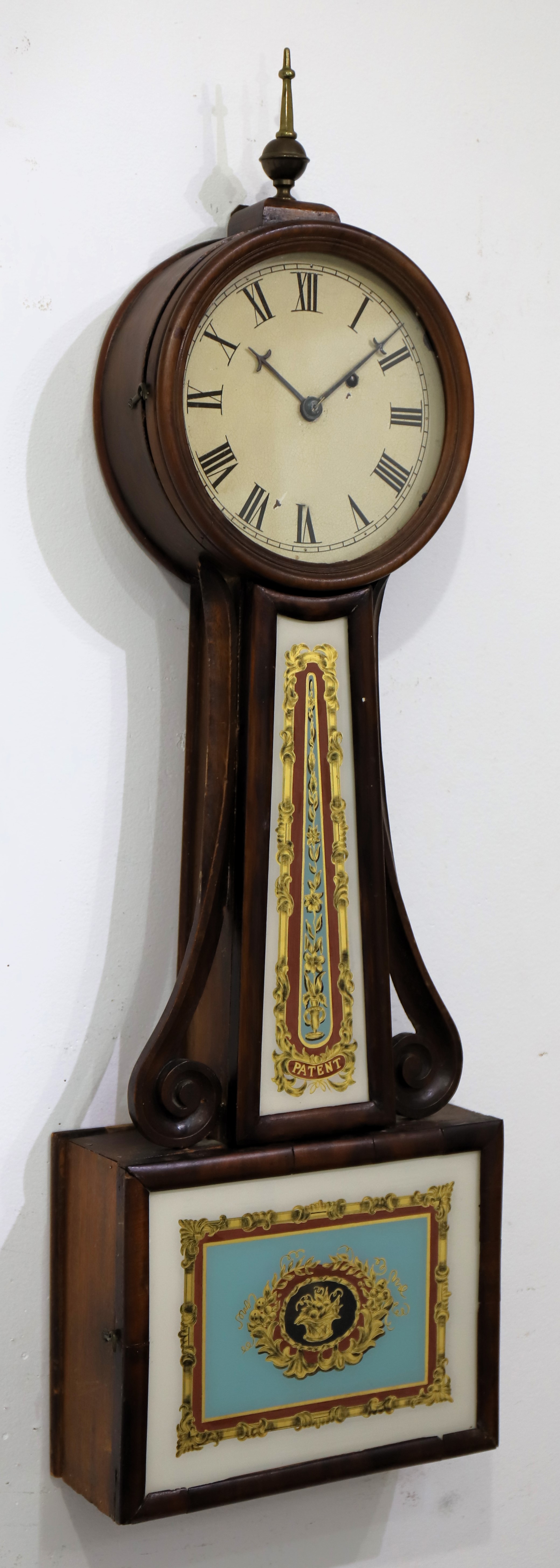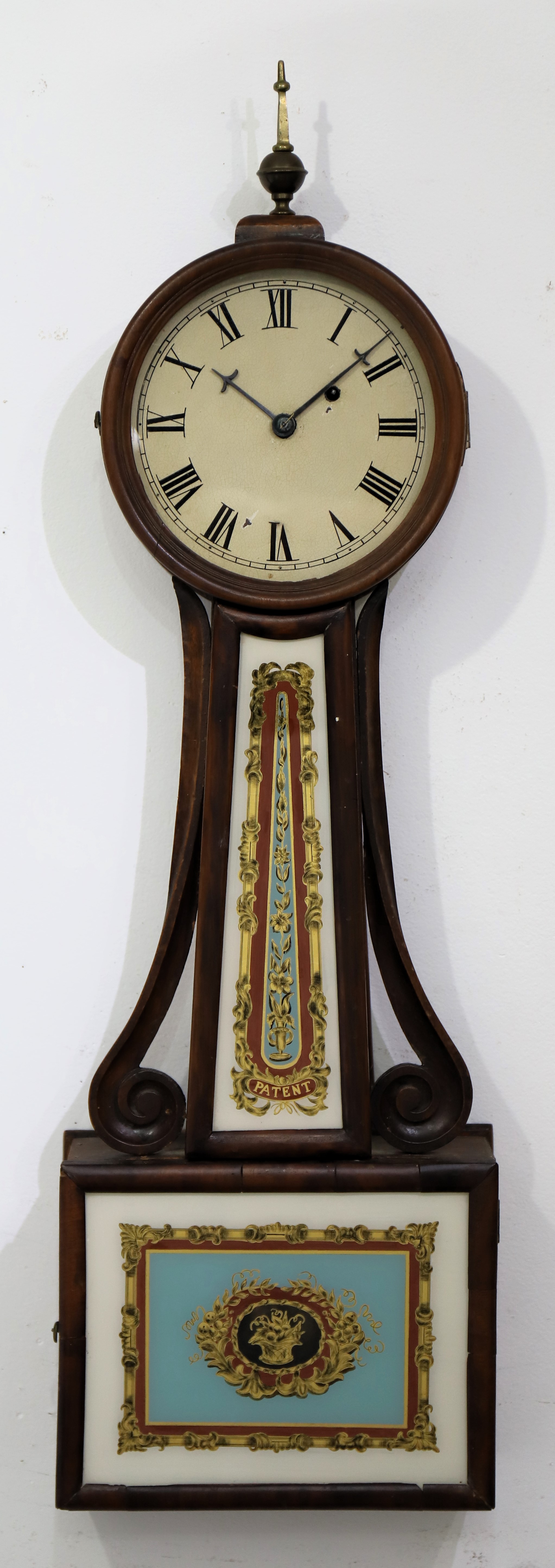 finial; the case is mahogany and mahogany veneer with two new repainted glasses and an older dial glass. There are wooden side