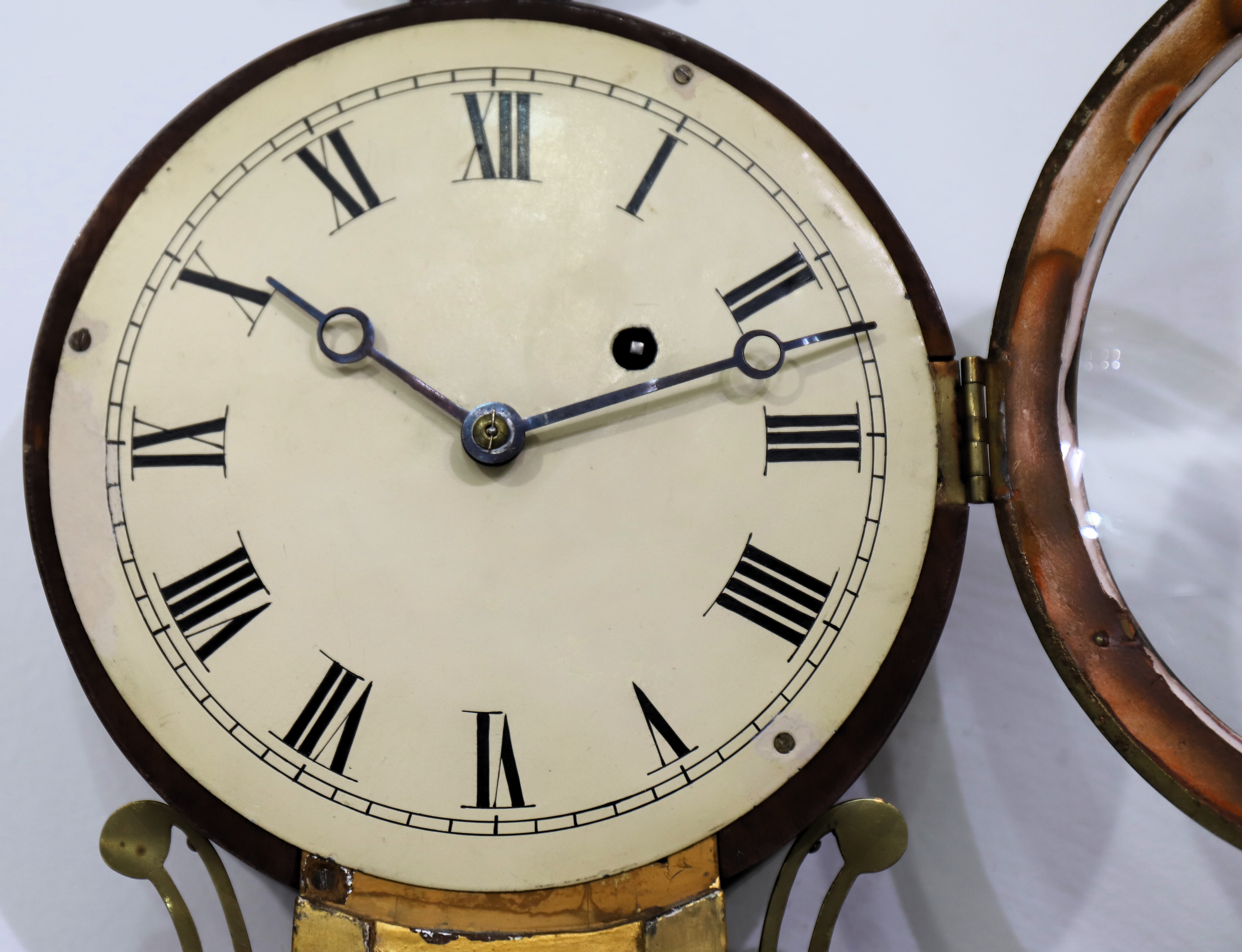 rope gilding on the front. The glasses are likely original and in excellent condition; the dial glass is convex. The painted