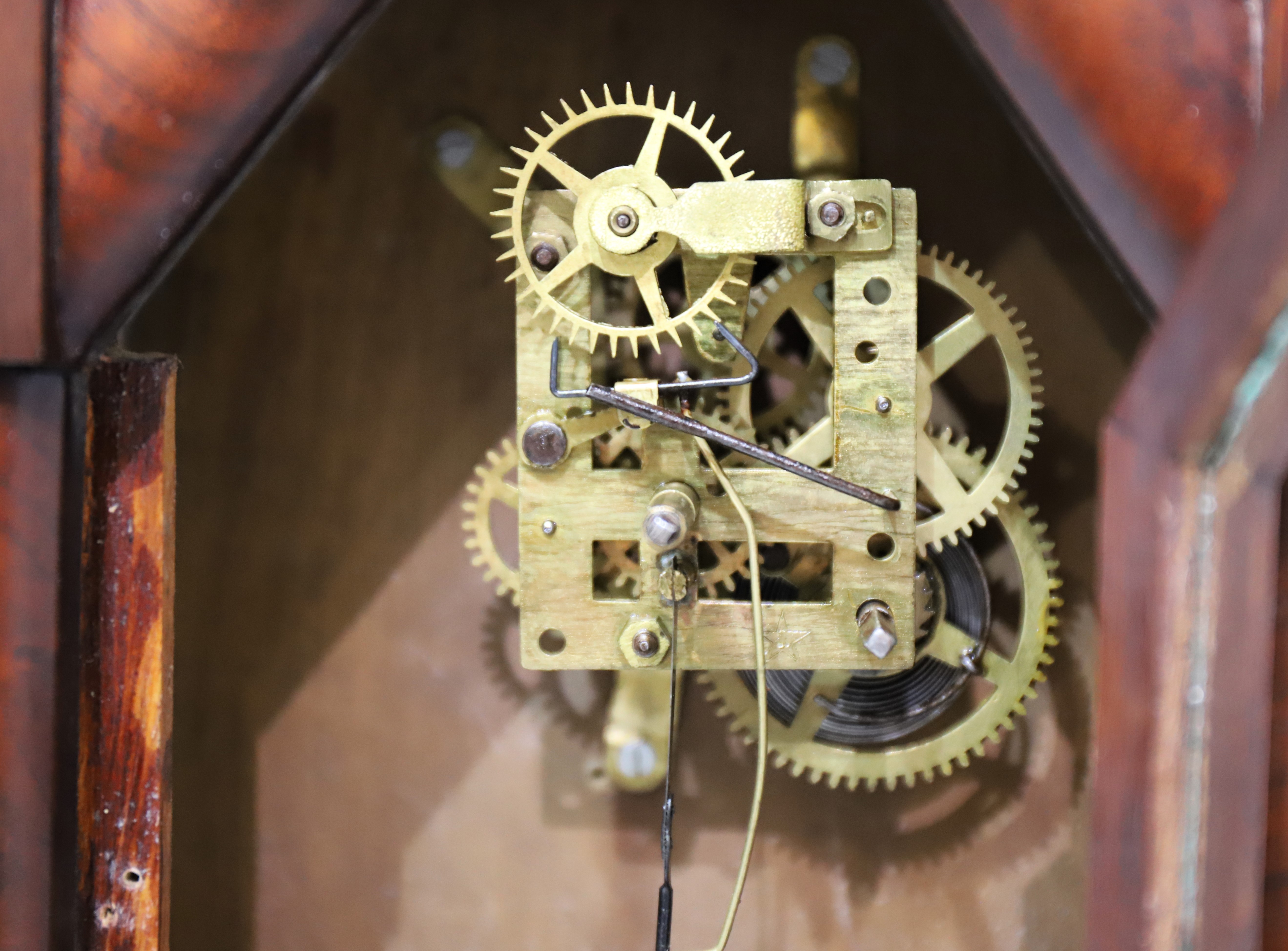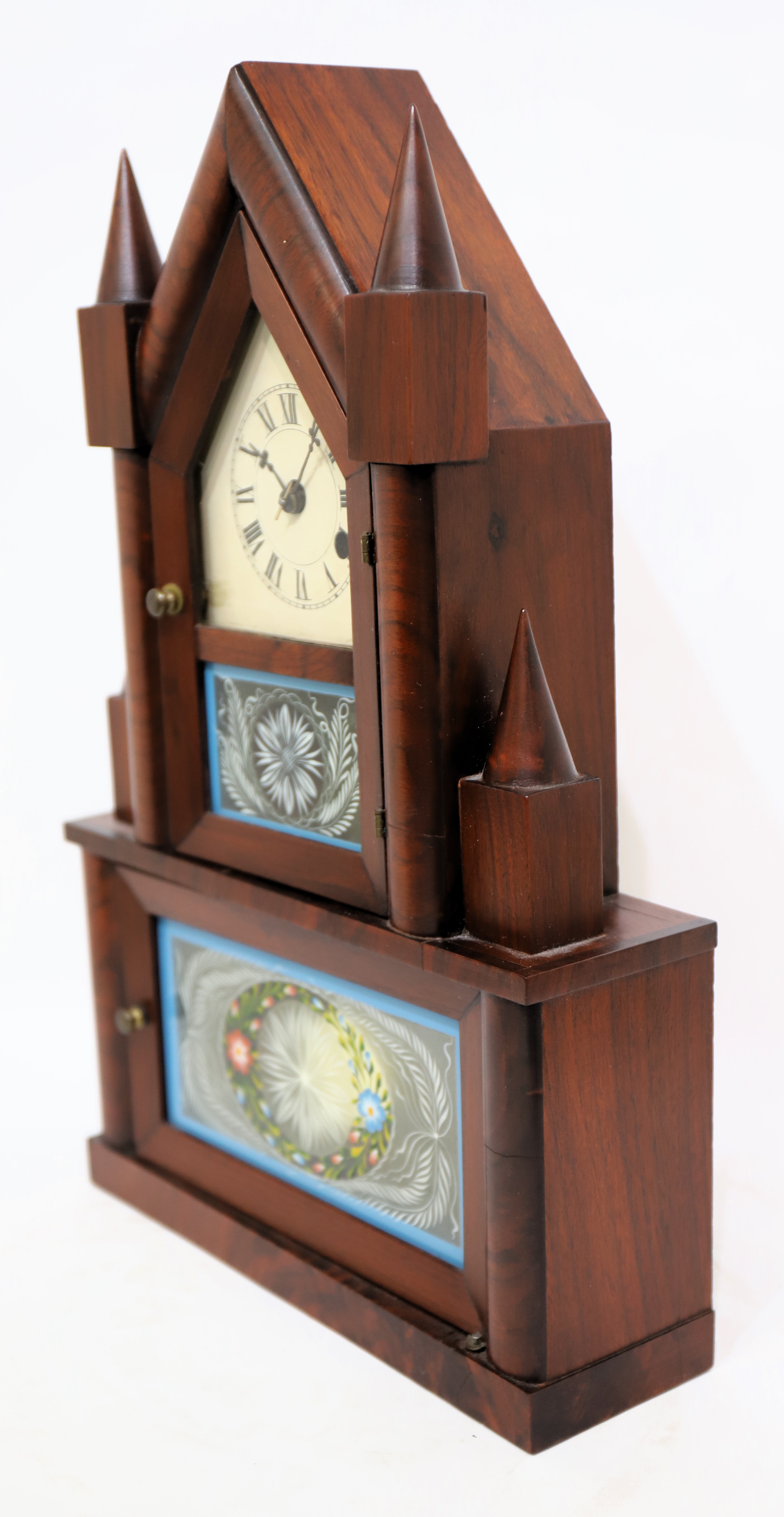 mahogany case is 17 inches tall with a beautiful finish. There are two appropriate glasses and a painted dial with appropriate