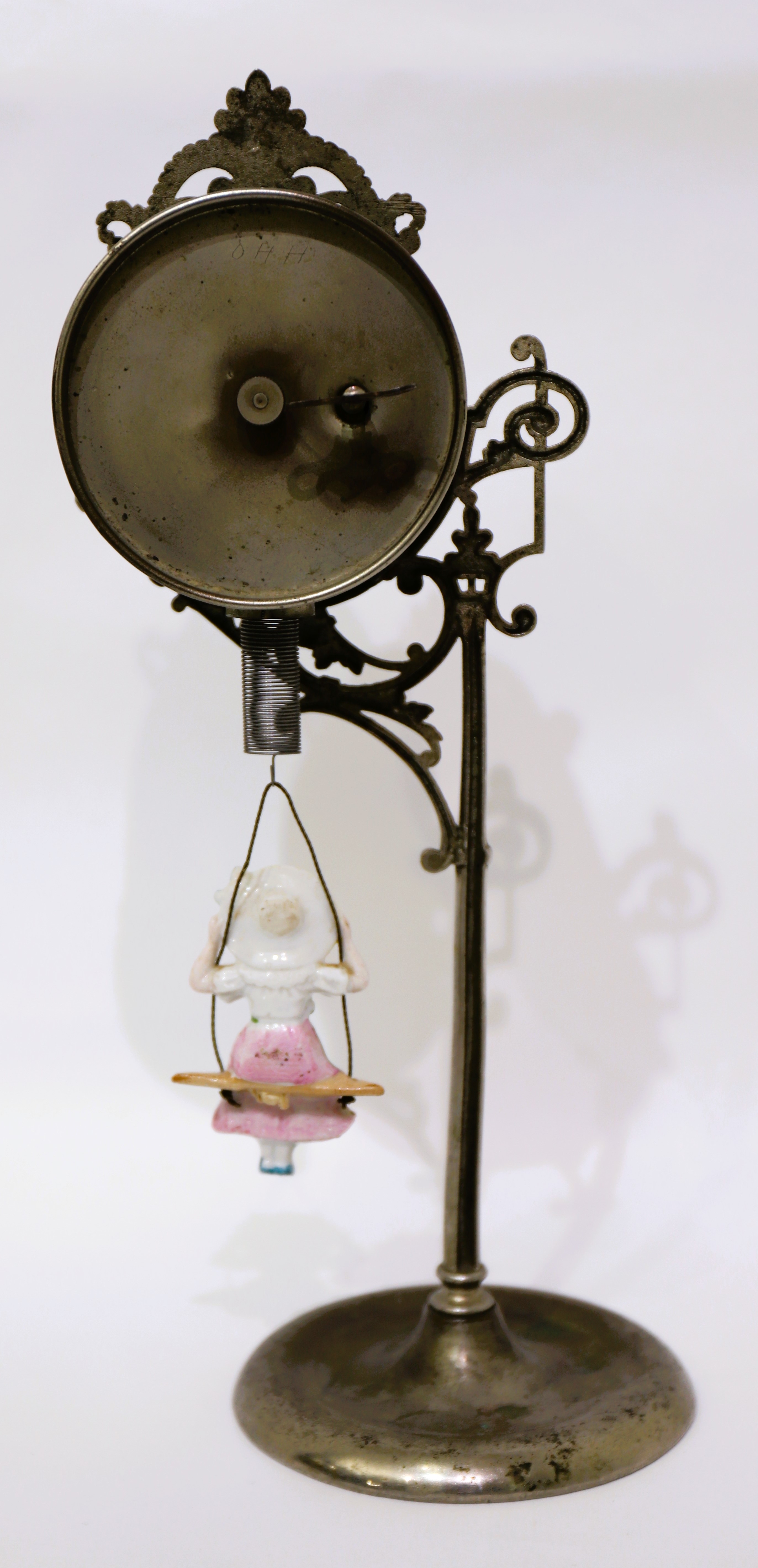 of “Jumpers” and this is perhaps the most common. The tarnished nickel stand is 15.5 inches tall and the base is badly oxidized. Metal polish may help. The signed paper dial is stained, the hands are replacements. The porcelain doll is period but