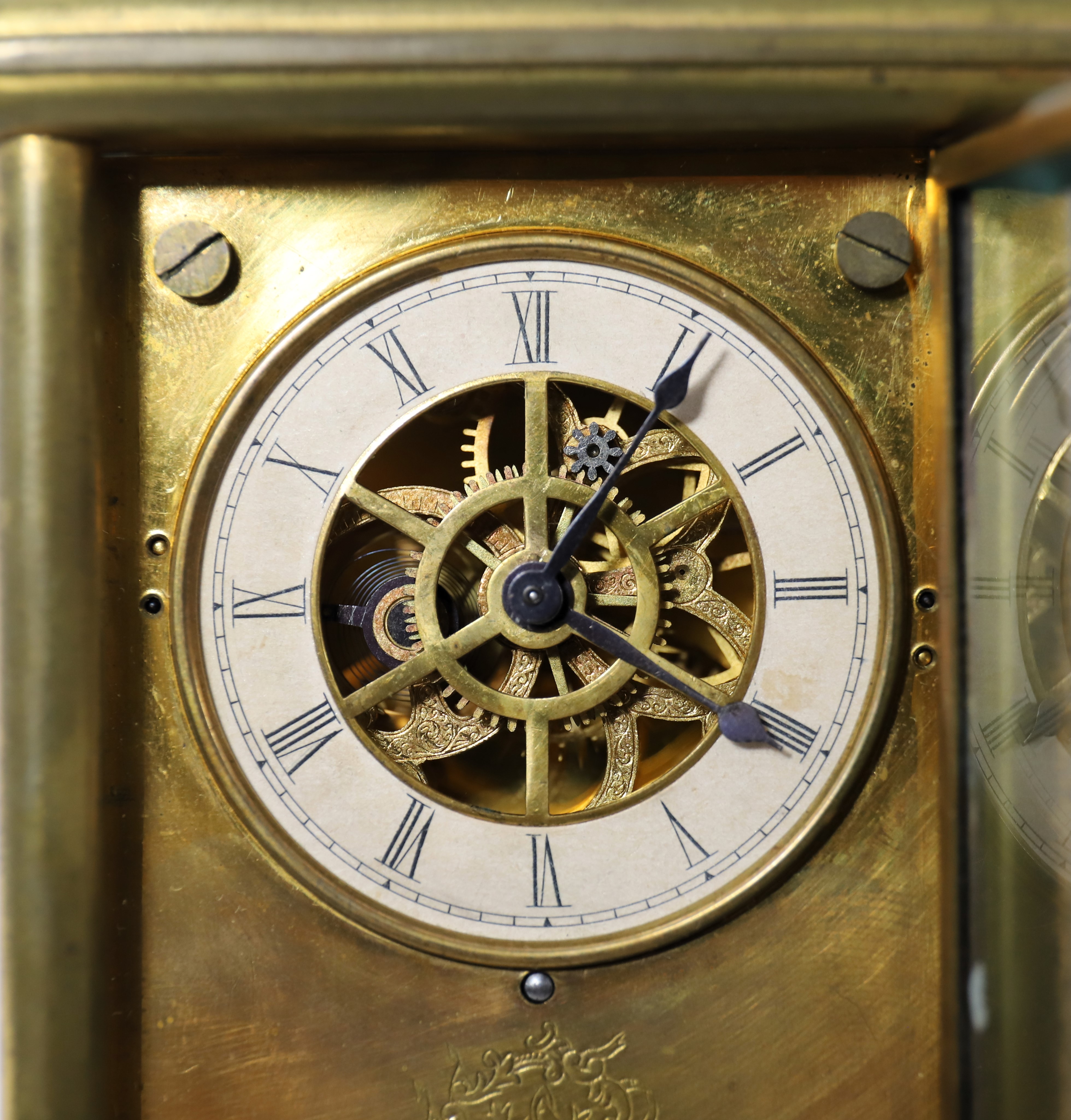 dull brass case; there are three beveled glasses with a front door over a skeletonized dial; the visible gears are embossed. There is a lot of detail here. It winds in the back, probably one day; I guess you set the hands from the front. It is