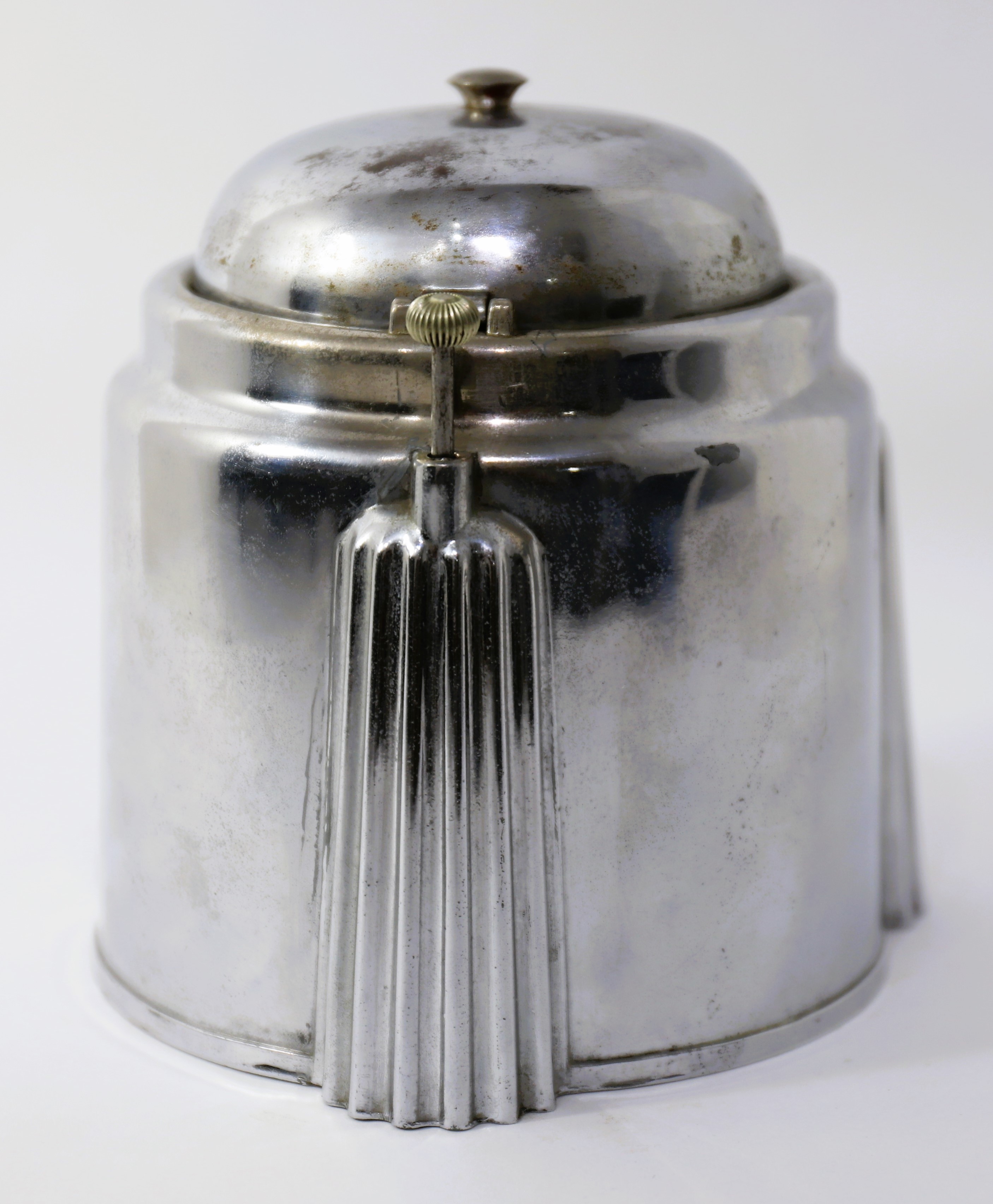 is no maker label or die stamp anywhere to be found on this 1950’s high-style clock, but the patent numbers under the cover all point