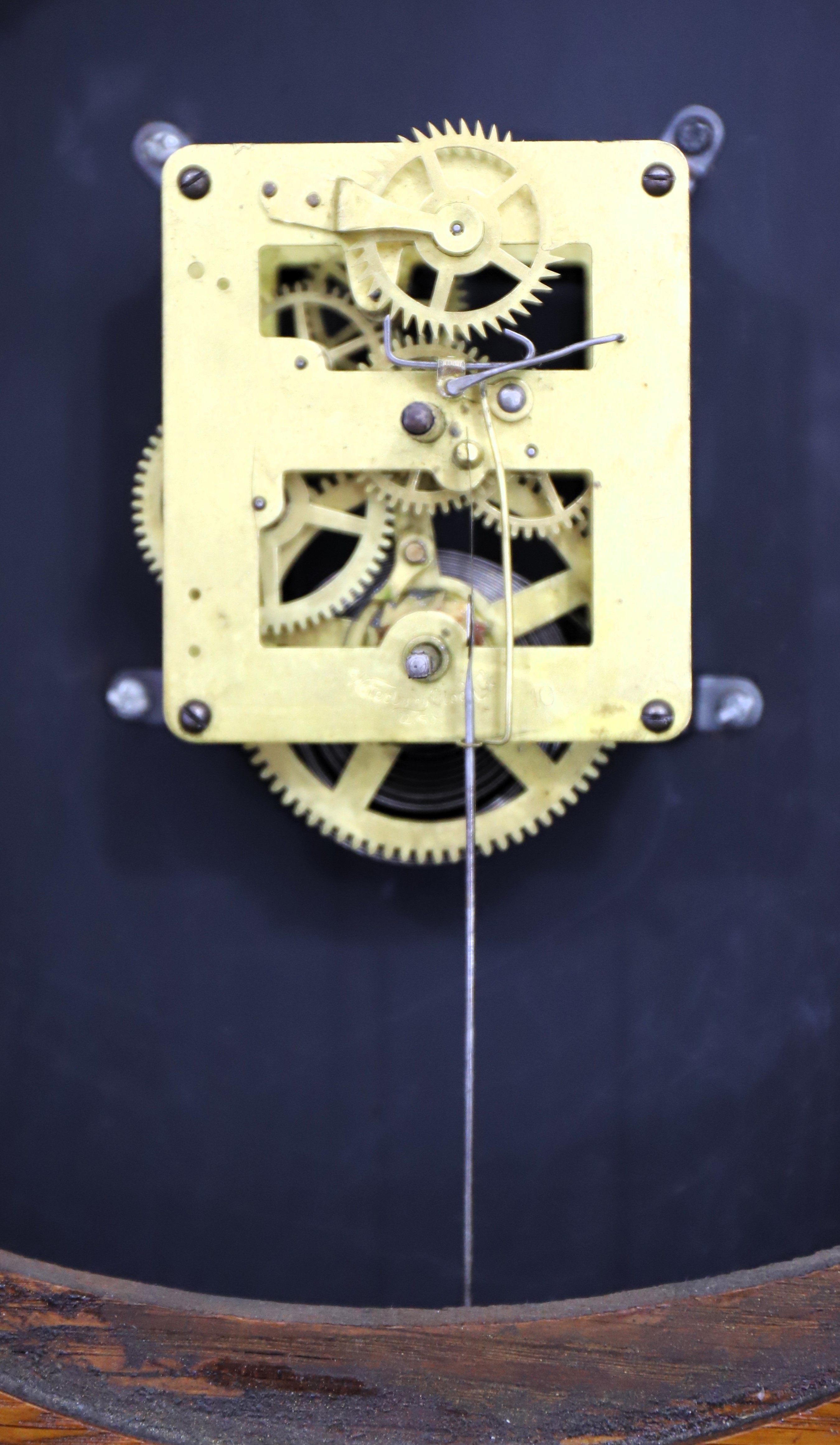 oak case with an old finish. Both glasses are old, the signed dial holds the original paint, soiled, with the name of a jeweler