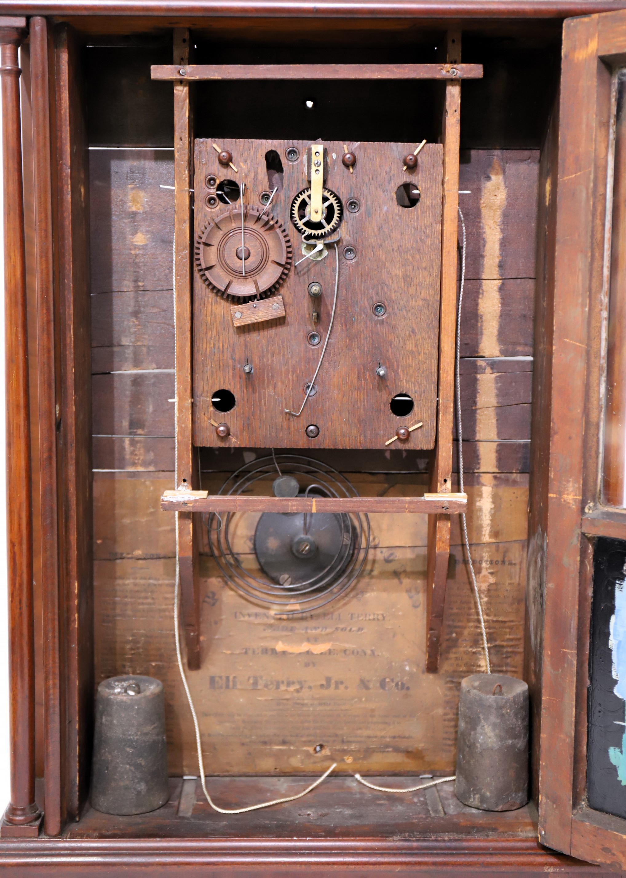 they added a movement mount from their stock of later wooden movement clocks, and also substituted in their labeled backboard; the