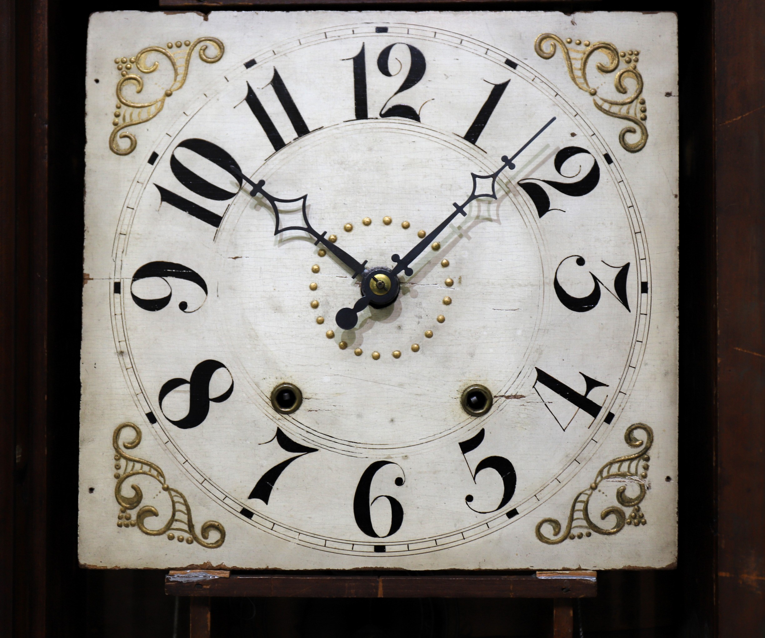 in good shape with strong numbering, the hands are period and appropriate. The wooden 30-hour time-and-strike movement is untested,
