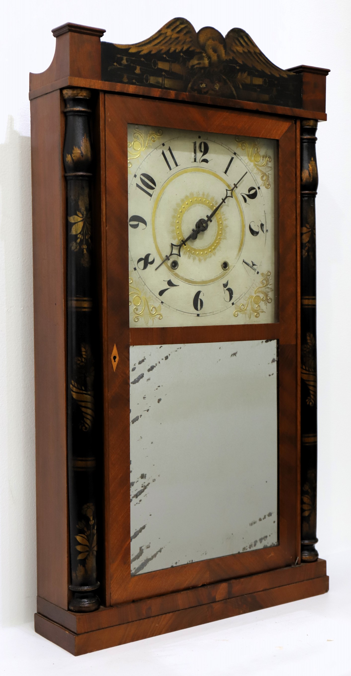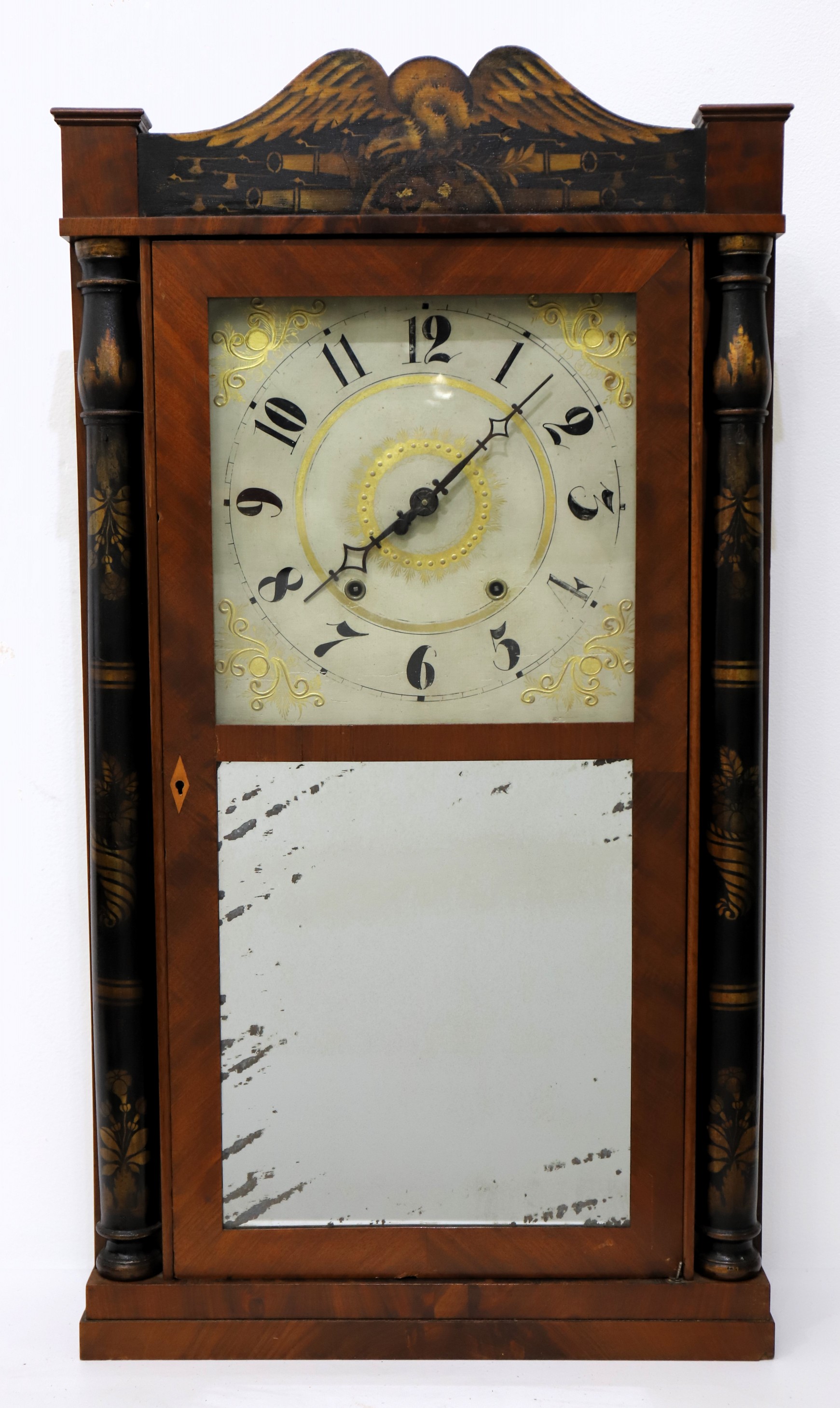 not common. The case is 33 inches tall with good mahogany veneer and good bronze stenciling on the columns and splat. The dial glass is original, the mirror old/original, but the backing has been replaced. The dial is a bit soiled, the hands