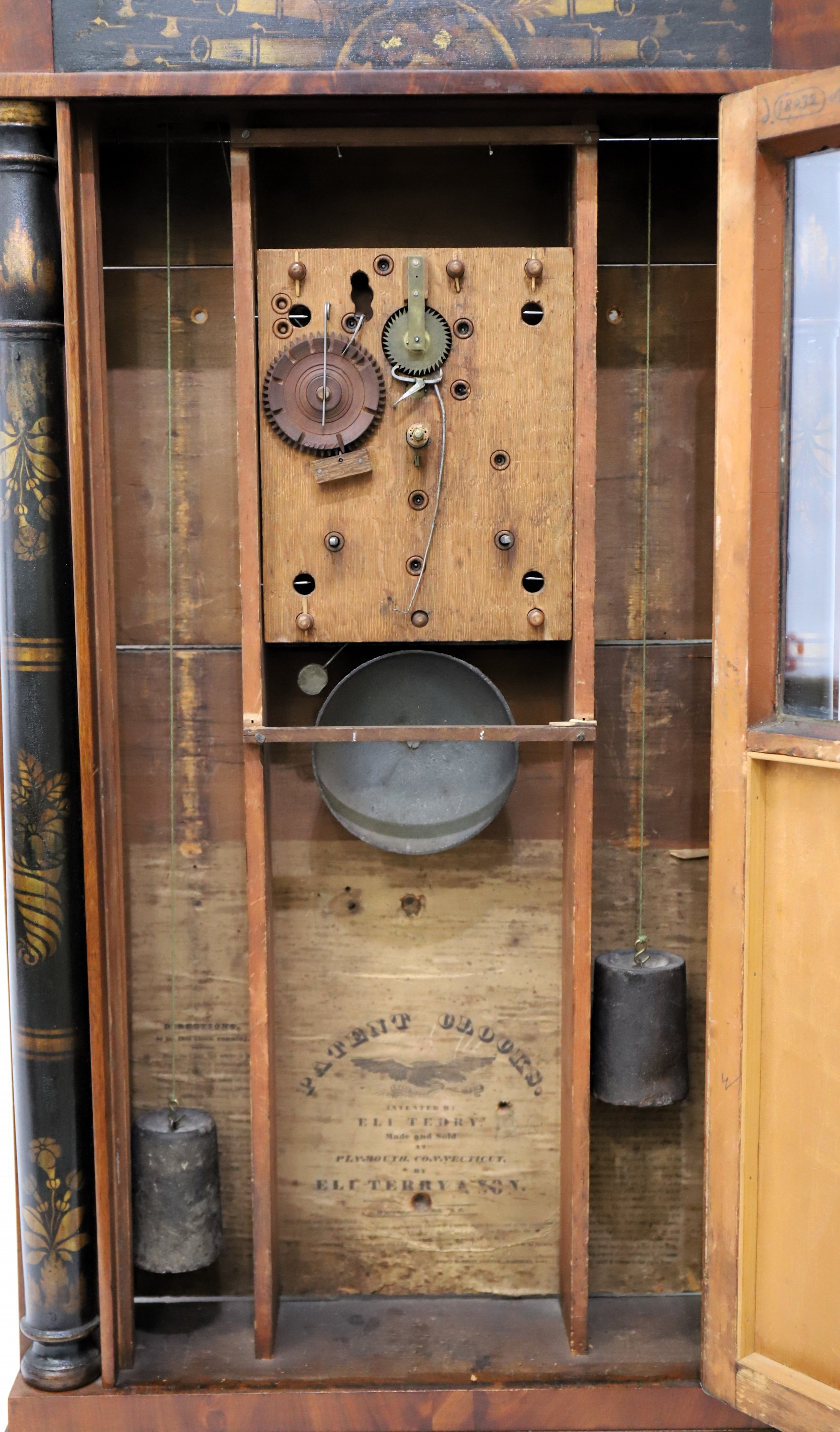 likely original. The 30-hour time-and-strike wooden movement looks good but could not be tested, as there is no pendulum rod