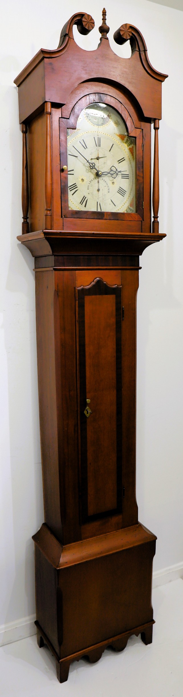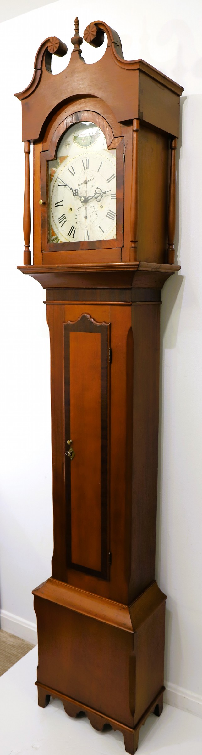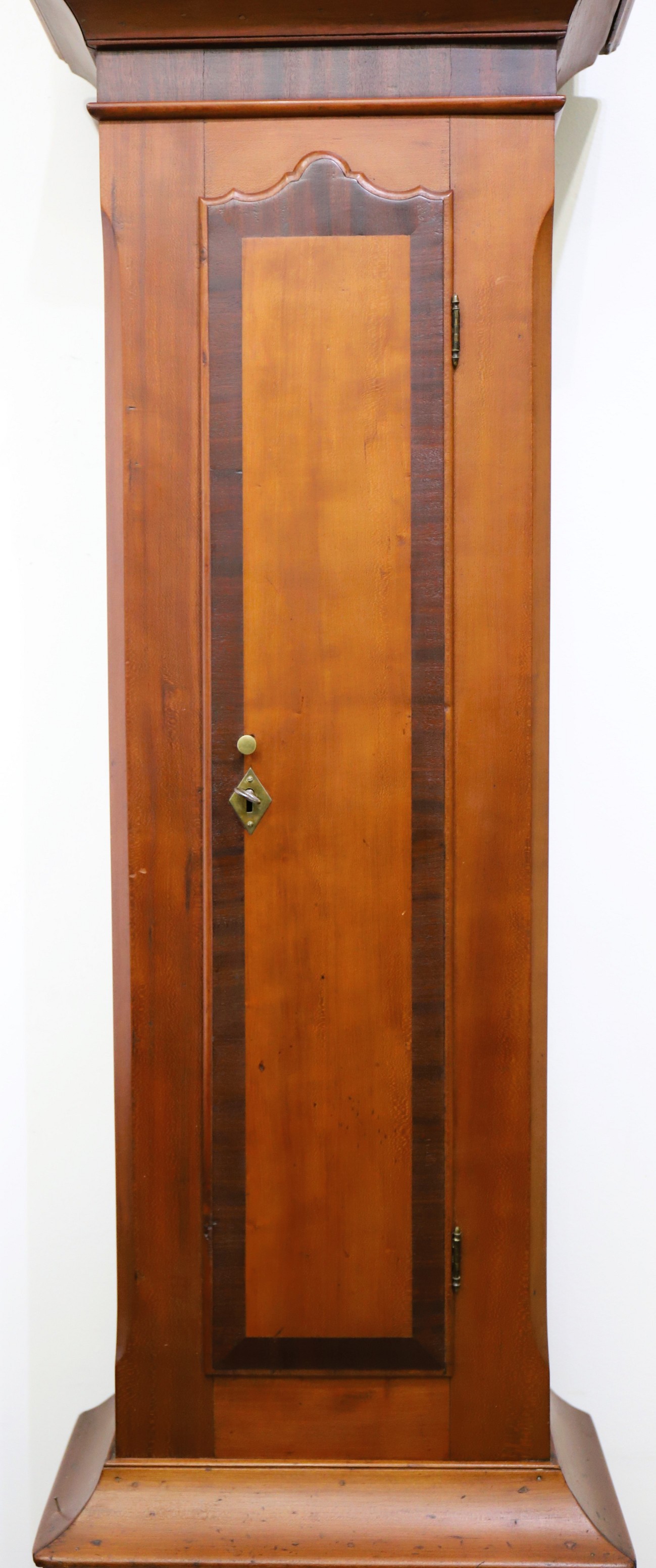 KY. Numerous examples of his tall case cabinets, made of cherry, often with mahogany or walnut banding (as found here) are known. His distinguishing marks are the form of the scrolls on top and the unique form of the top of the trunk door. His clocks are