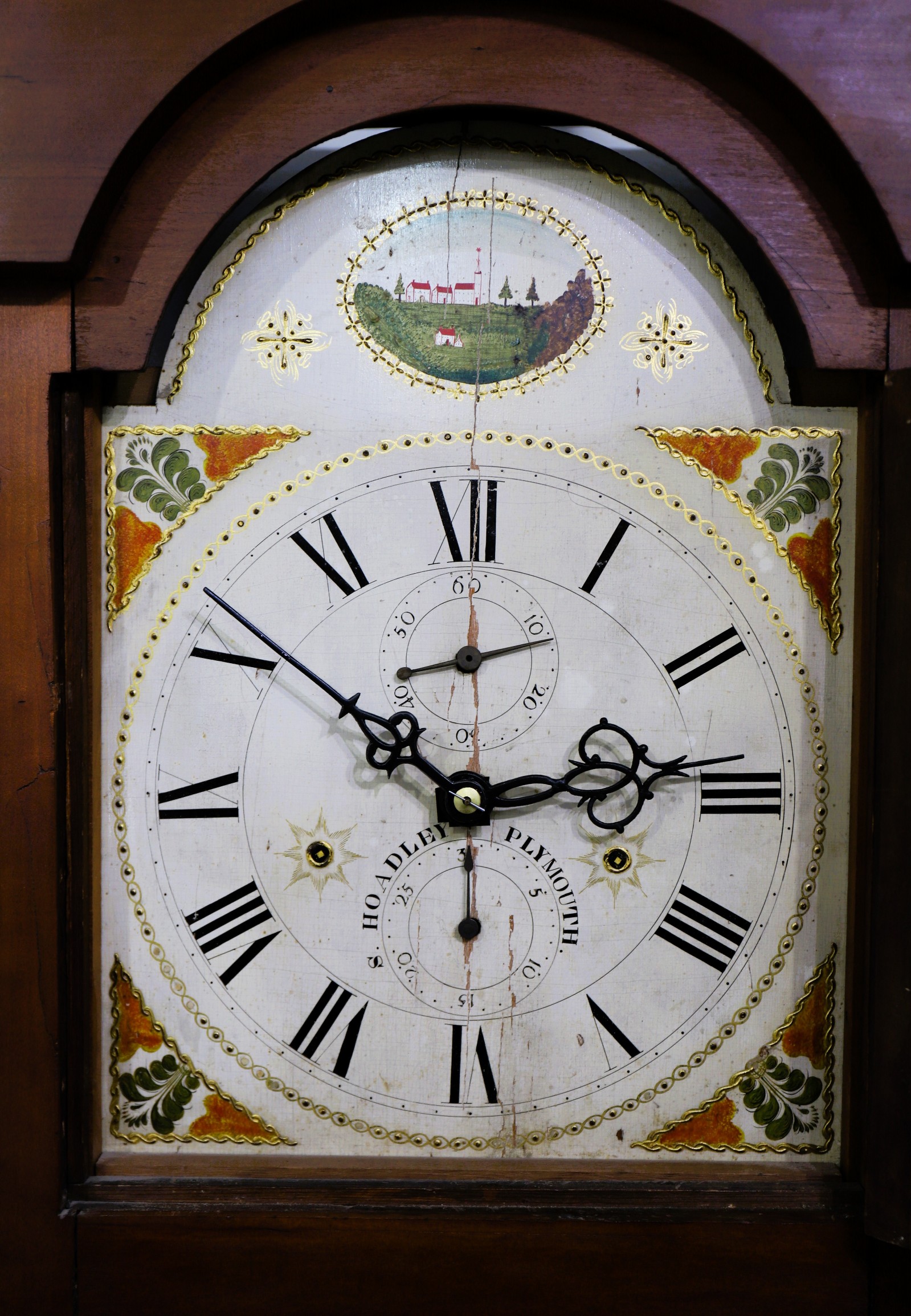 in the arch. The spandrels are colorful with good retention of the gesso and gilding. The sub-dial hands are likely replacements,