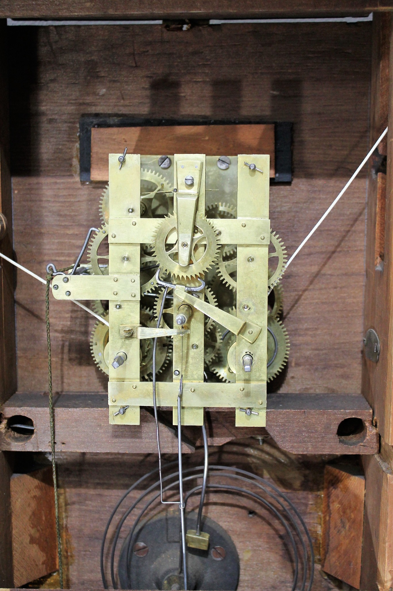 is running and striking on a wire gong, driven by two large iron weights, and regulated by a period pendulum bob. You won’t