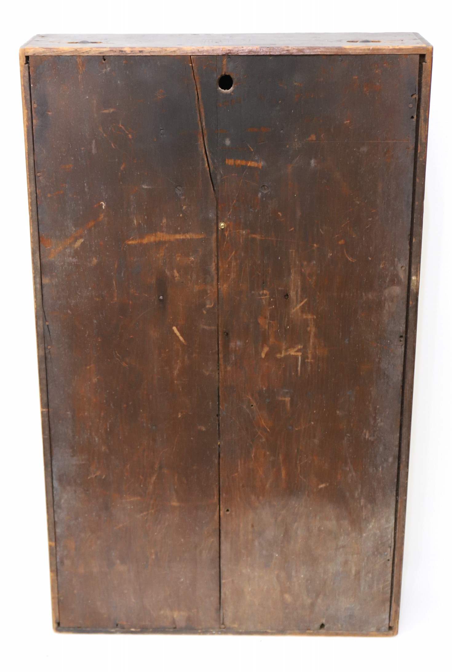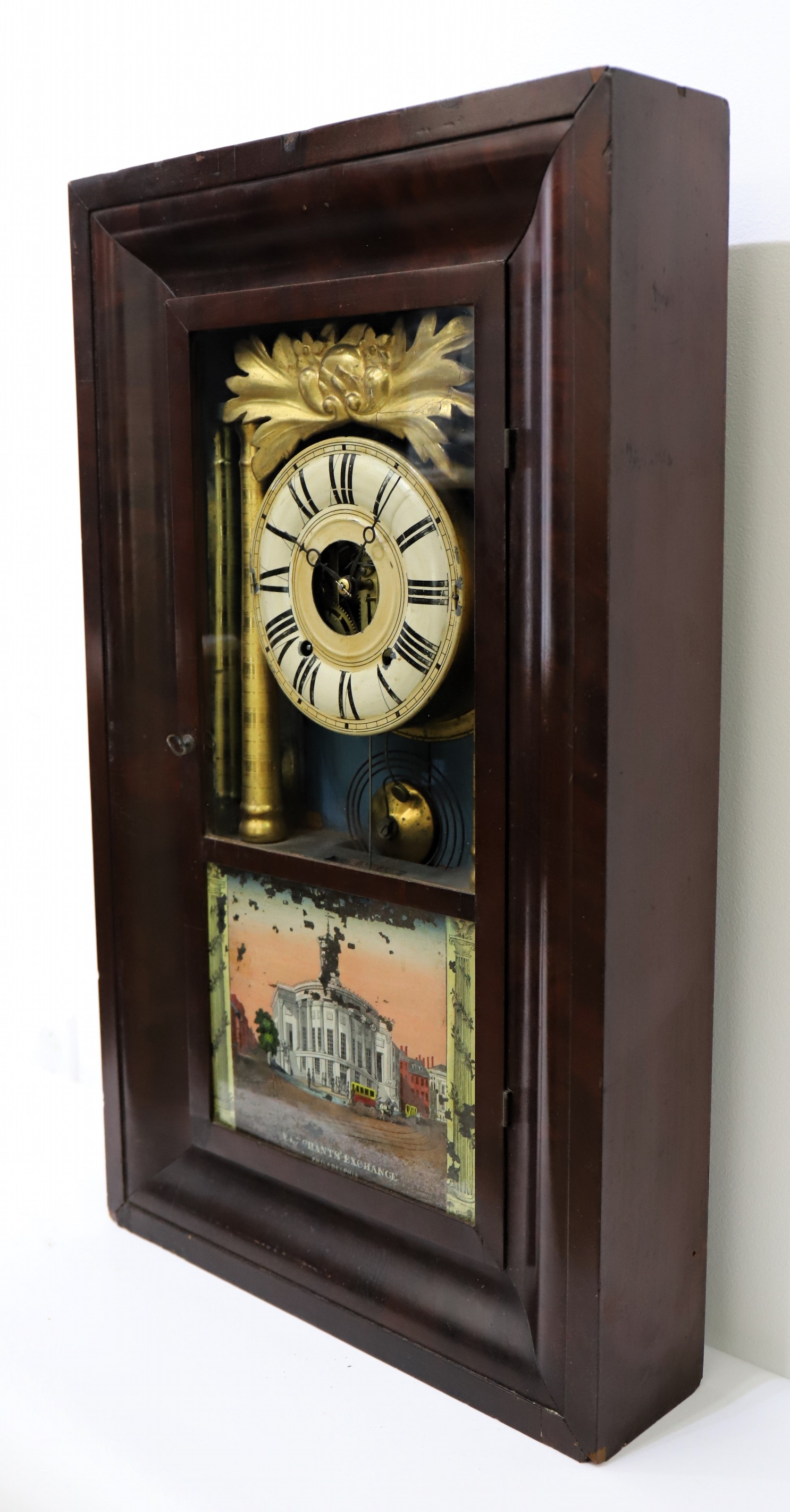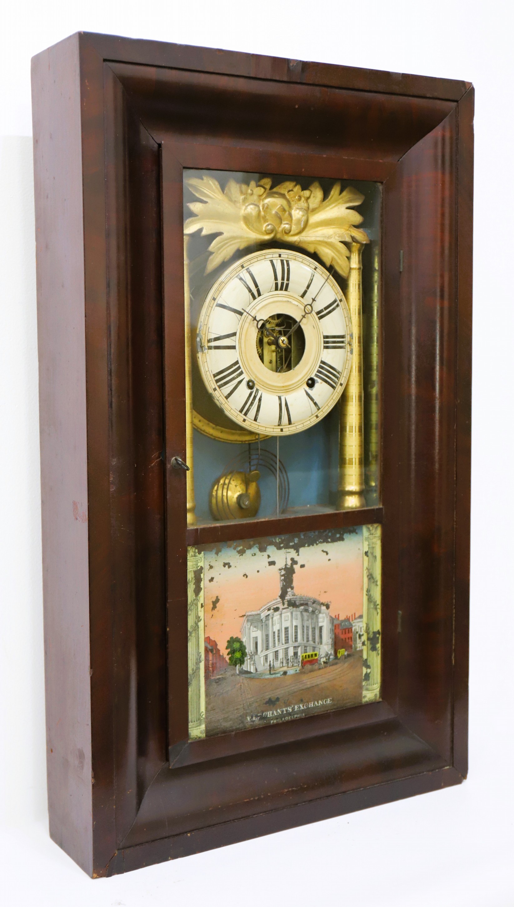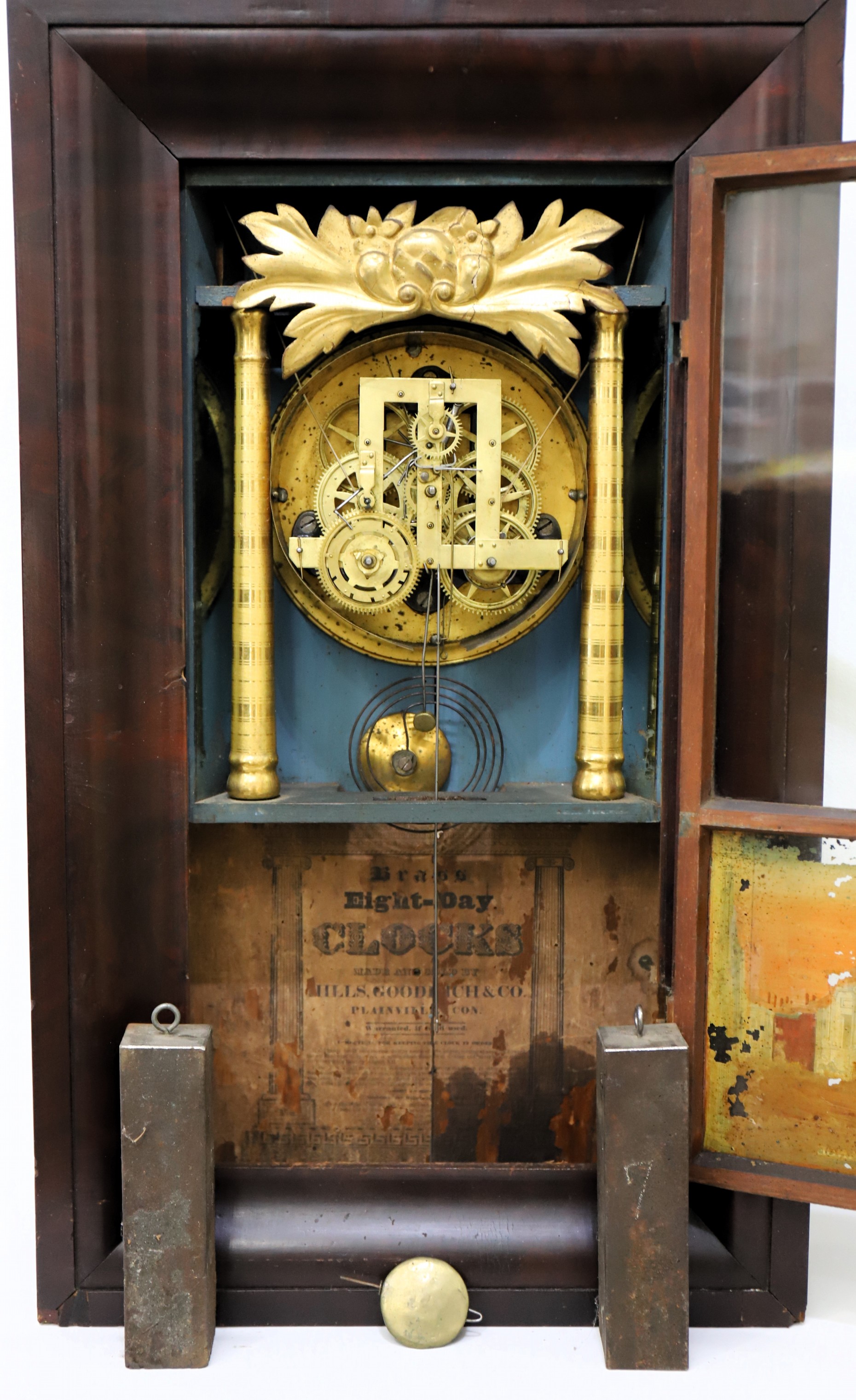 Hills, Goodrich & Co. gilt column OG, 1841-1845. The 31-inch OG case is veneered in dark mahogany with an old and patinated finish; both glasses are original, the tablet original, depicting the Philadelphia Merchant’s Exchange. The gilded gesso acanthus leaves have some cracks, the gilded columns are also original but show some cracking and peeling toward the back. The two inside mirrors appear to be original; the paint color is typical and likely original. The formed and fitted dial is pinned to the housing surrounding the movement; the hands are period and correct. The 8-day, time-and-strike, unsigned movement is unusual in its design, with the count wheel in front of the frame; it is just barely running with the substitute weights. Proper 9-lb weights that are specific to this clock are needed (see #30). The label has many losses and oil stains, but the makers’ names are still readable. AAC sold one in 2022 for $715 and one last summer for $670. $500–$750.
