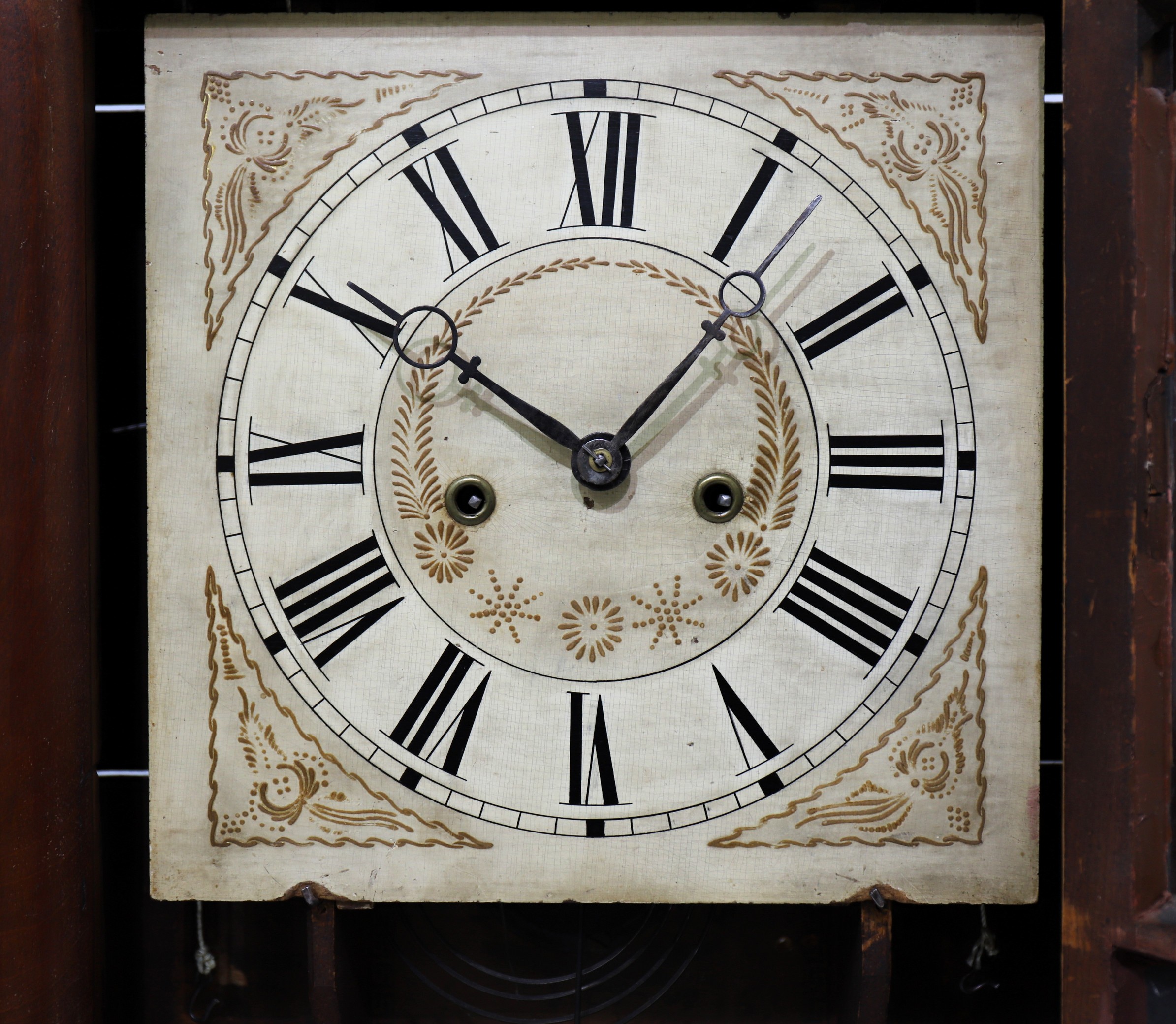 are period. The brass movement is clearly an SB Terry design, with large wooden drums; the movement is adapted from an 8-day