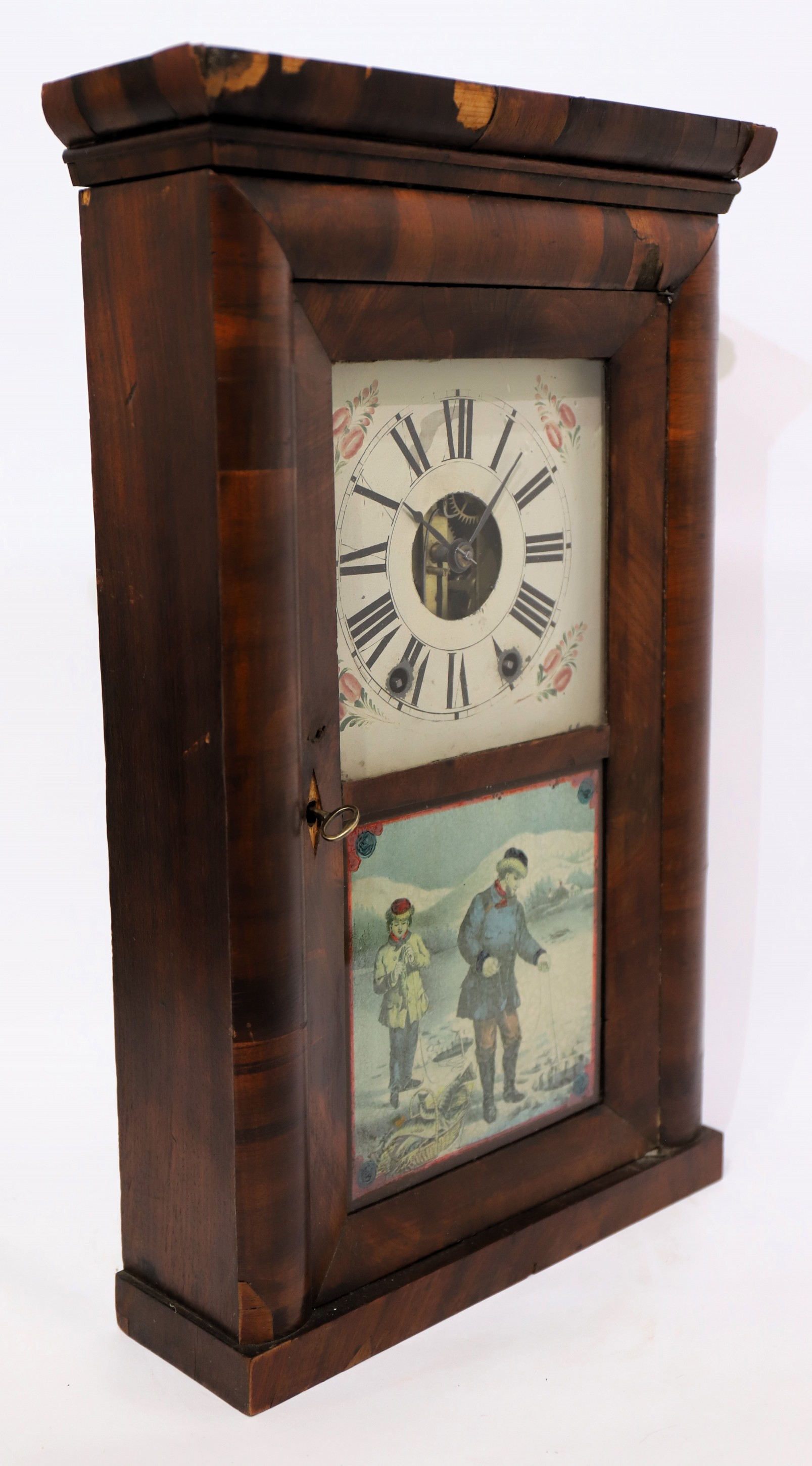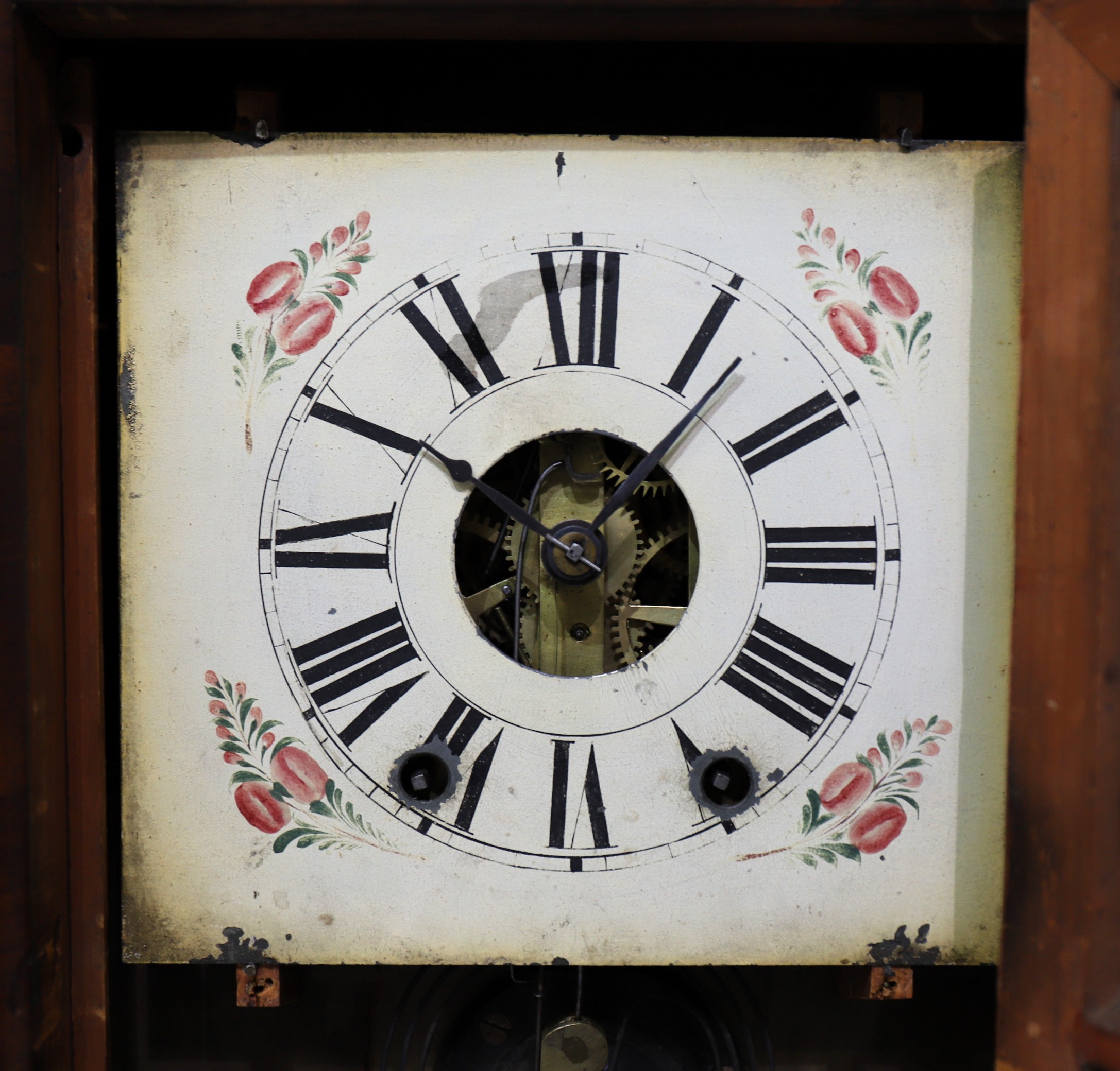 a partner and the company became E.C. Brewster & Co. This is a simple 21-inch case with mahogany veneer and many chips. Both glasses are original but the tablet is a print glued into place. The painted metal dial is period, with staining, chipping,