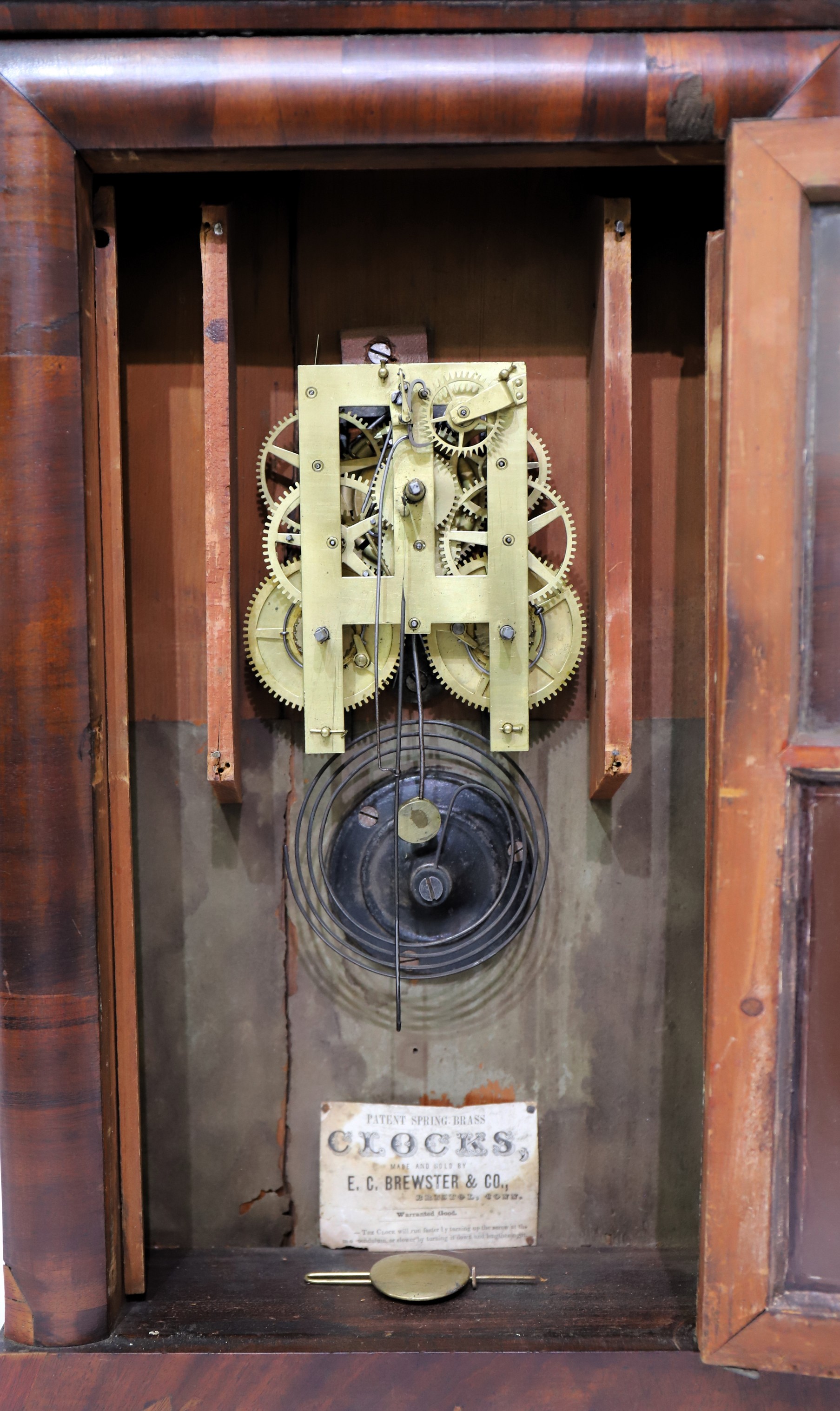 and fading. The hands are period/original and are the type Brewster used. The 30-hour brass time-and-strike movement is
