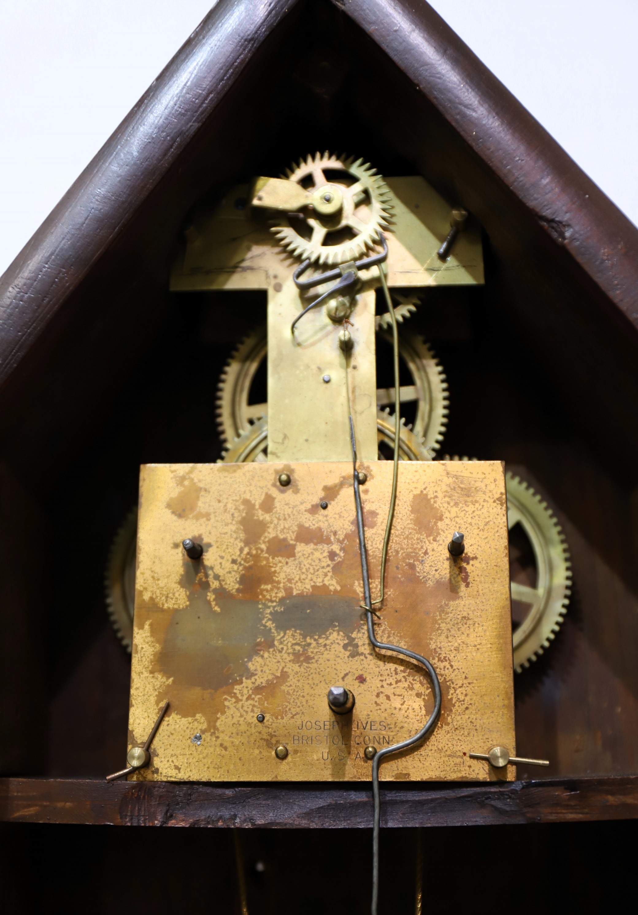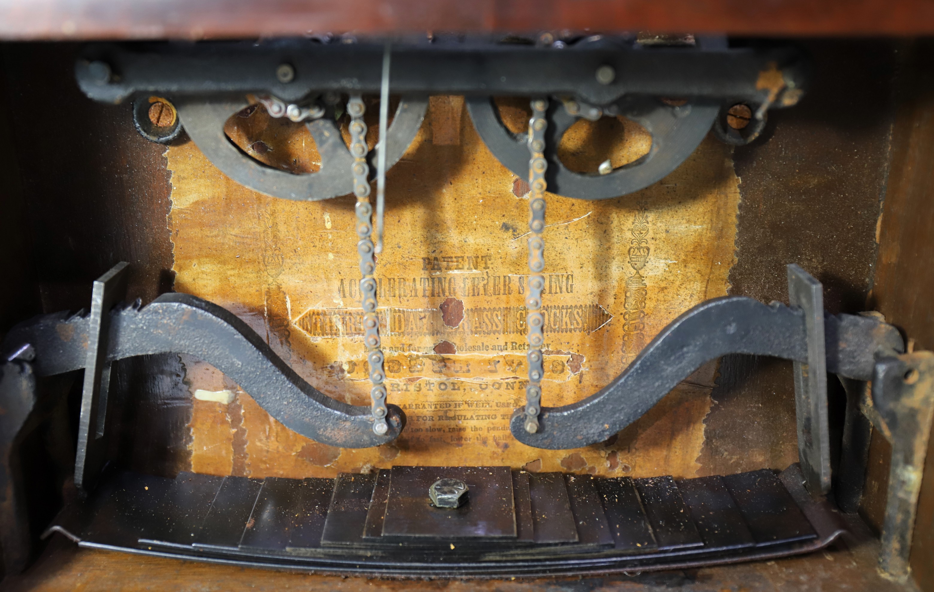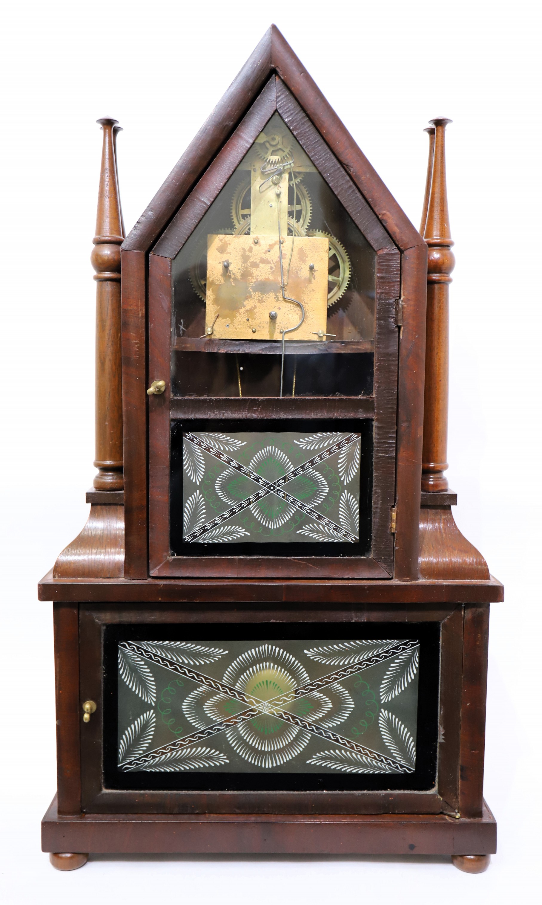Fenn tablets have been repainted. The dial and hands are missing. The movement is signed Joseph Ives, Bristol, Conn USA;