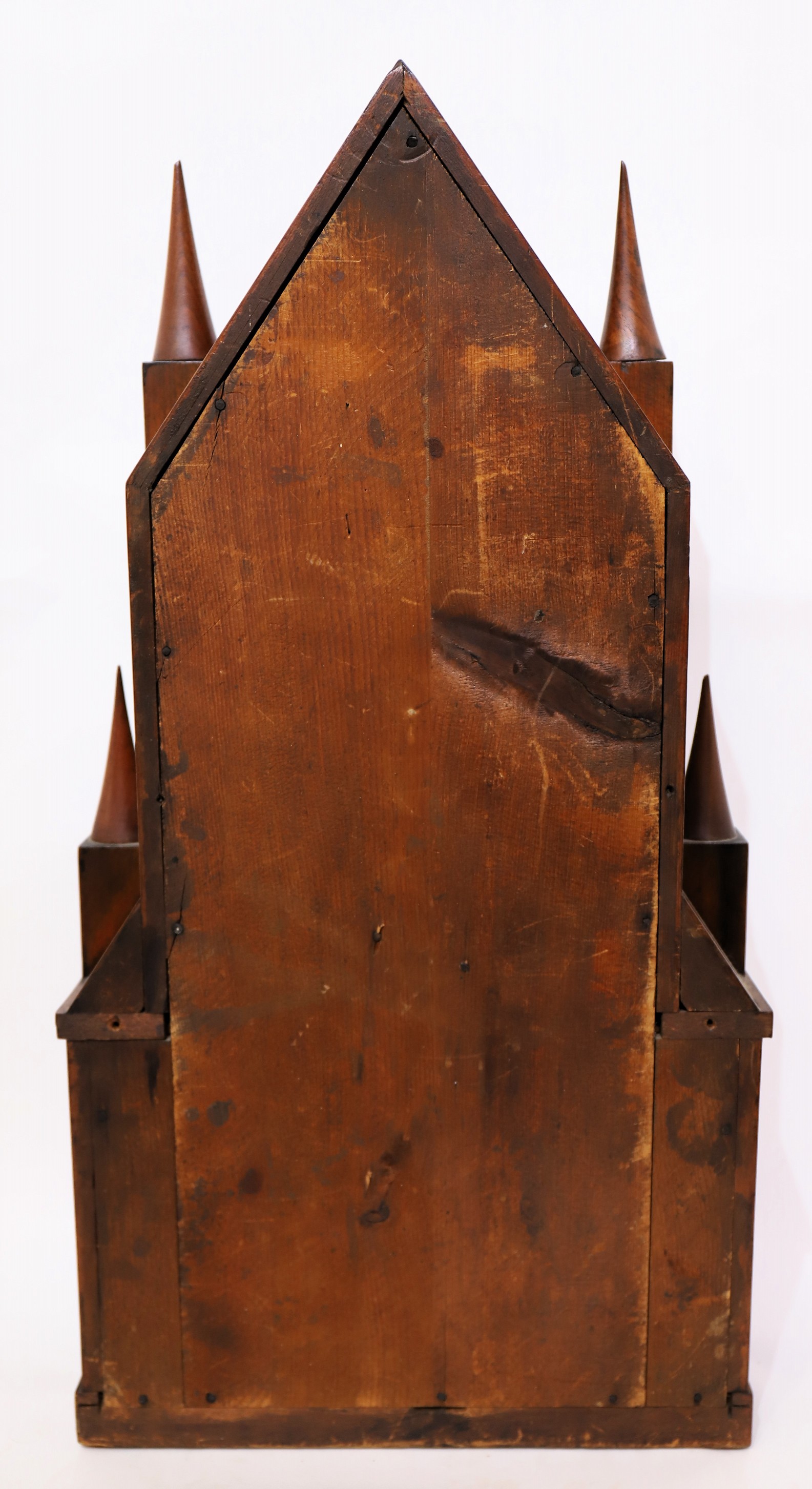 finish with a couple of veneer repairs; the three glasses are period/original with the original tablets. The cone finials look