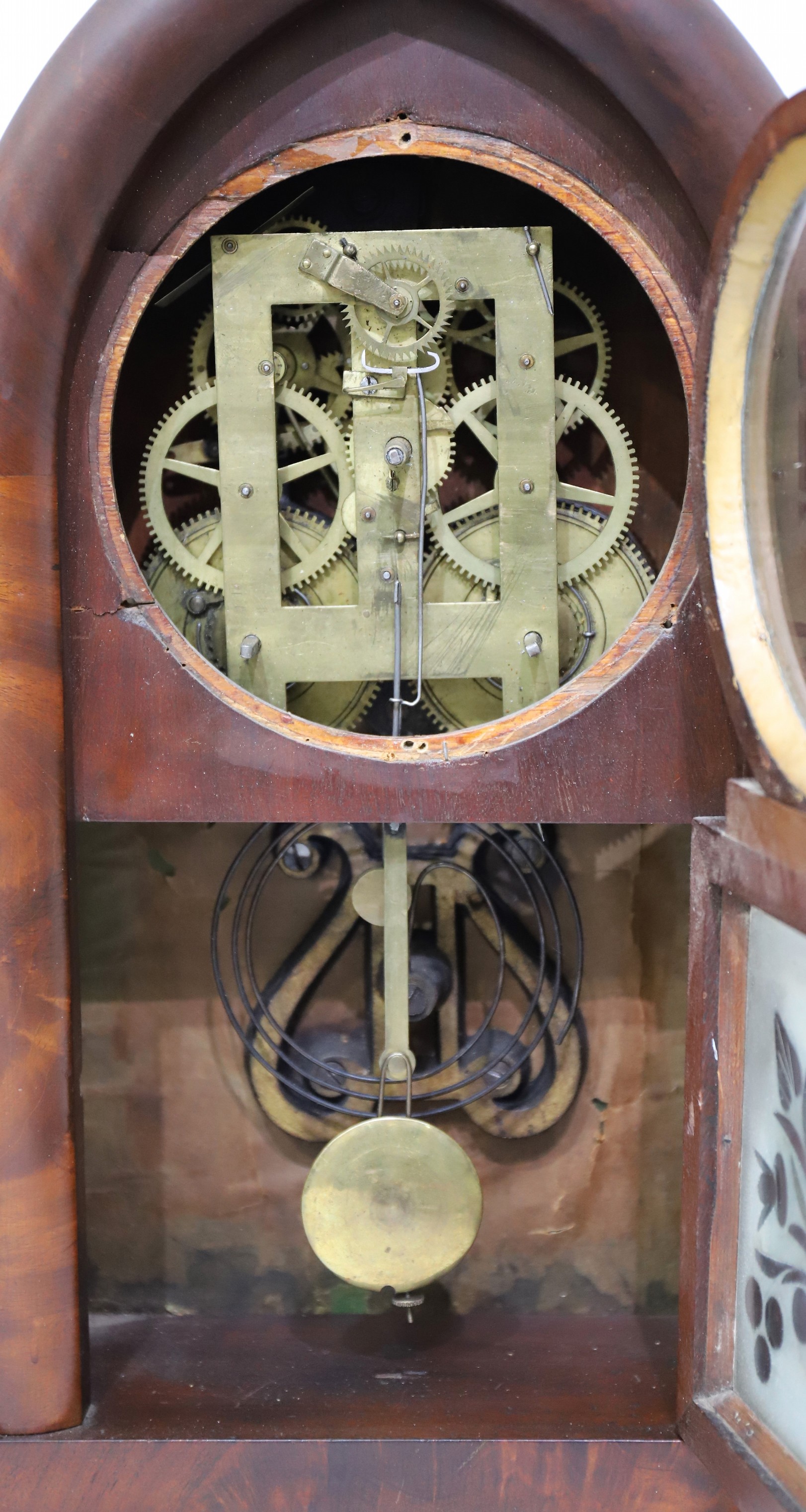 iron backplate, 1843-1846. A 19-inch “beehive” case again with Kirk’s patent cast iron backplate with the brass springs housed
