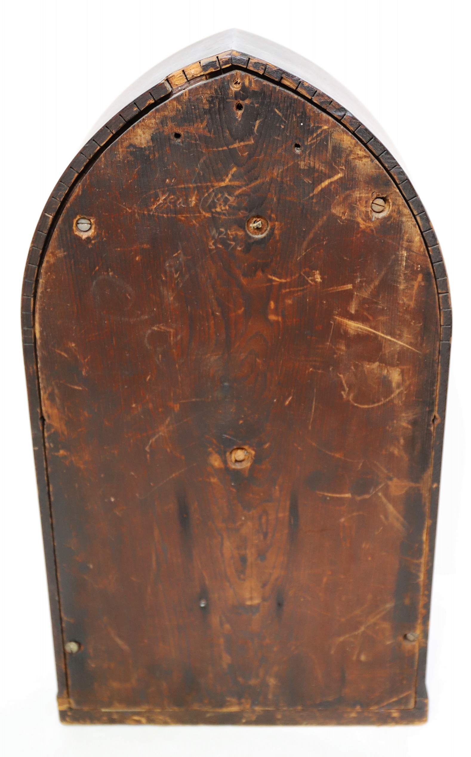 is broken and warped at the bottom; the door latch is missing. The iron dial was repainted by The Dial House, the hands are