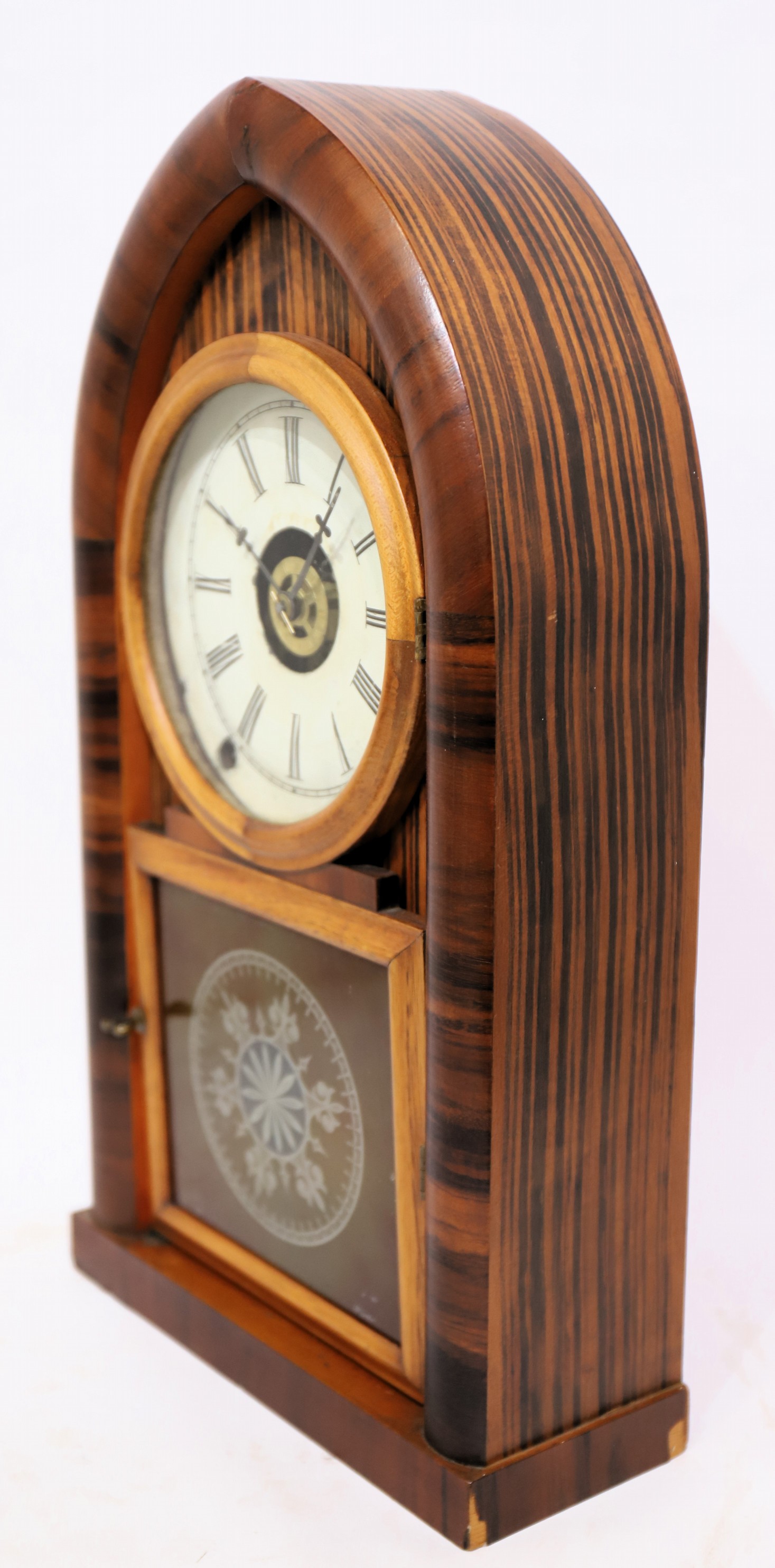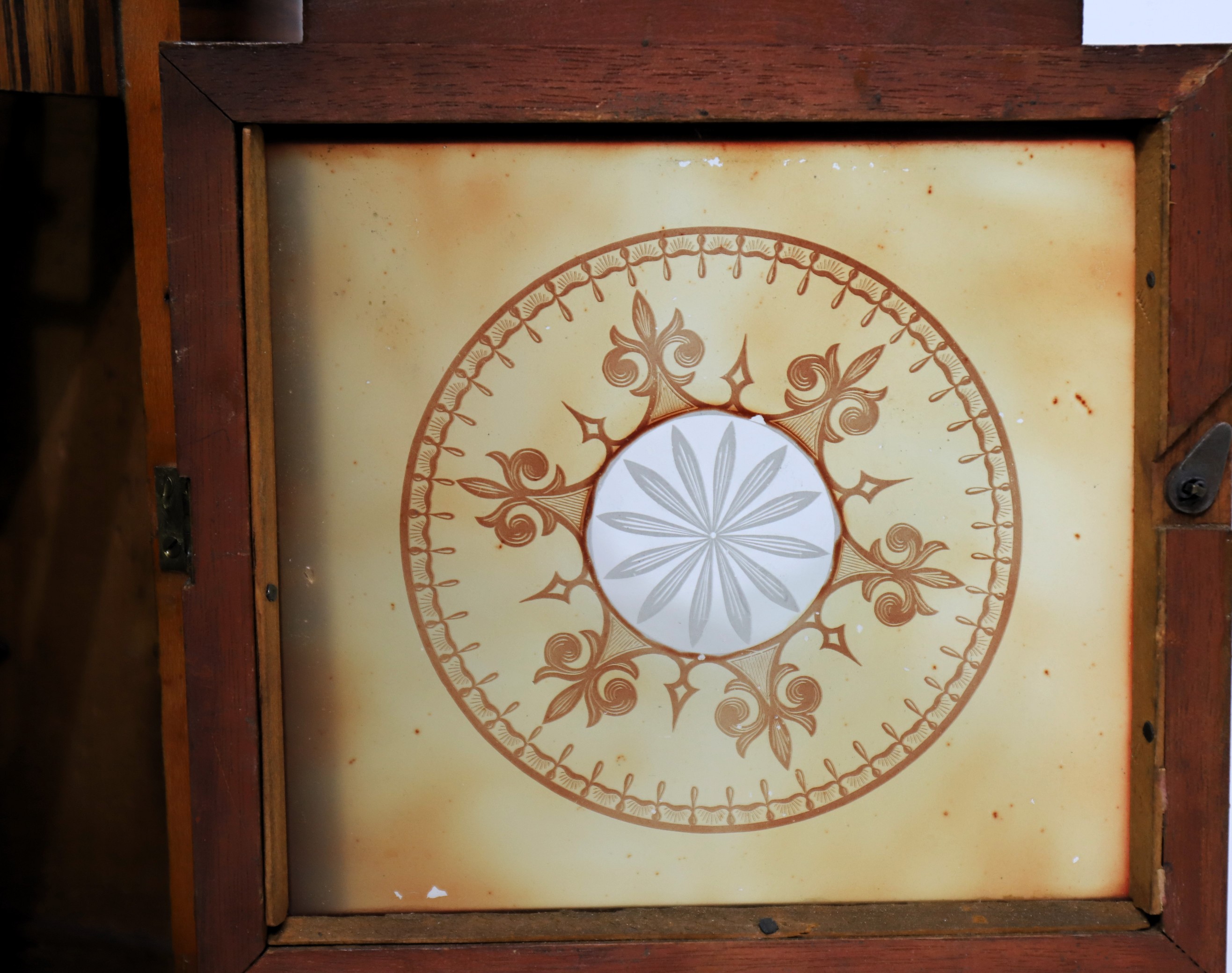 on the sides and dial board, giving it a striking appearance. The finish is clean and it has likely been refinished. Both