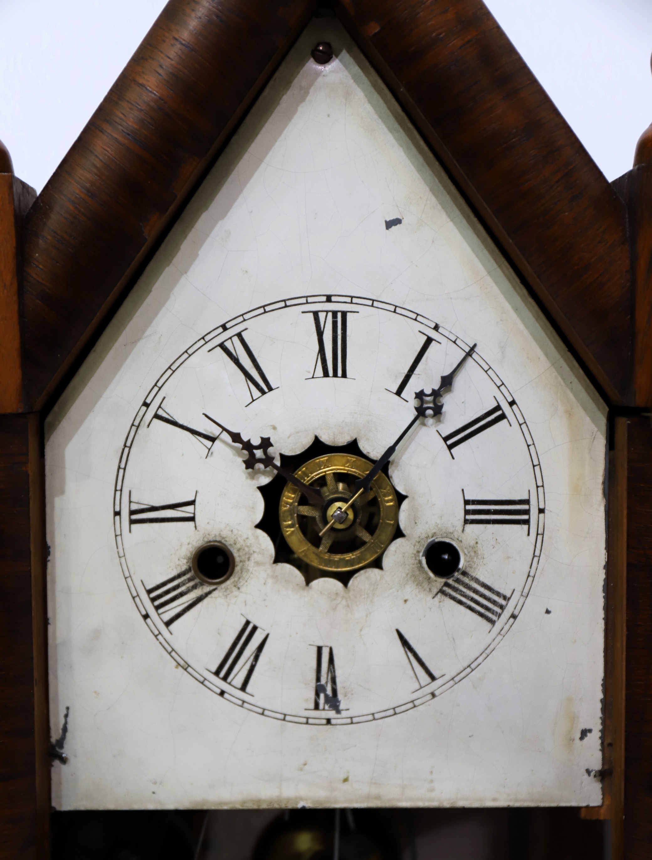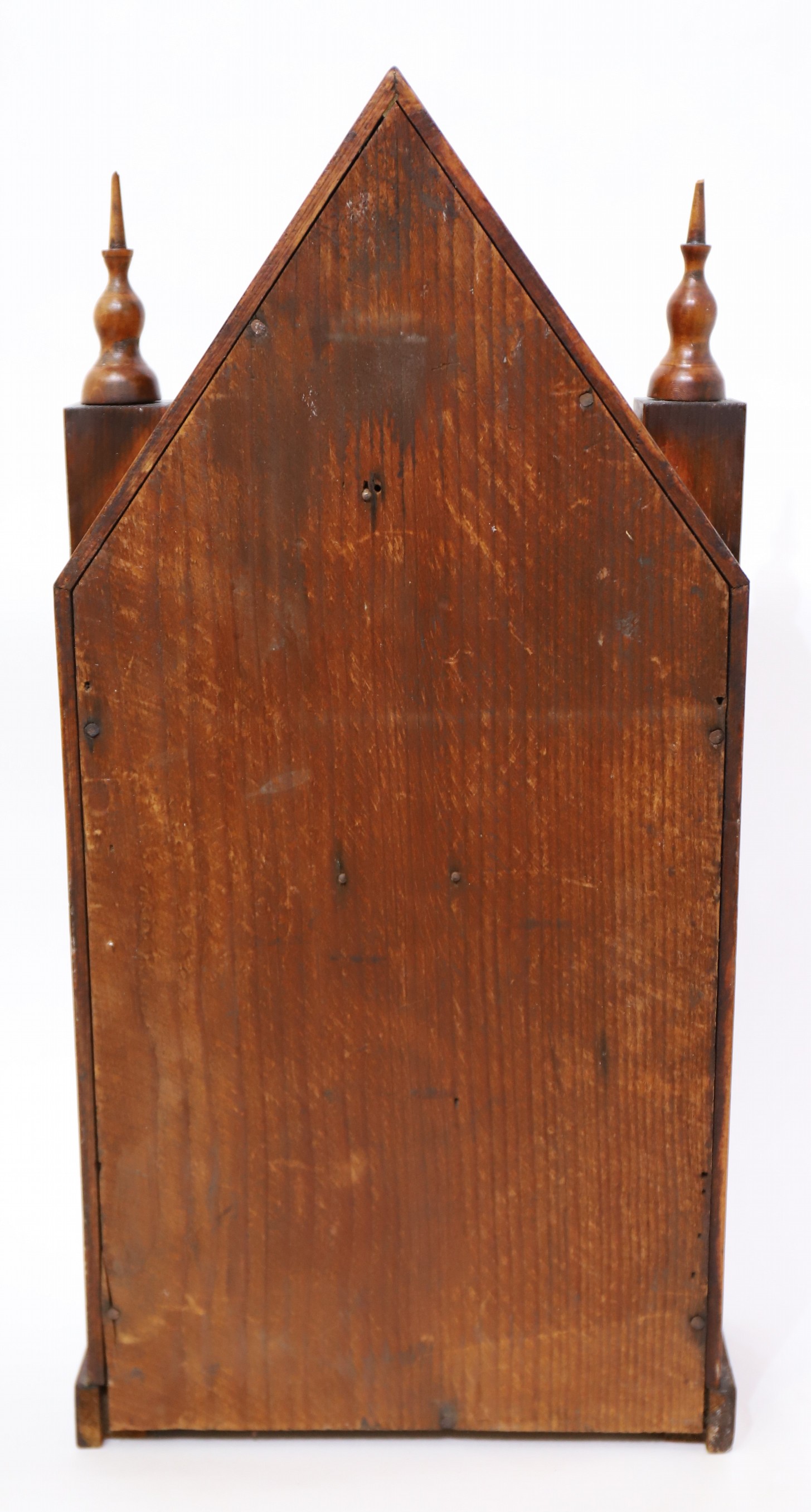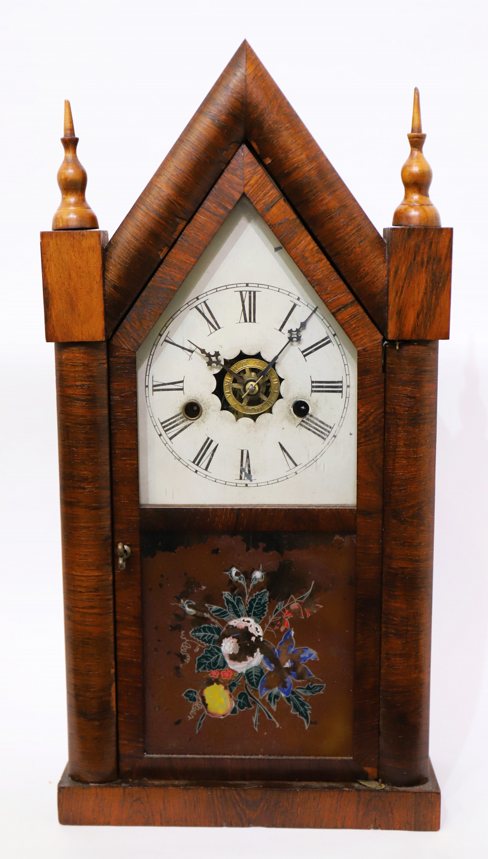 E.N. Welch Mfg. Co. 30-hour steeple, 1864–1903. A 19.5-inch case with good rosewood veneer and two period/original glasses, the tablet with some losses. The finial tips are