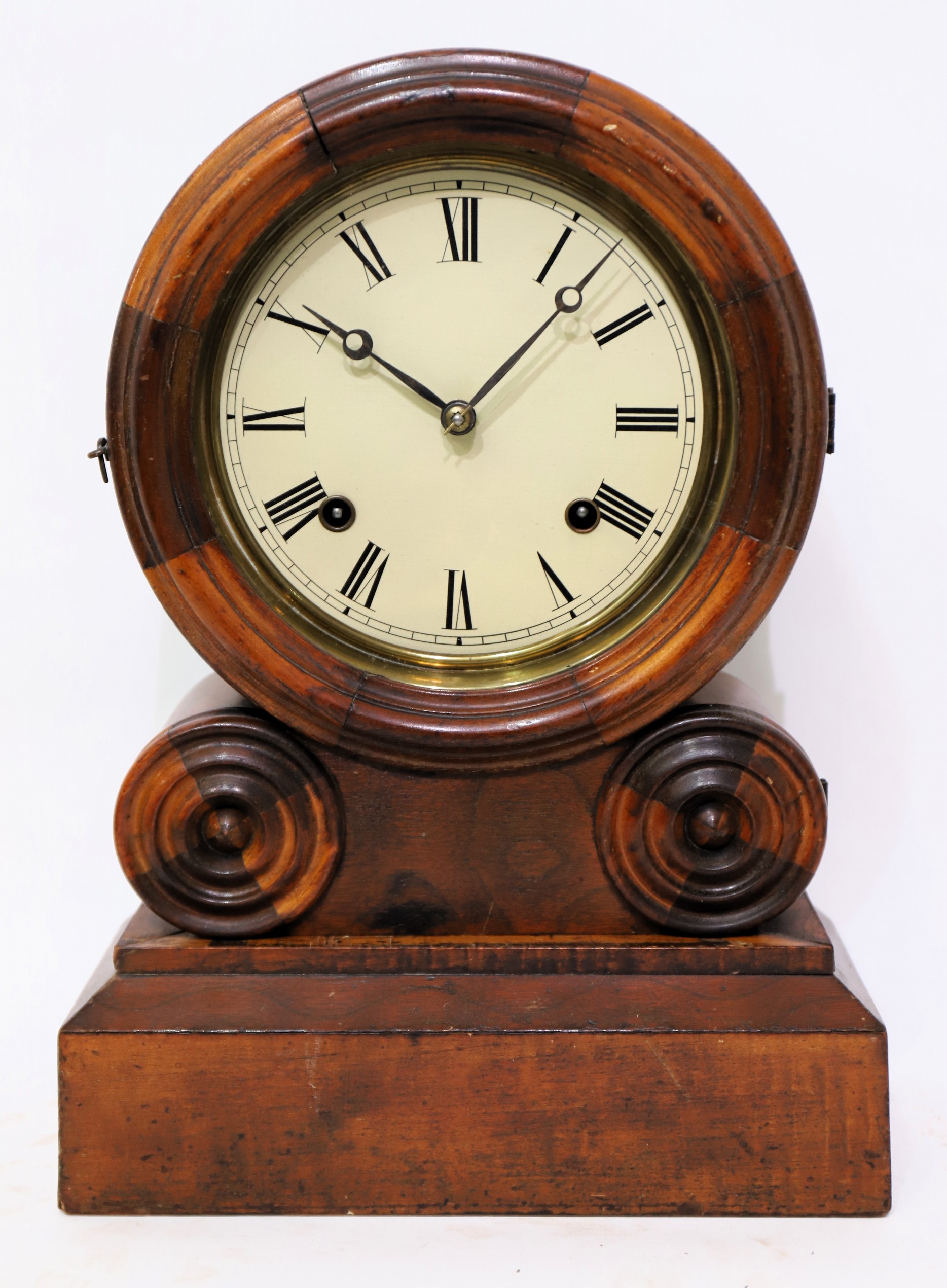E. Ingraham & Co. “Grecian Mosaic”, 1871-1873. A 14.5-inch mosaic case, alternating walnut and maple(?). The finish is old and darkened. The glass is old, possibly original;