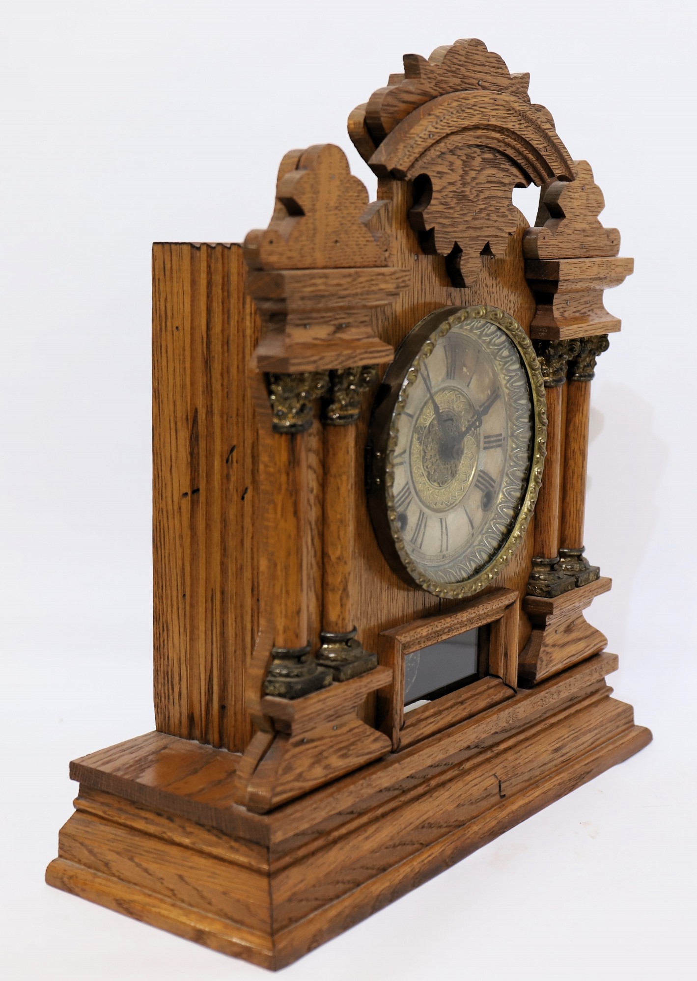 1896. A 16-inch refinished oak case with a flat glass in the brass bezel and a badly discolored paper dial. The hands