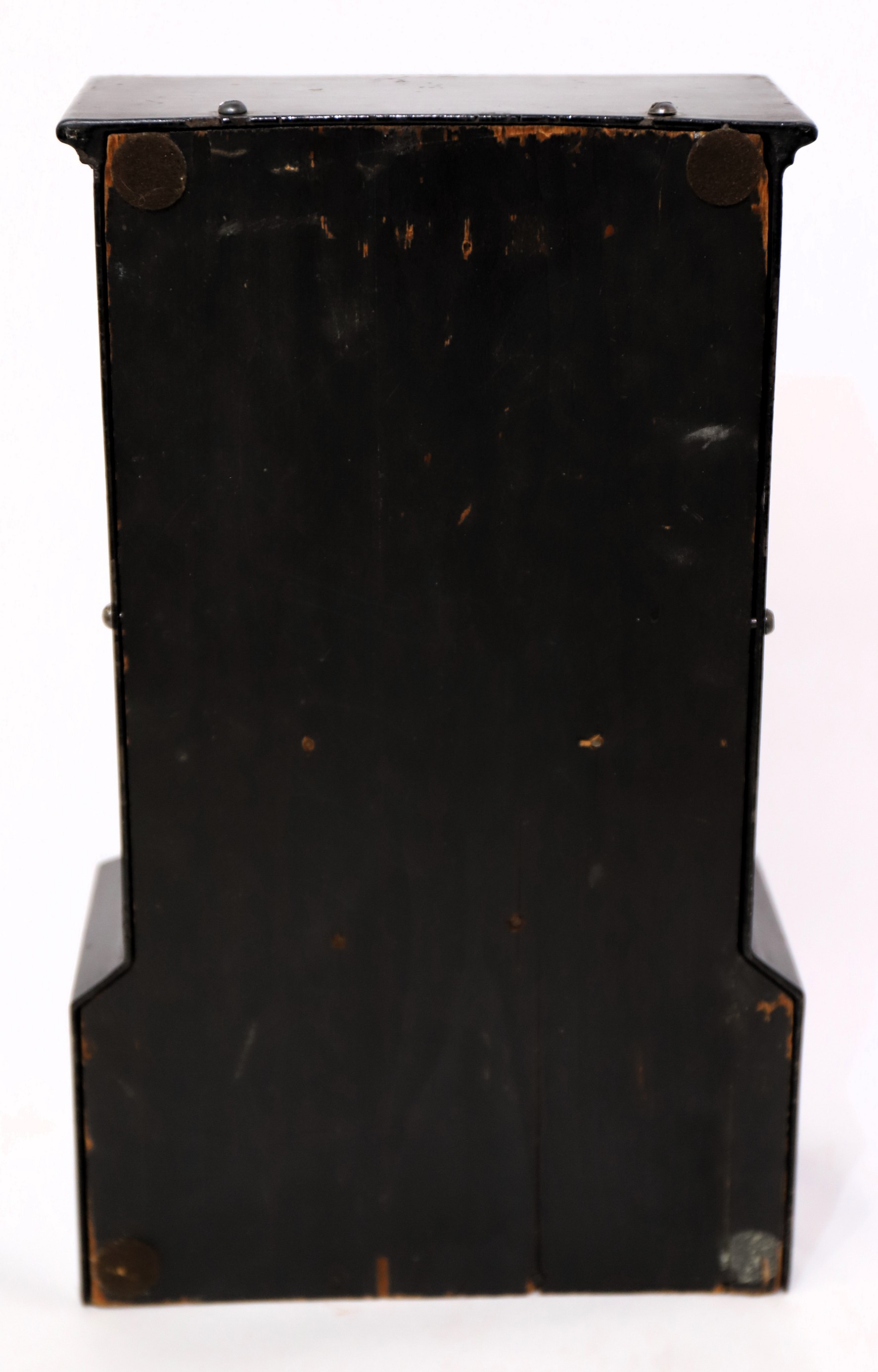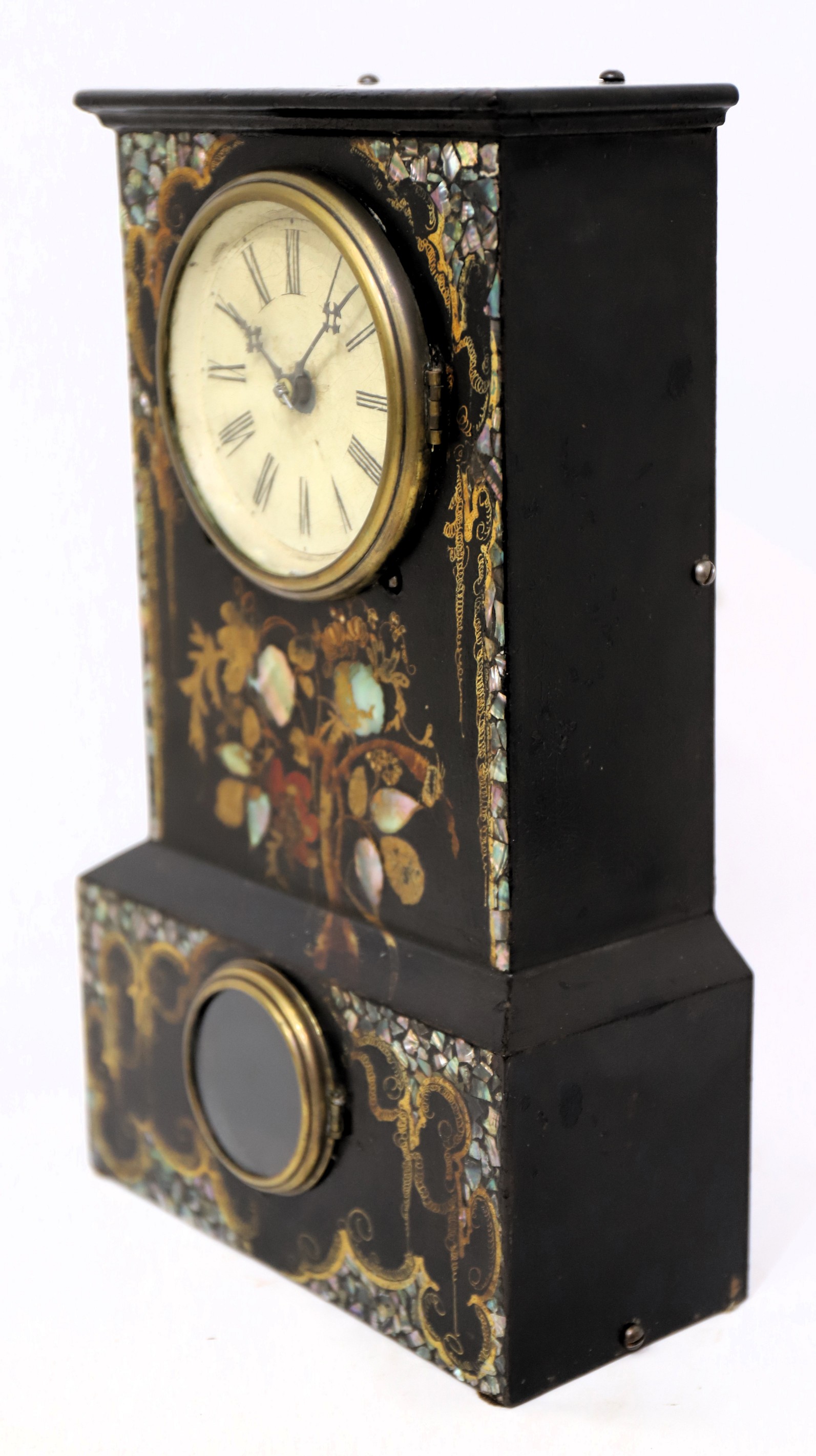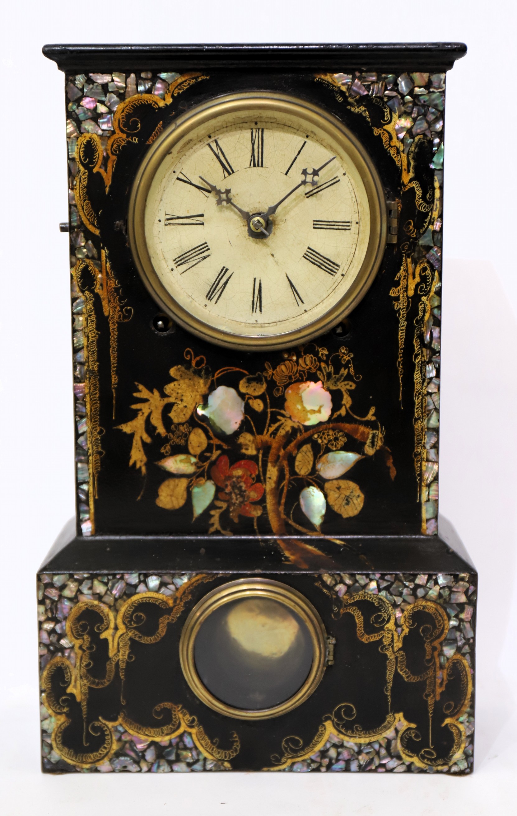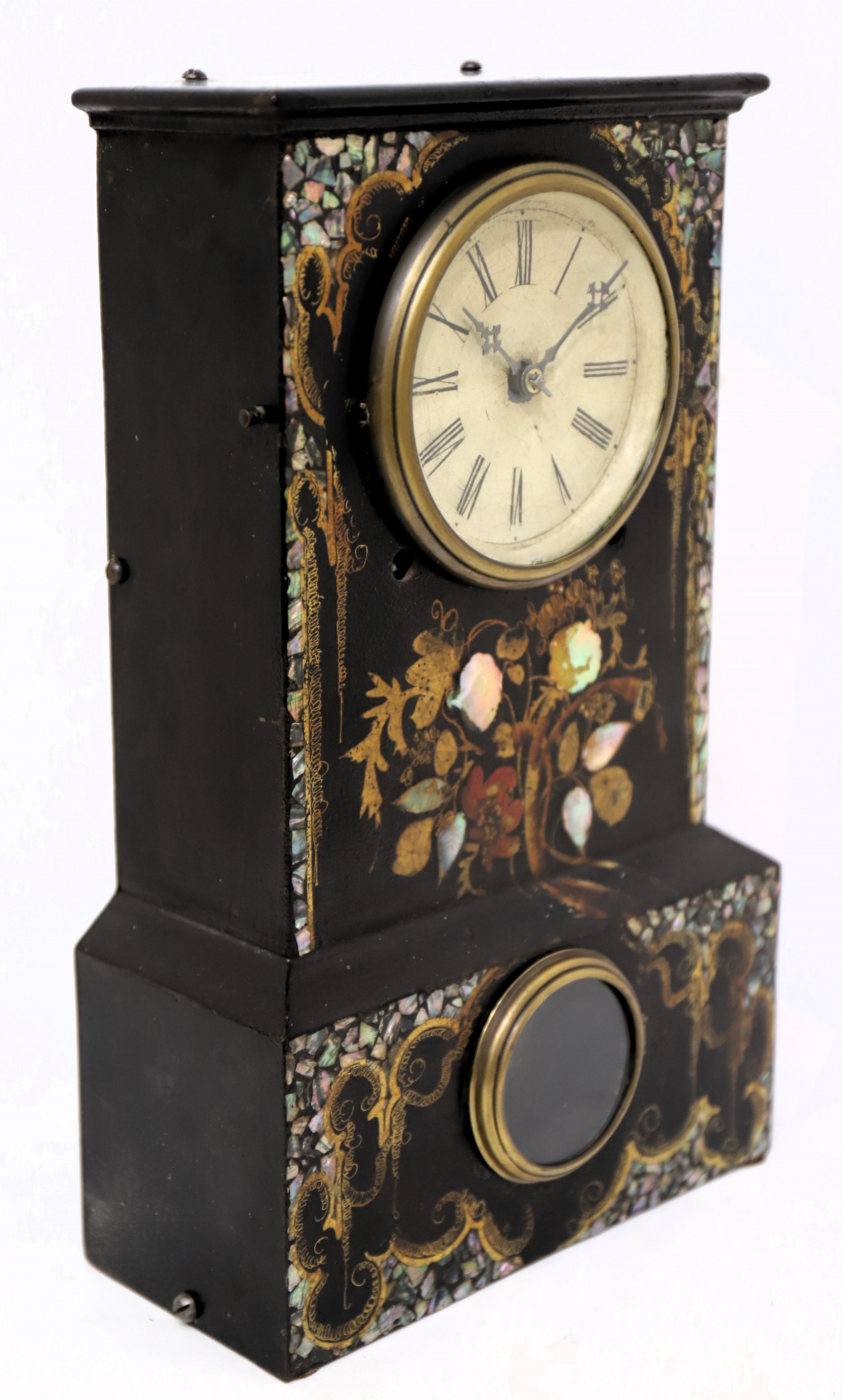 1842-1850. A 14-inch iron case decorated with MOP (mother of pearl), painted flowers, and gilding. No loss of