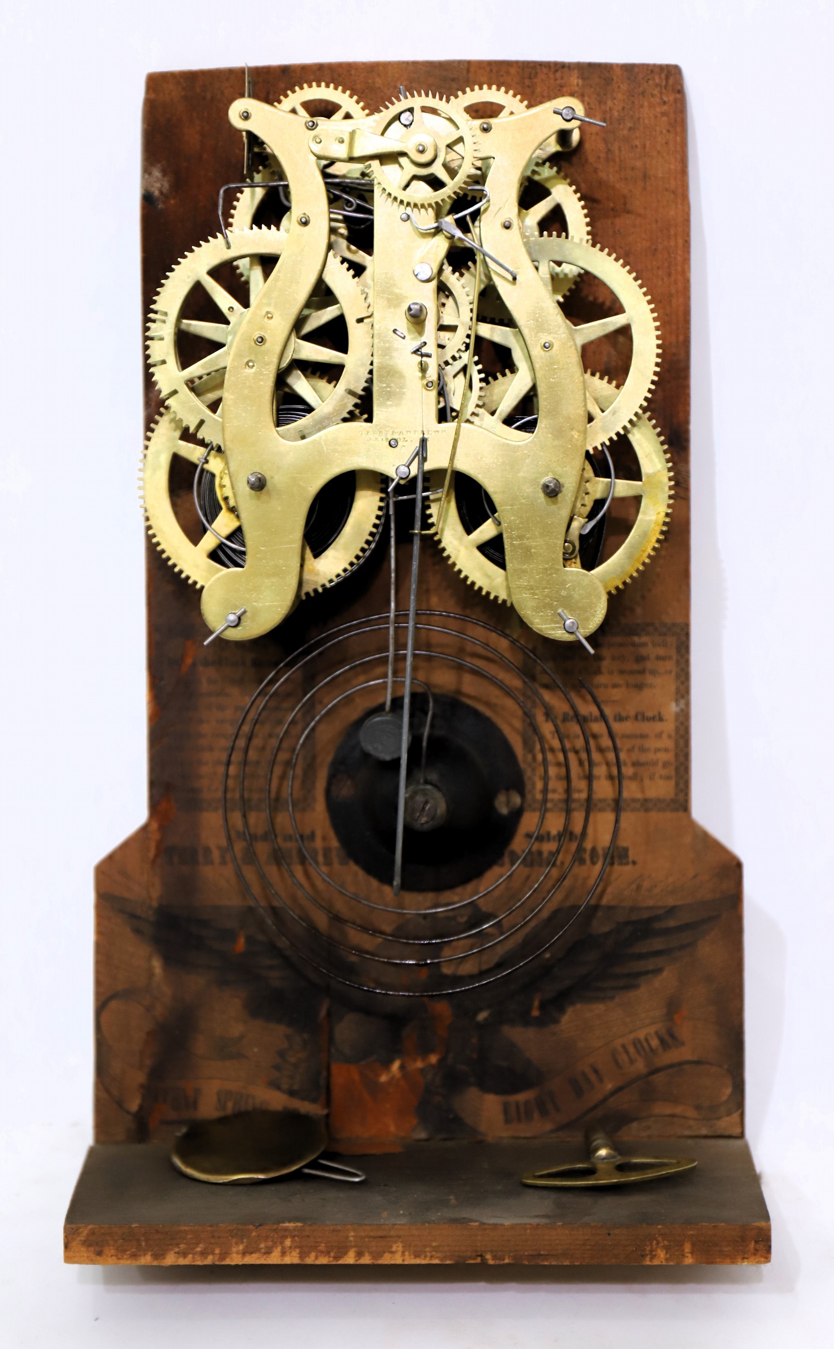 on the left. The 8-day Terry & Andrews lyre movement is signed, running and striking on a wire gong; there is a dark label