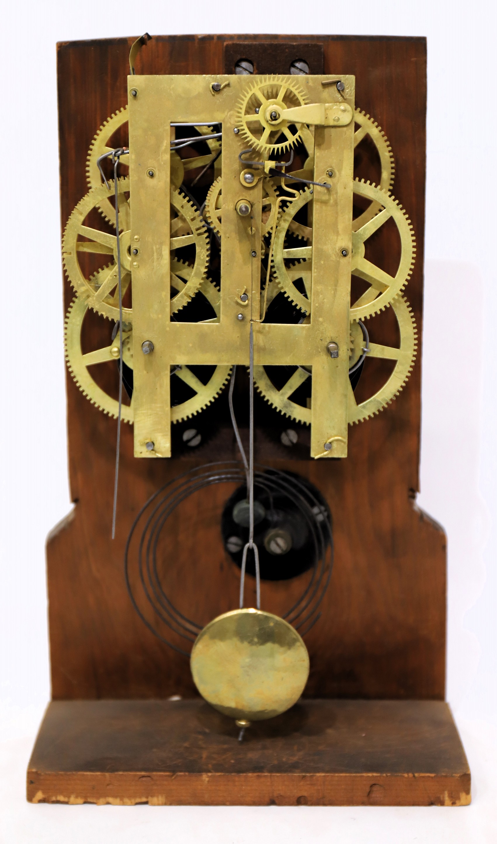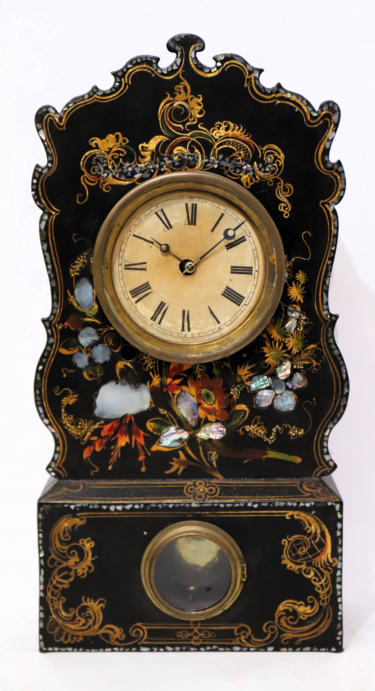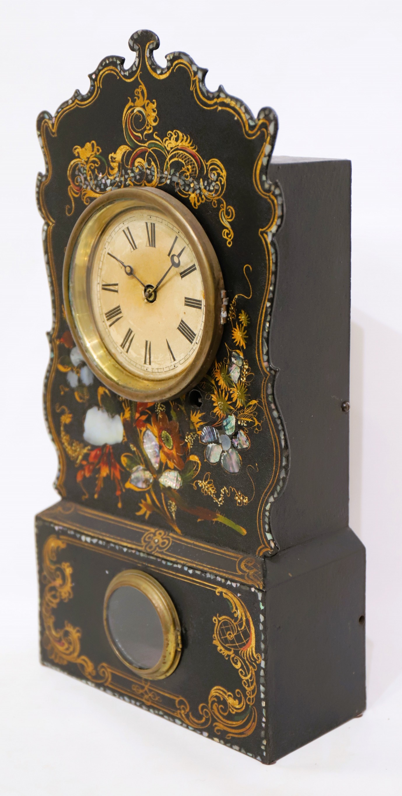 note the small MOP pieces all along the borders. Both glasses are replacements; the dial is paper with yellowing and unsigned. The hands are period and appropriate. The 8-day, time-and-strike movement is unsigned; it is running and striking on the wire