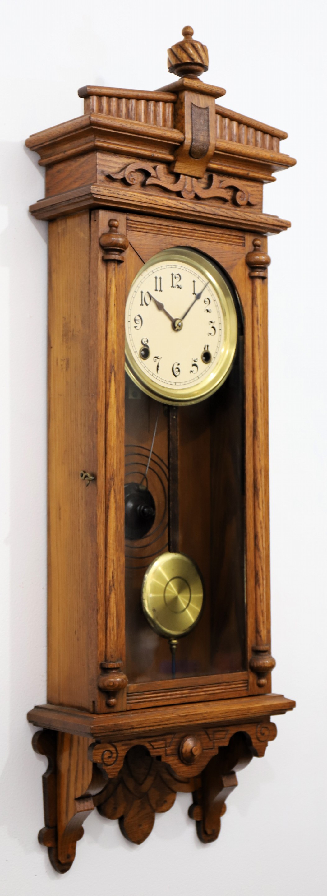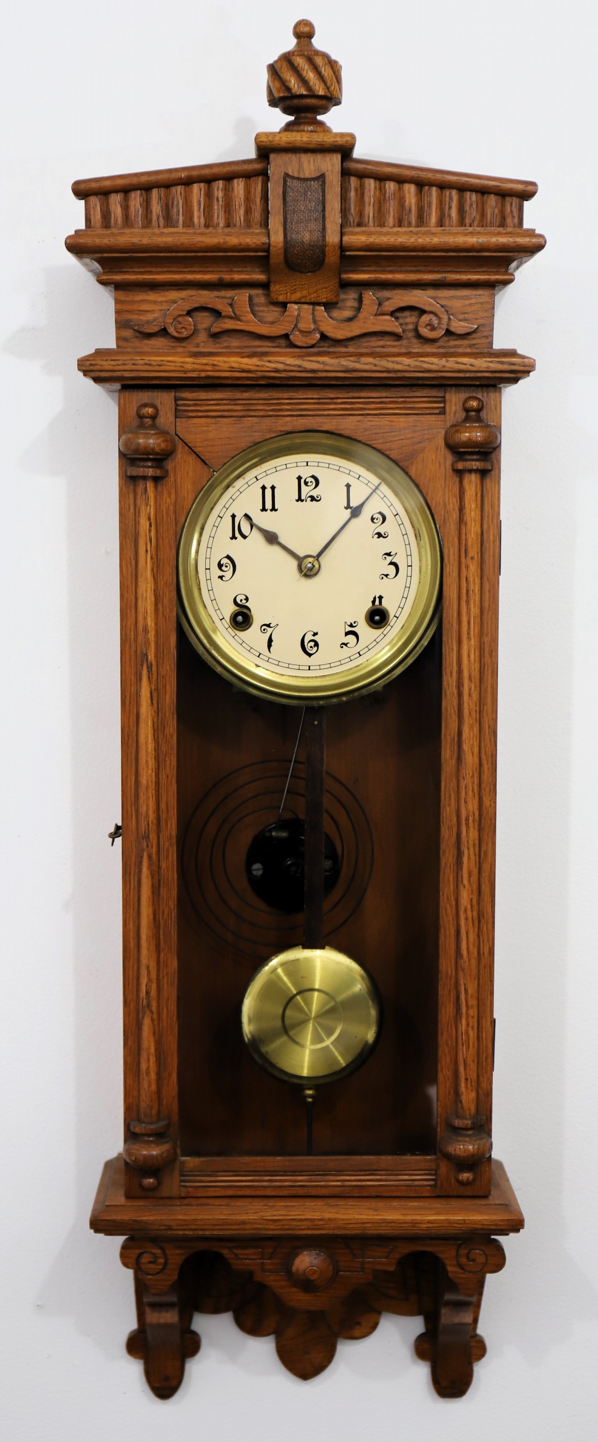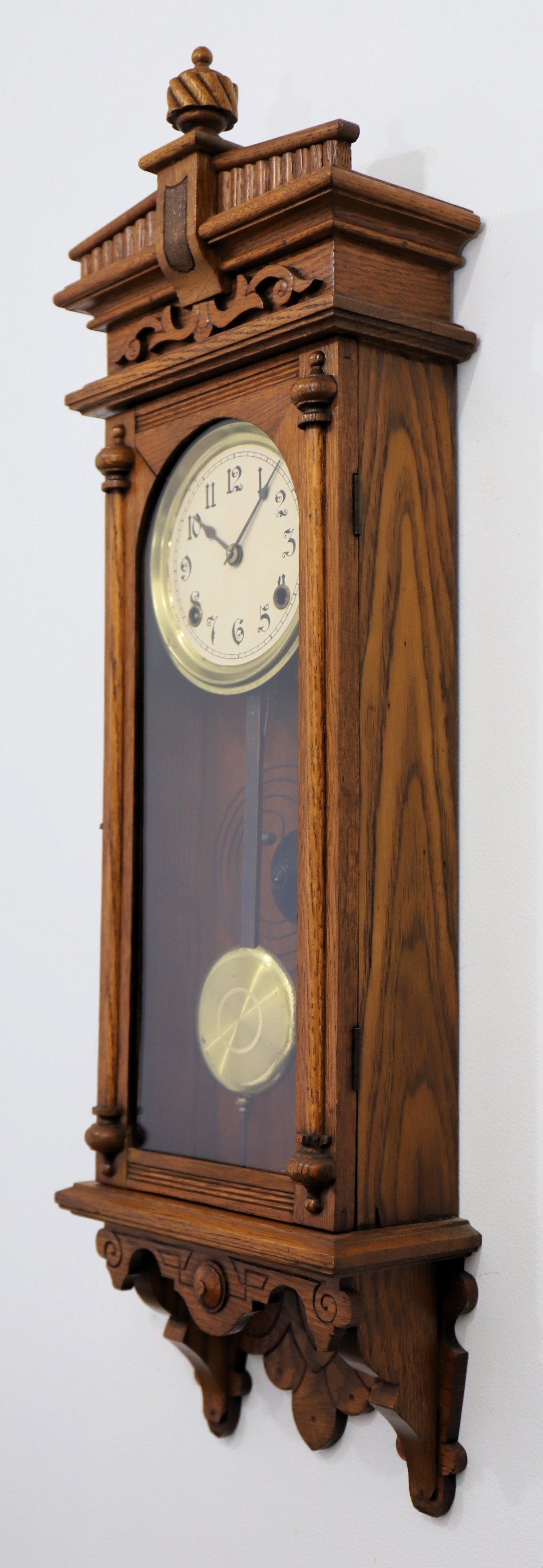 1893. A small hanging clock from Waterbury, just 32.5-inches long in an oak case with an old clean finish. The door