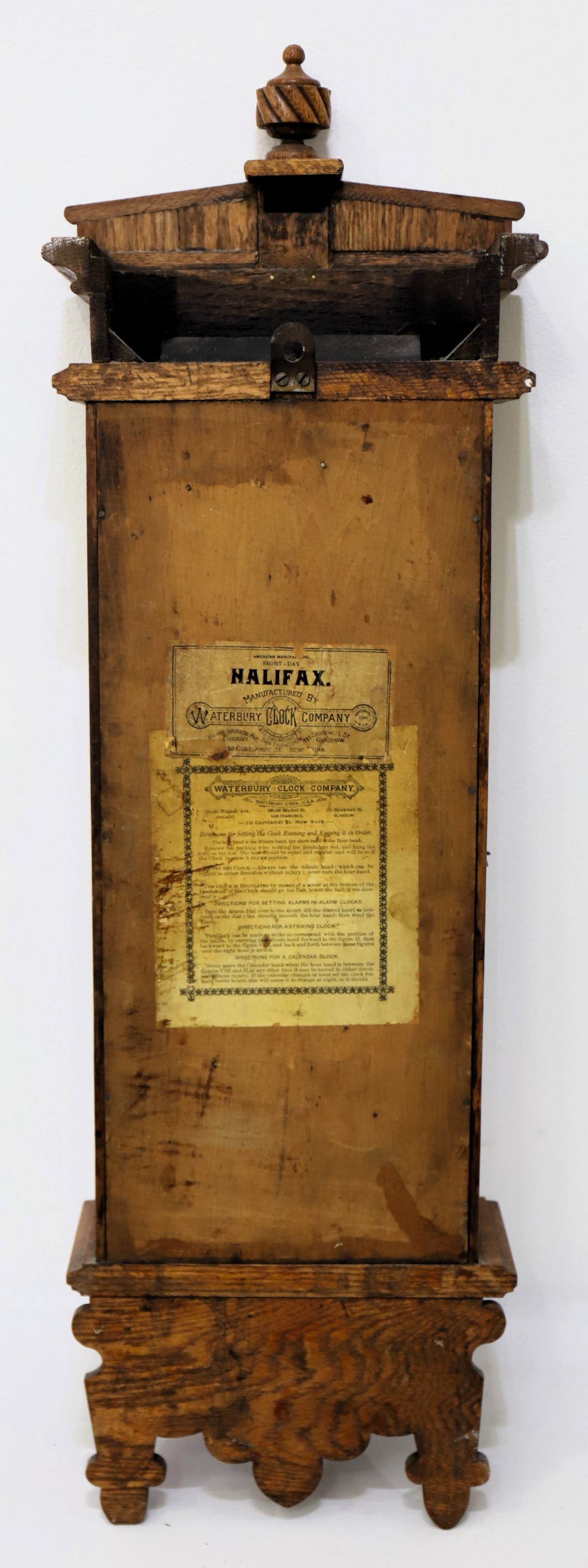 on hours and half-hours on a wire gong. The pendulum and bob are Waterbury issue. There are two good labels