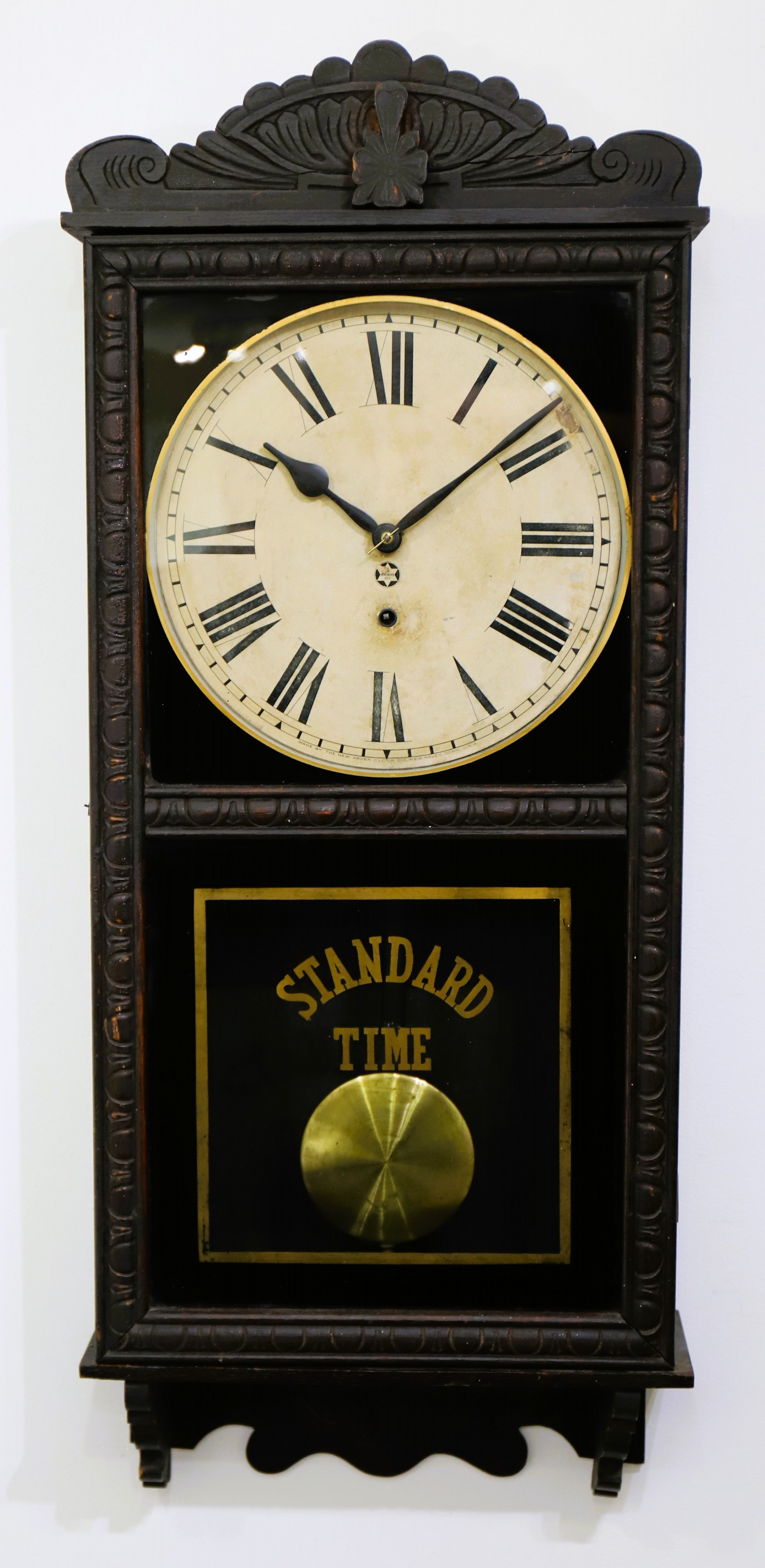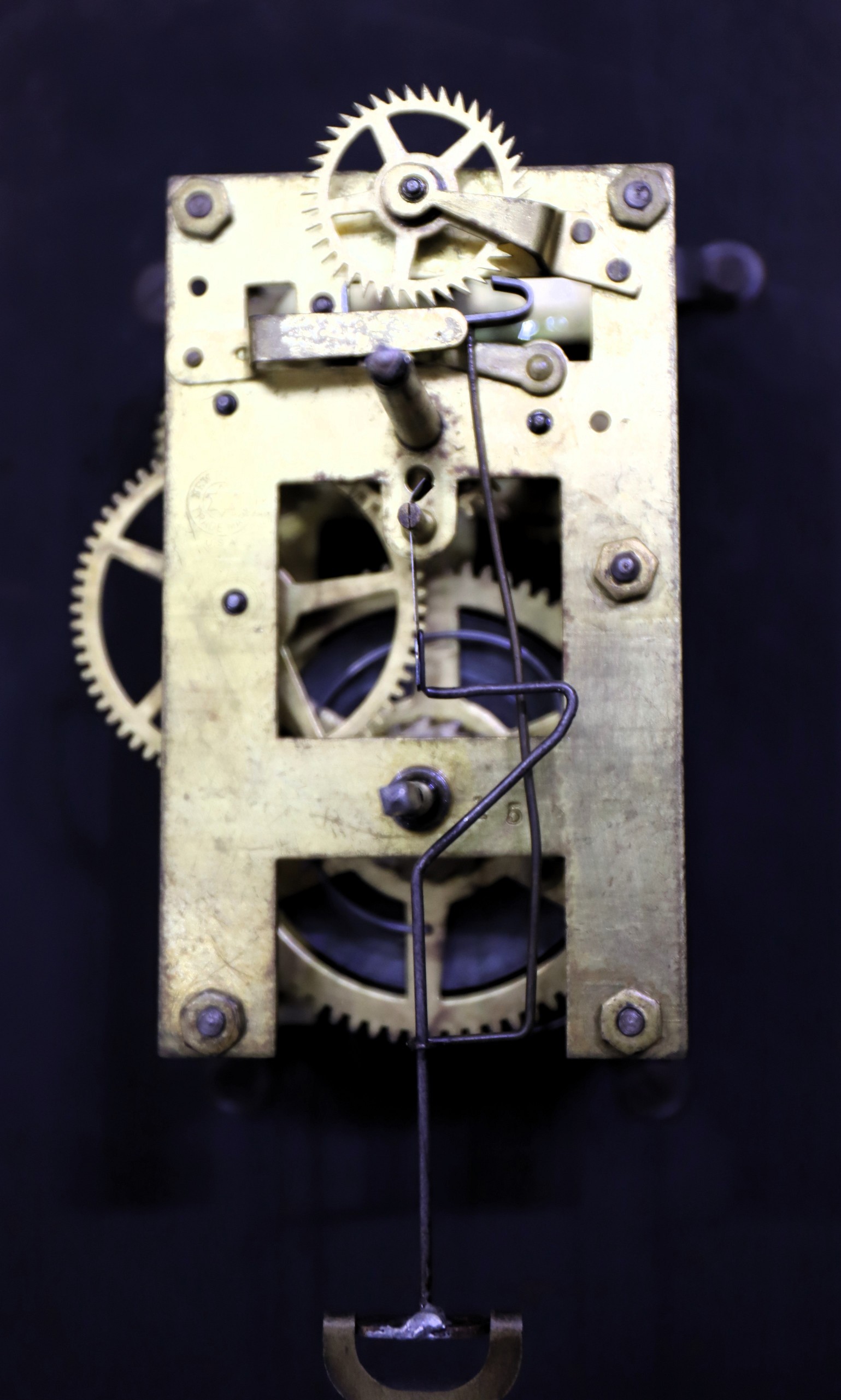 Haven logo and is probably original, as are the hands. The 8-day, time-only movement is signed and running with a proper pendulum. A partial label on the back. Everything original, you gotta like that. $100–$200.