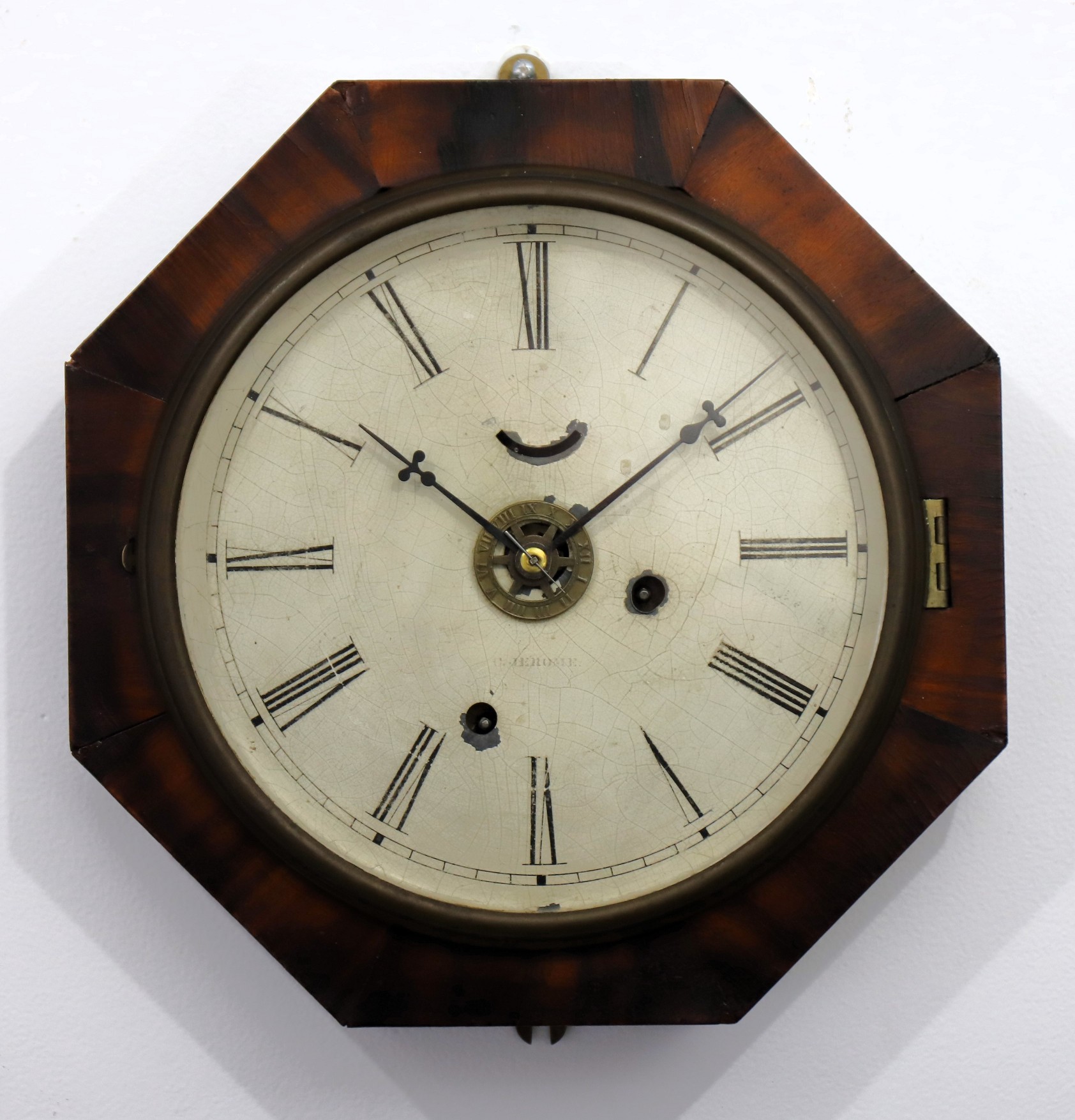 Chauncey Jerome “Wood Lever” 8-inch with alarm,ca. 1886. A 12-inch diameter octagonal case with rosewood veneer; note the missing strip on the upper left side. The dial