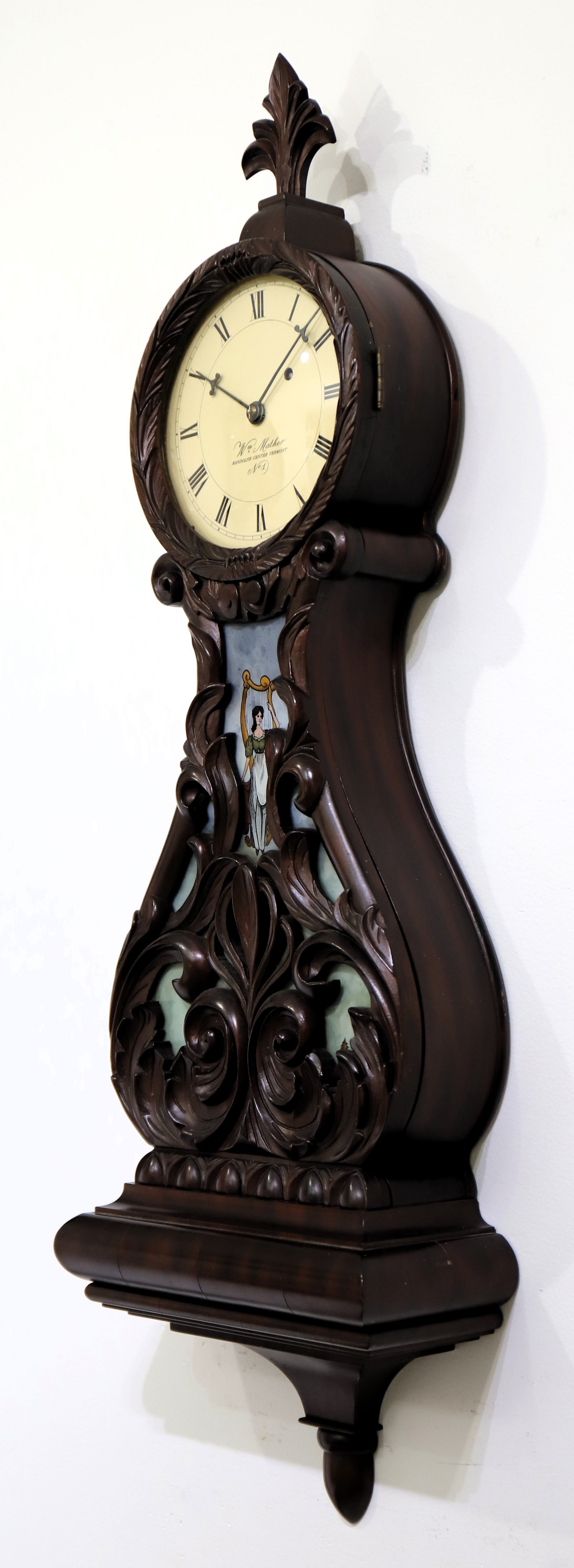 the dial, case, and front. The case is 36 inches long in solid mahogany with a carved fleur-de-lis finial, a convex glass and