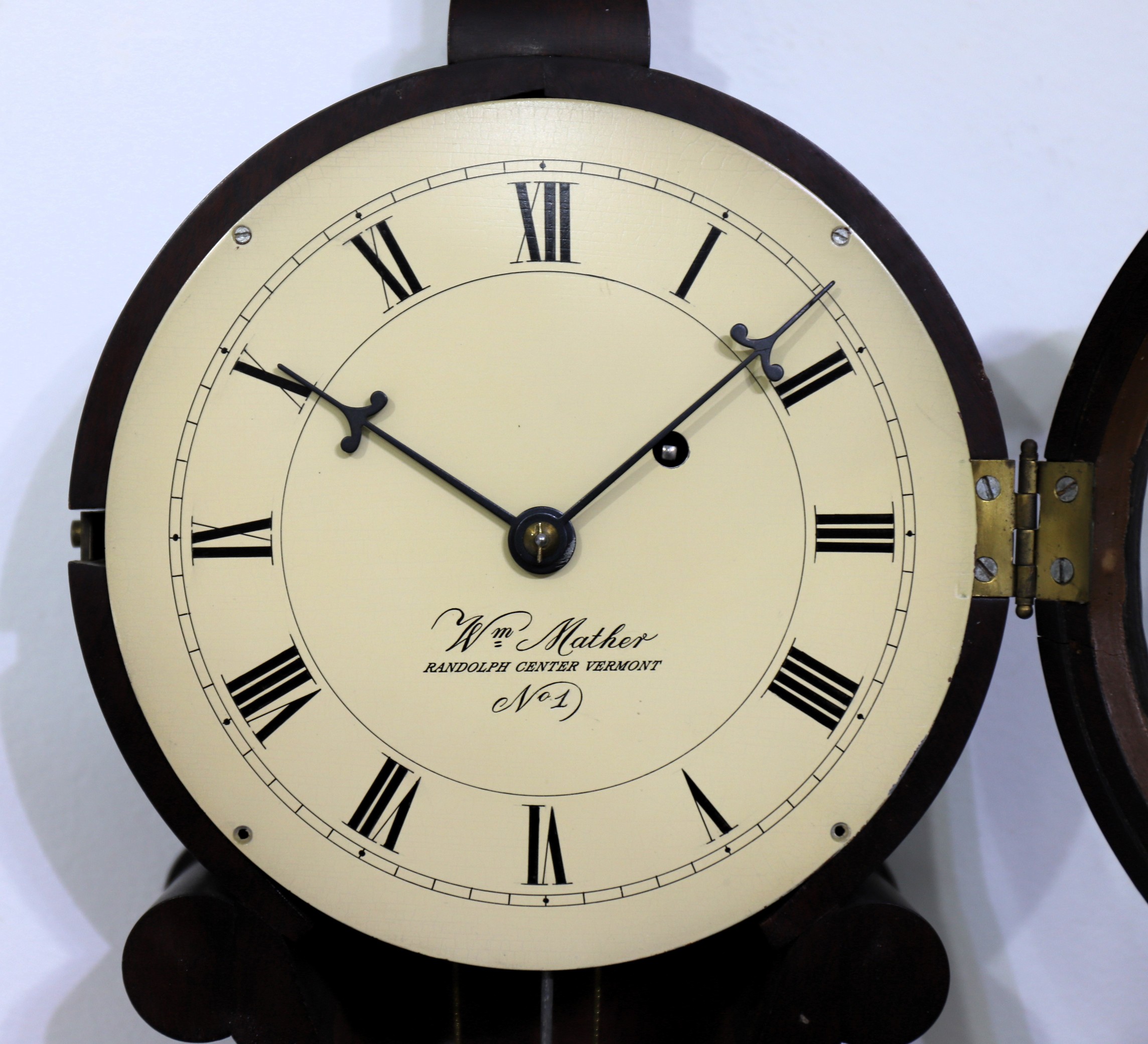 Foster Campos lyre banjo, ca. 1980? Campos made this clock specifically for William Mather in Vermont, a noted clock collector and dealer. It is marked No. 1 on