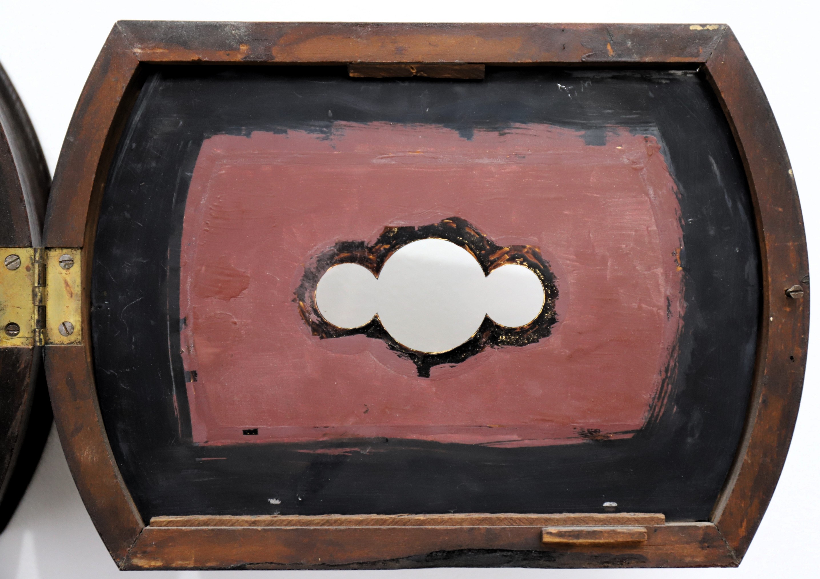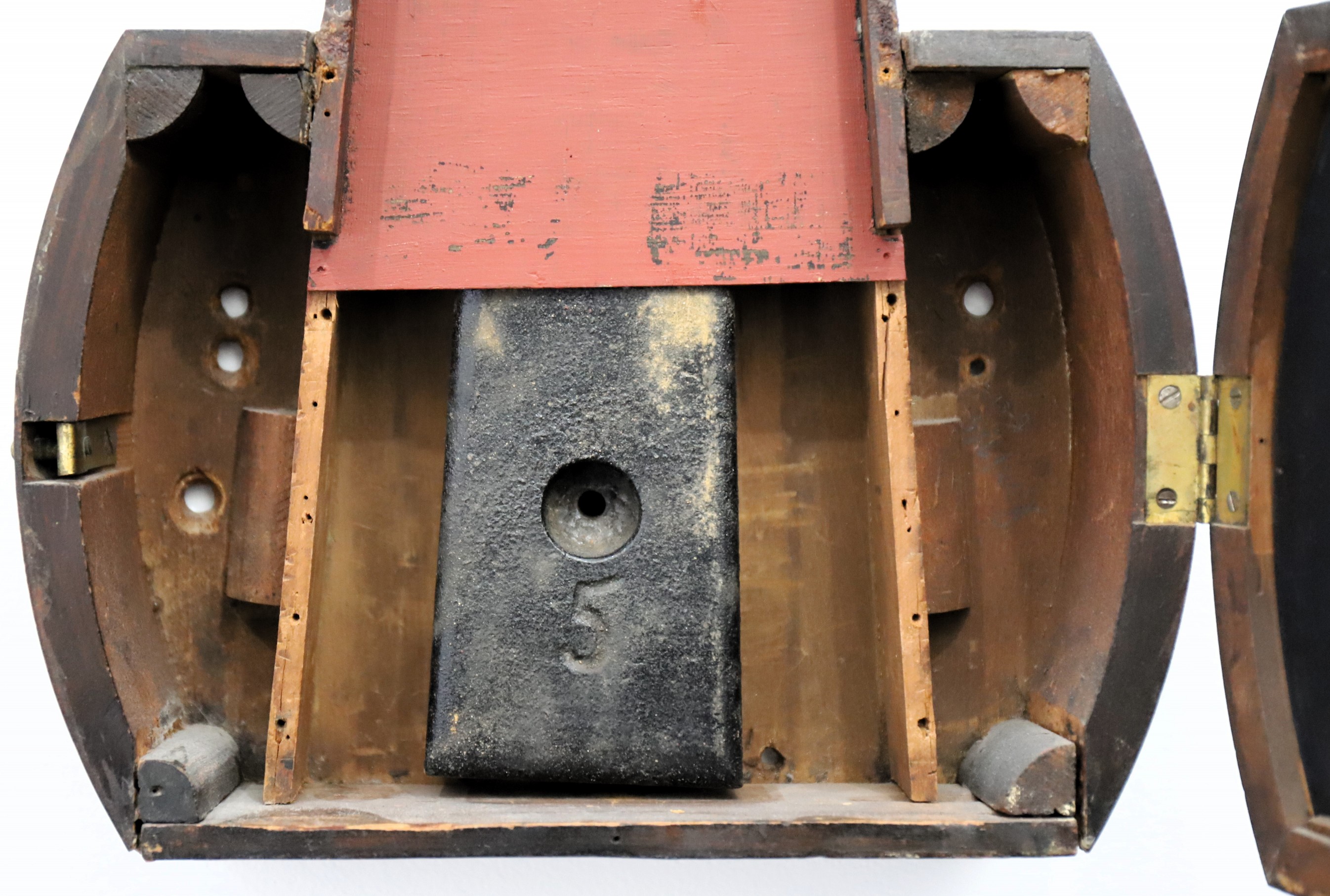 8-day,time-only movement is signed and running without issue; there is a proper No. 5 cast iron weight, wooden weight shields painted