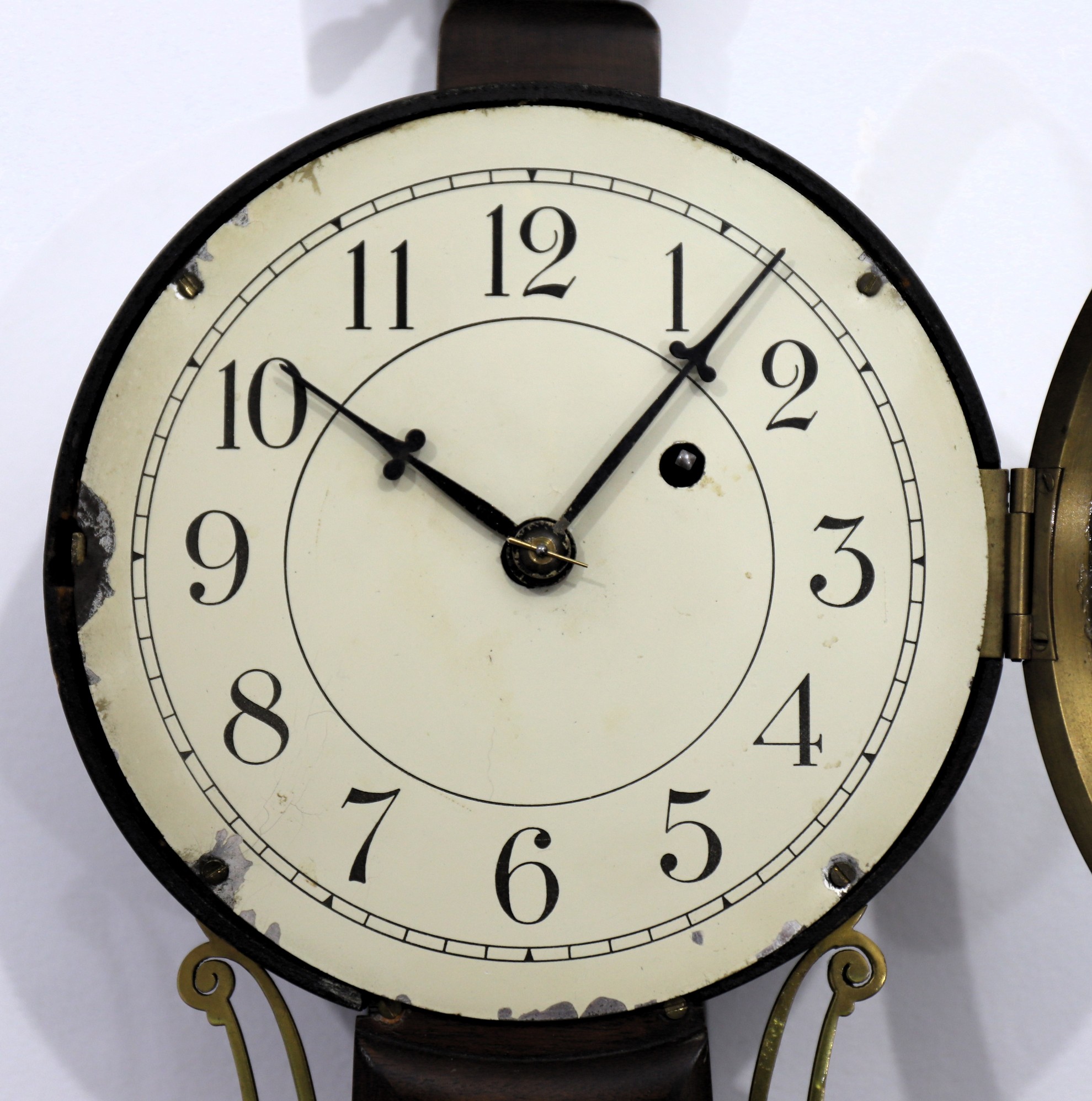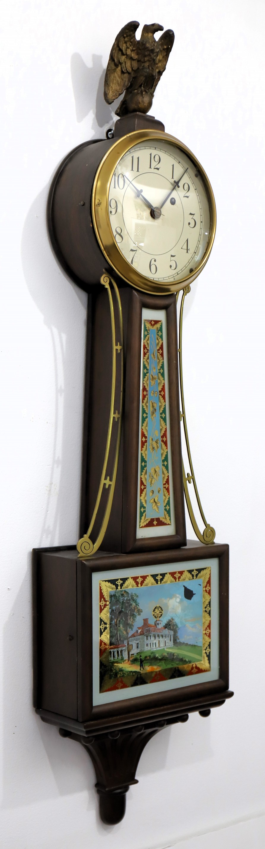 Herschede Clock Co. weight-driven banjo, ca. 1921. A 42-inch mahogany-cased banjo timepiece (including the gilded gesso eagle finial) with Mount Vernon glasses. Note the missing