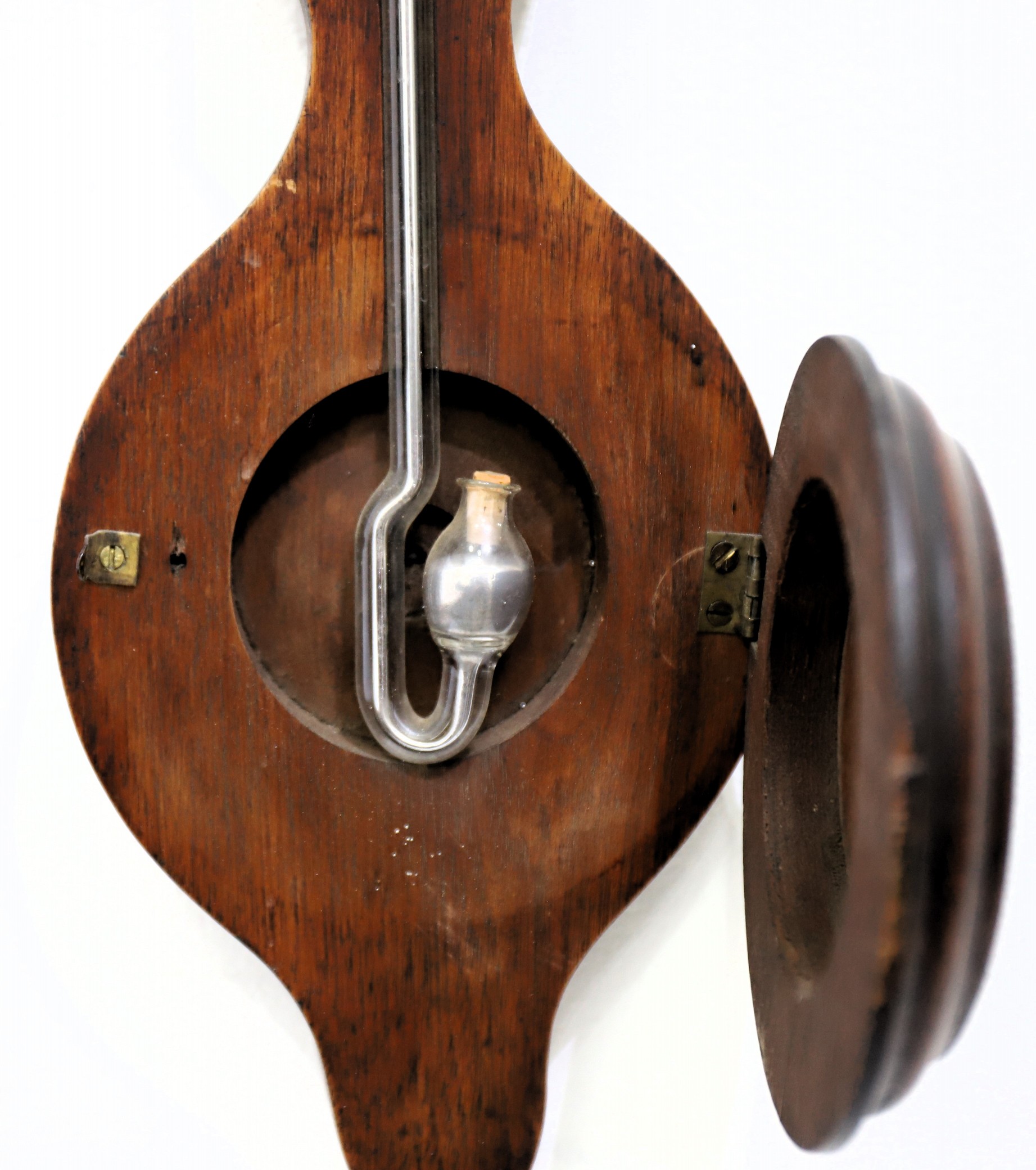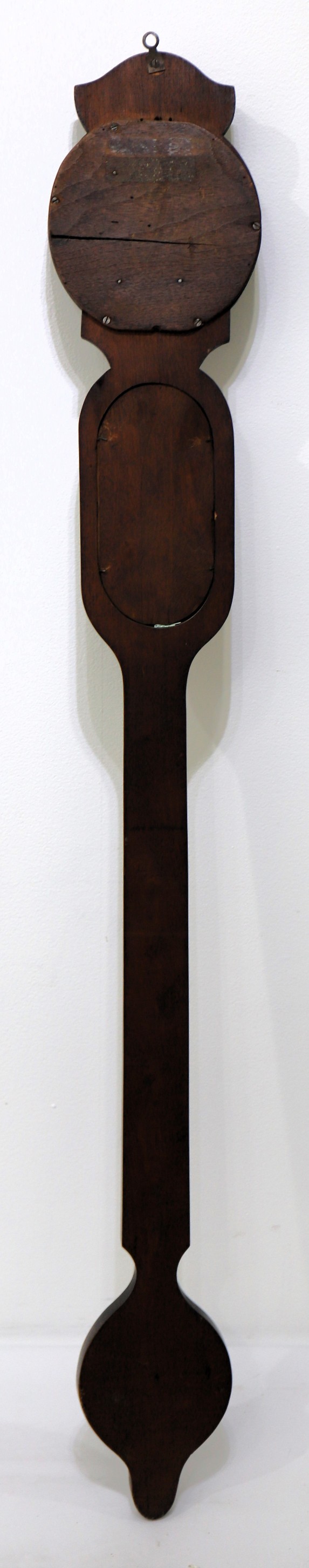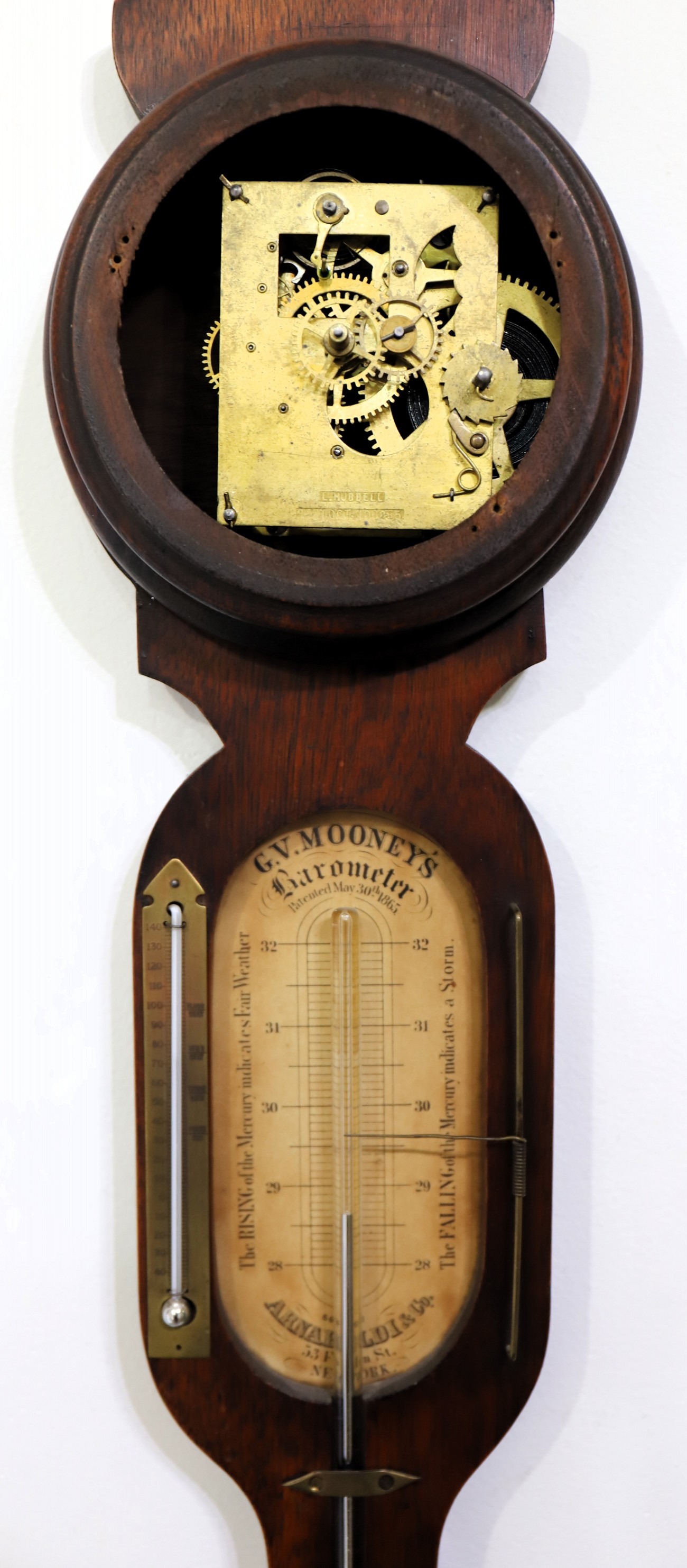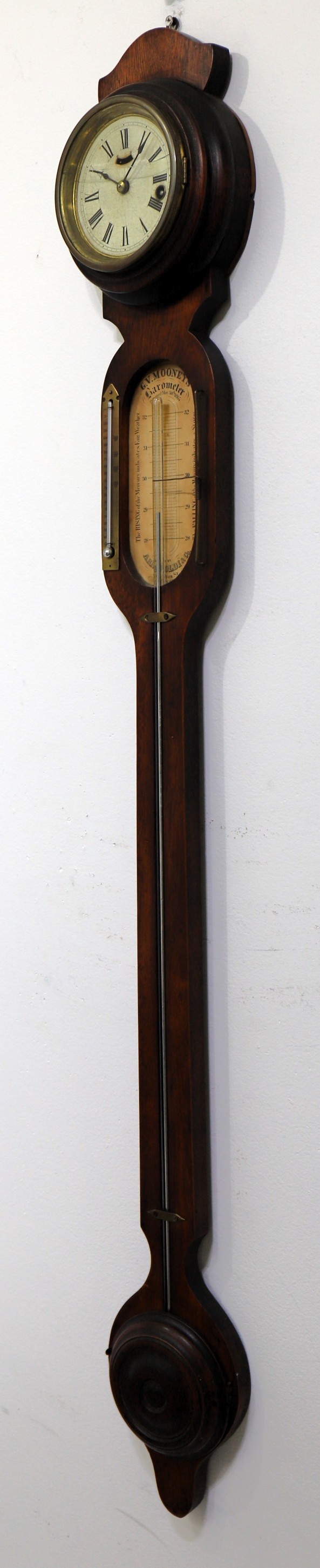 J. V. Mooney barometer and timepiece,ca. 1865. A 48-inch walnut base with and old finish and patina. The one-day lever-movement timepiece was made by L Hubbell and is dated 1865; it will run briefly and is oily. The dial is paper, the hands period, and the modern dial glass is cracked. The paper scale for the mercury barometer is likely original and indicates that the apparatus was retailed by Arnaboldi & Co in New York City; it is also dated 1865. My consignor states that the thermometer tube (upper left) has been replaced. I can find only one other sale of this model, in 2014 at Fontaine’s for $325. $250–$400.