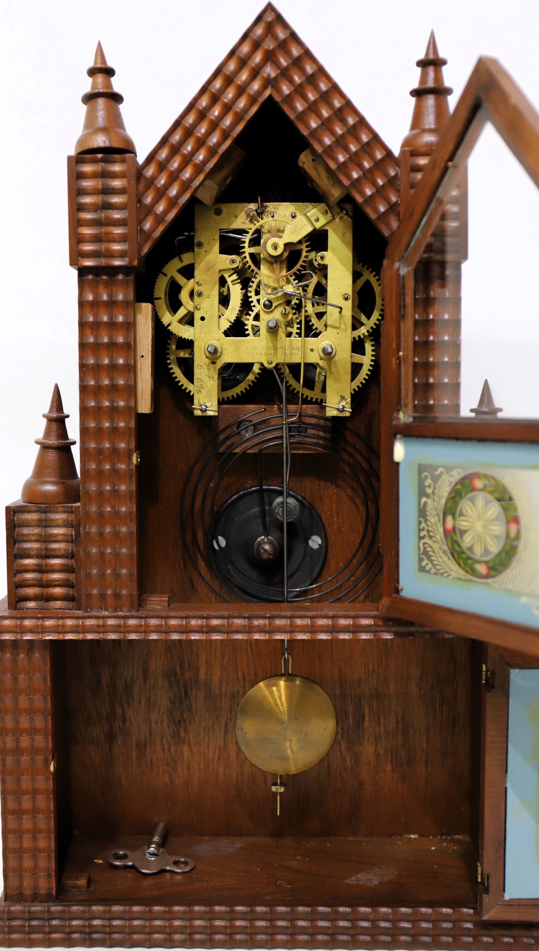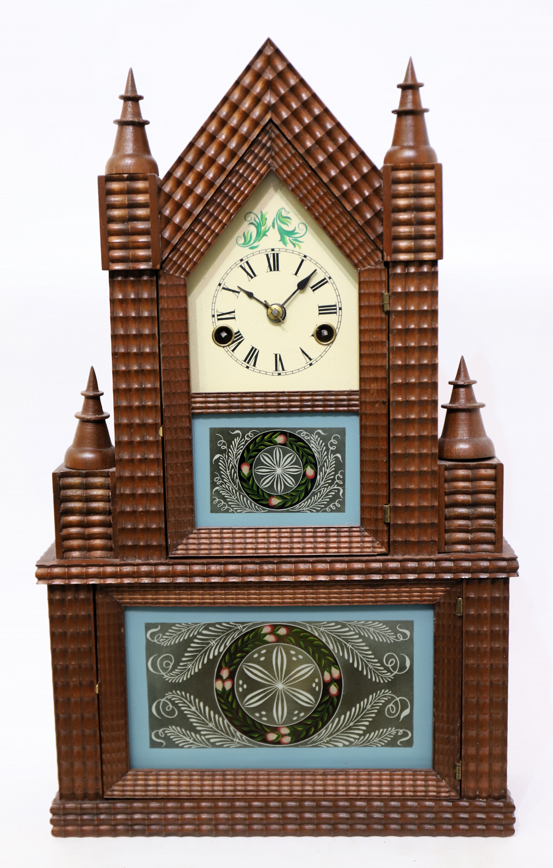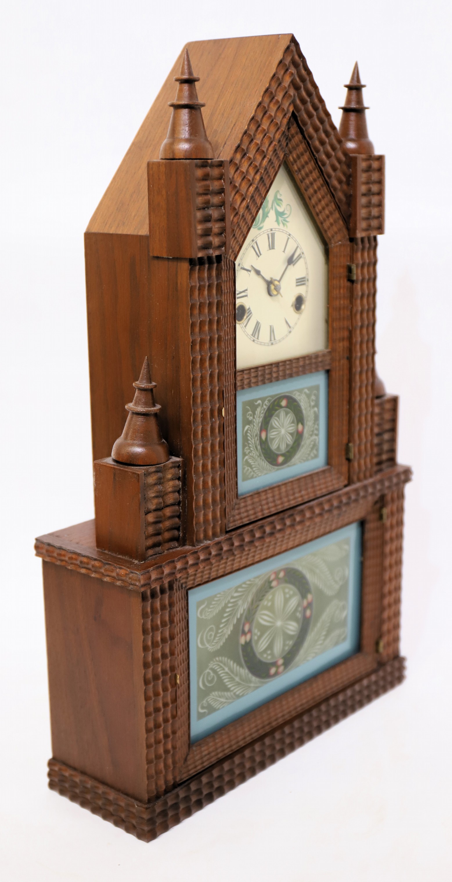 walnut case is 17 inches tall with ripple trim on the front and four ringed, cone finials. Both glasses were painted by Tom