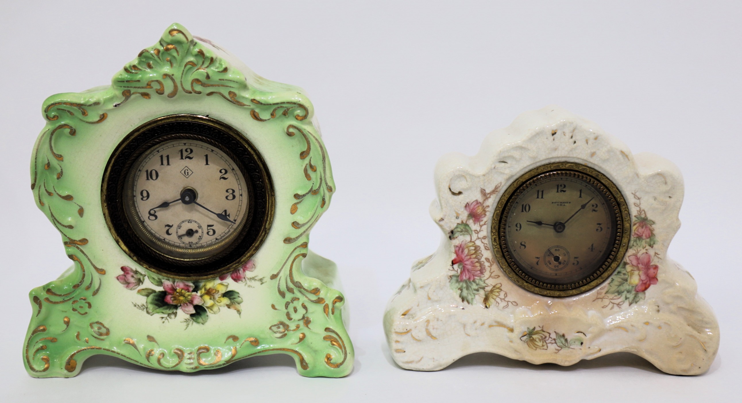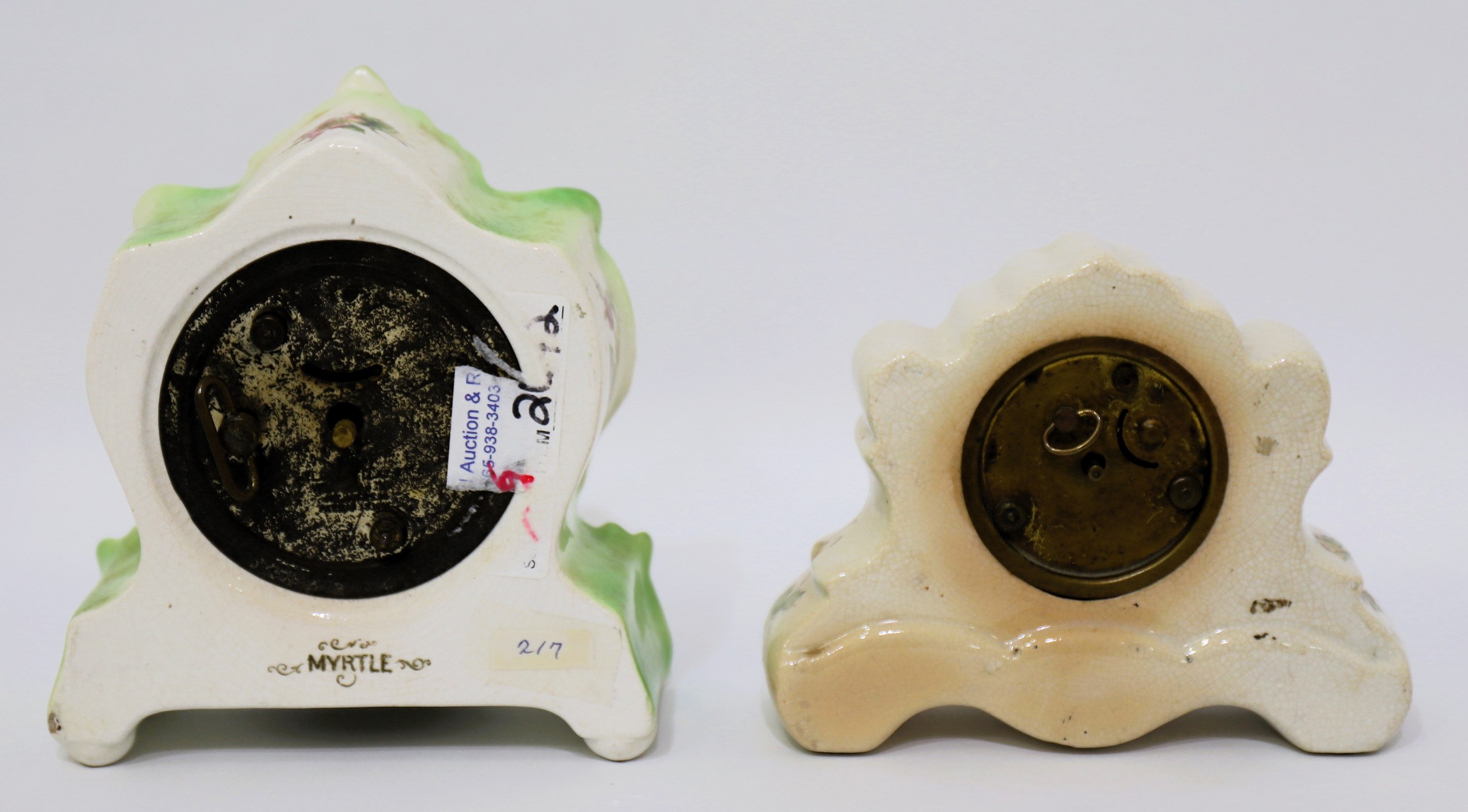 inches tall; the first two are German, second two are Gilbert Clock Co. (Myrtle) and New Haven Clock Co. The second German clock