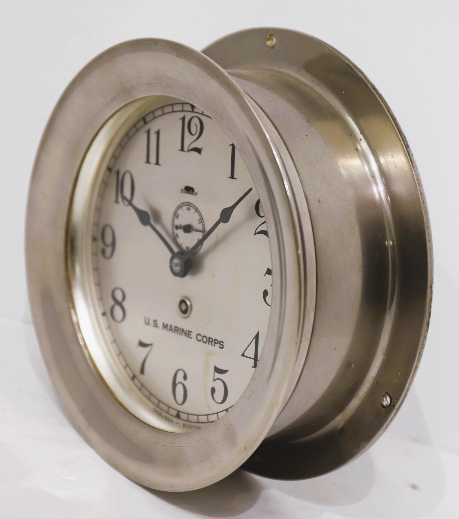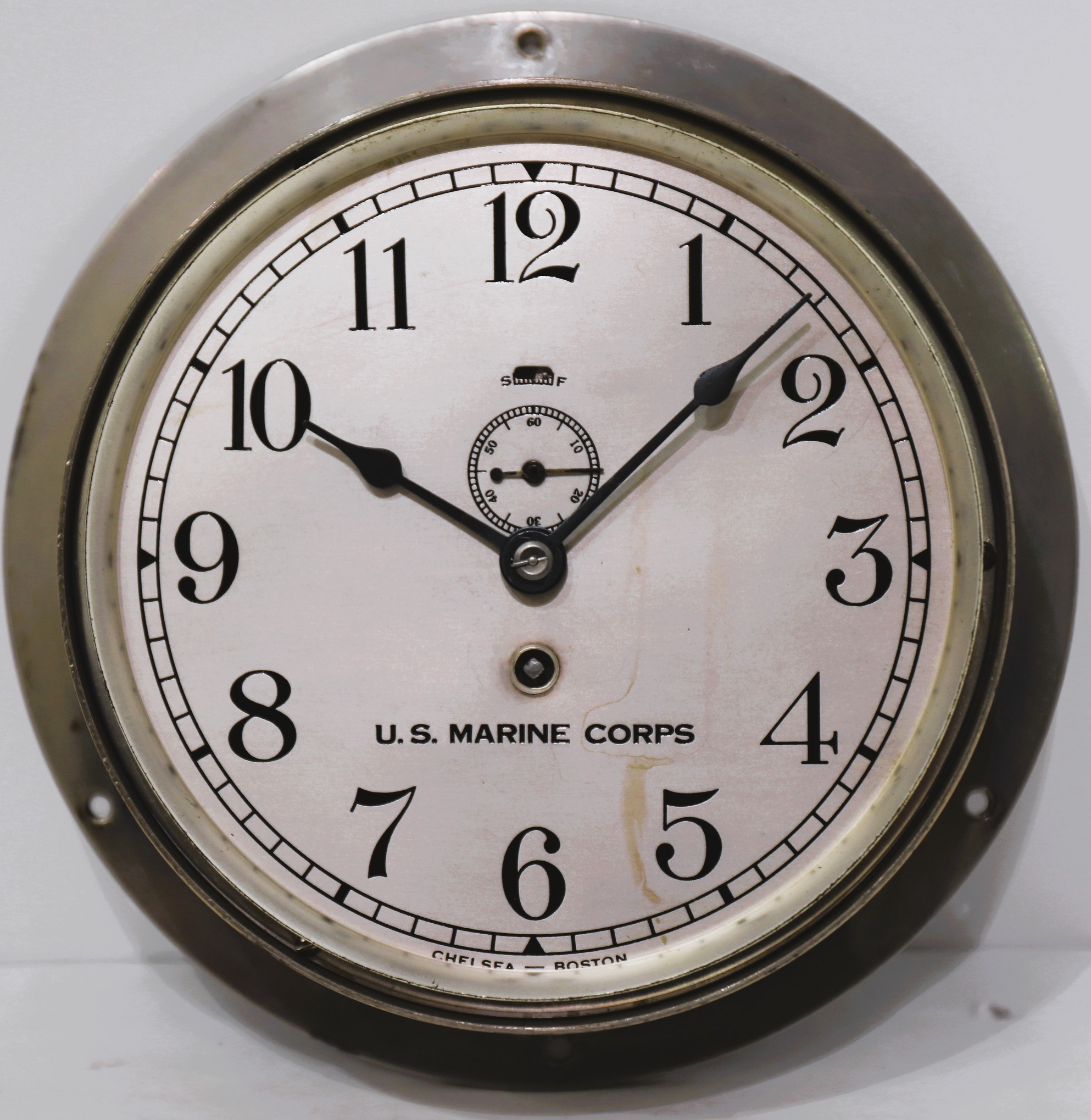 Chelsea Clock Co. “Marine (non-striking) Clock”, ca. 1923. This appears to be Catalog No. 141, with a 6-inch dial and a 7 11/6-inch back flange. The bezel screws on and it is time-only. The case is nickel in clean condition, the hands are not as shown in catalog illustrations, but are used in other Chelsea clocks. The silvered dial shows some light staining and is marked U.S. Marine Corps, with Chelsea Boston at the bottom. It is running. I did not remove the dial. The serial number on the back is 259180. One in poorer condition sold in 2022 for $375. $250–$400.